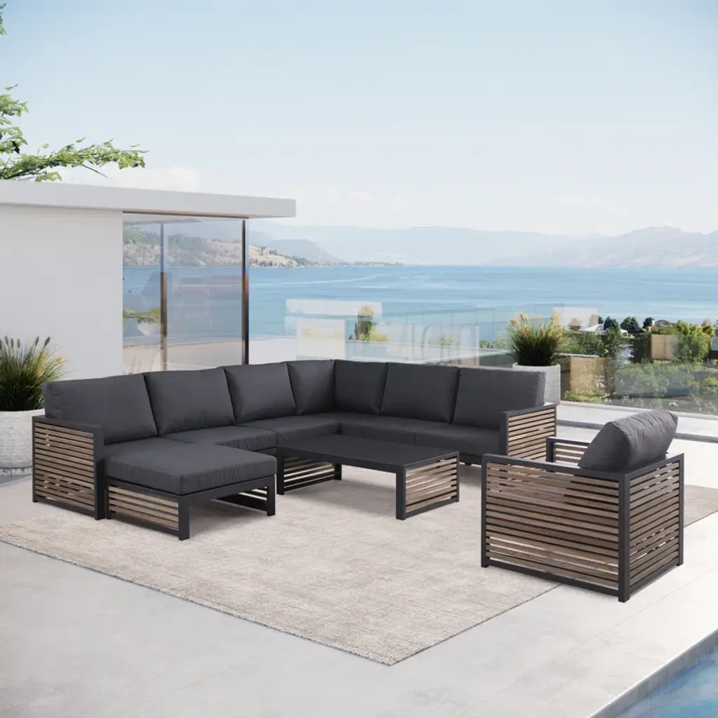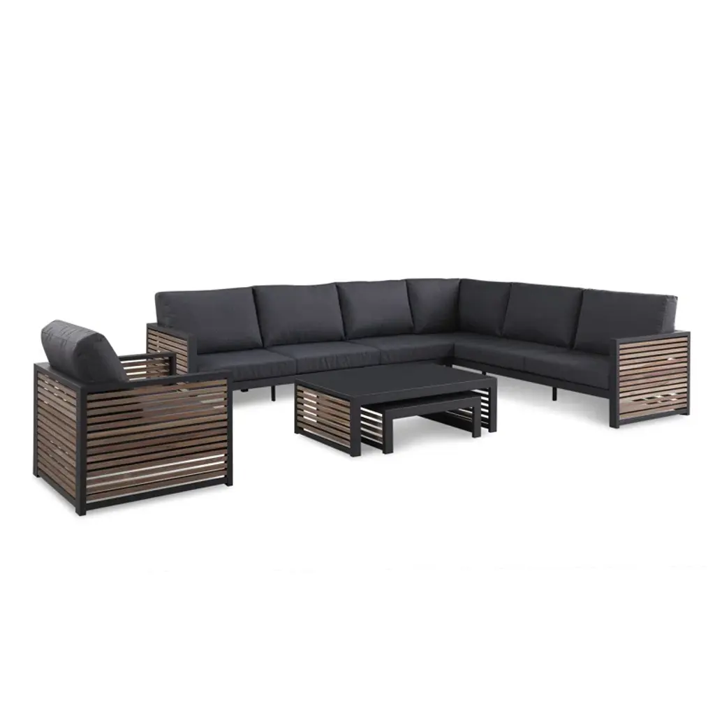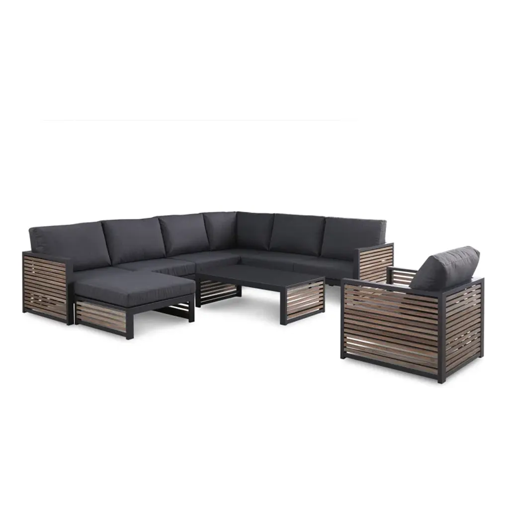 Enjoy in style with the Bellagio Cadora corner lounge set 5-piece Complement your garden or terrace with this high-quality lounge garden bench from the Bellagio brand. This spacious corner lounge set 5-piece can accommodate all your guests and provides a luxurious look in your outdoor space. The combination of colors and materials makes this corner lounge set a real eye-catcher. This garden bench has an open look thanks to the horizontal application of teak. It can be perfectly combined with the other garden furniture from the Cadora collection. Properties The Bellagio Cadora lounge garden bench is made of powder-coated aluminum in the color charcoal. Aluminum is relatively light, weather-resistant, strong, and requires little maintenance. The powder coating gives the paint layer better protection. The frame is finished with an inlay of teak wood that has been treated with an old teak grey wash. This gives the teak a grey finish. Due to the weather influences, the greywash will eventually disappear and the teak will get its gray color. The garden bench comes with comfortable lounge cushions. Maintenance Maintaining the frame of your Bellagio Cadora lounge garden bench arm is simple. The powder-coated aluminum provides additional protection for the paint layer. The powder coating also ensures that dirt and dust cannot adhere properly to the garden bench. When the garden bench needs to be cleaned, you can do this with lukewarm water, green soap, and a microfiber cloth. When cleaning, avoid using a pressure washer or harsh detergents. These can cause the aluminum to be damaged. We recommend storing the garden bench indoors in winter. If this is not possible, you can leave the garden bench outside uncovered. To extend the life of your garden bench, it is important to maintain the teak wood properly. Maintaining teak wood is easy. Our advice is to clean the garden bench inlay well twice a year. Avoid using a high-pressure cleaner or aggressive cleaning agents, as these can damage the teak. Before cleaning the inlay with teak, first, wet it well so that the pores of the teak wood are open. Next, use a coarse brush and a bucket of lukewarm water mixed with a cup of table salt or soda. Scrub lengthwise from the wood grain and then rinse the inlay well with water. The lounge cushions can withstand a splash of rainwater. In case of a heavy shower, we recommend placing the cushions inside. When the cushions are not in use, we advise you to place the cushions inside. The cushion covers are detachable. The cushion covers have a care label. For best results, we recommend that you follow the care label.