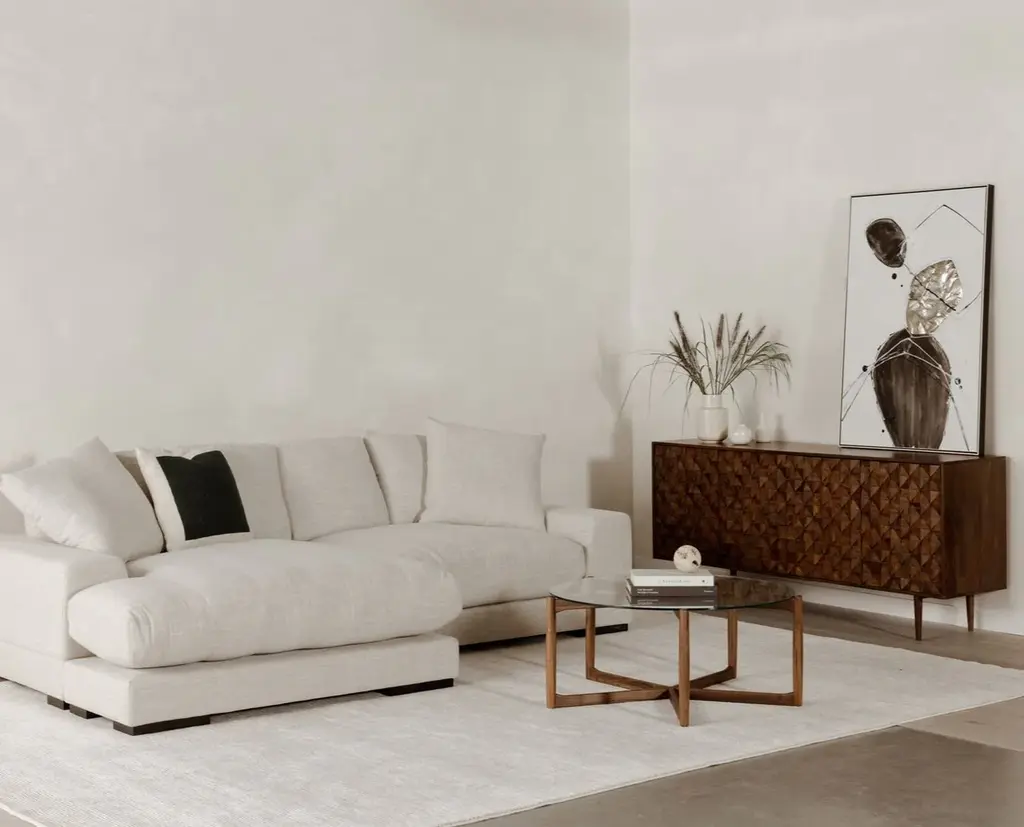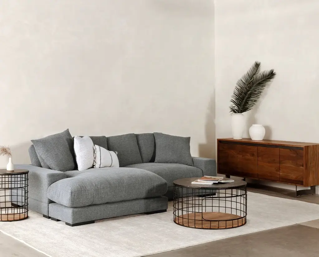 A fusion of comfort and elegance with clean lines and plush cushions, the Plunge sectional is masterfully crafted to maximize space and provide unparalleled relaxation. Its versatile flip chaise feature allows a left or right-side orientation that effortlessly adapts to create a sanctuary of style and repose, while its improved channeling and filling distribution ensures soft landings and comfort for years to come.