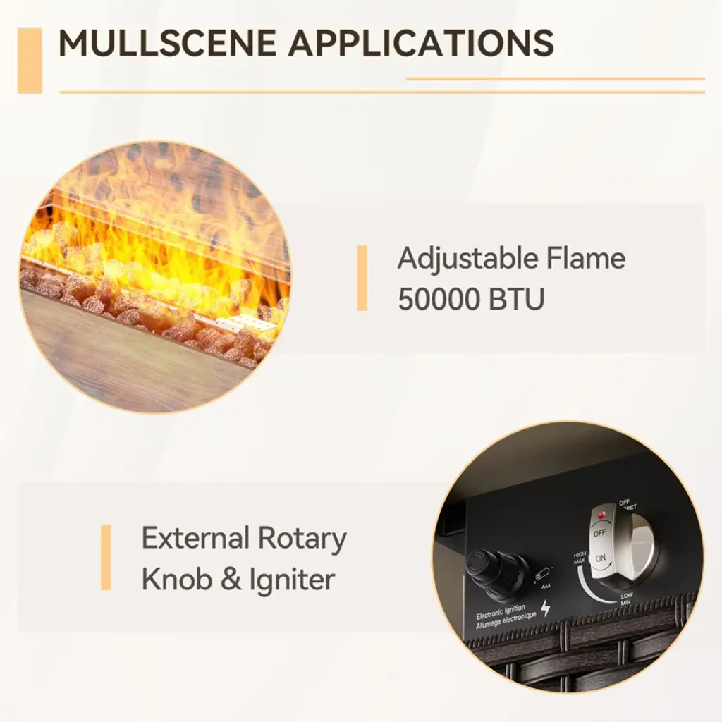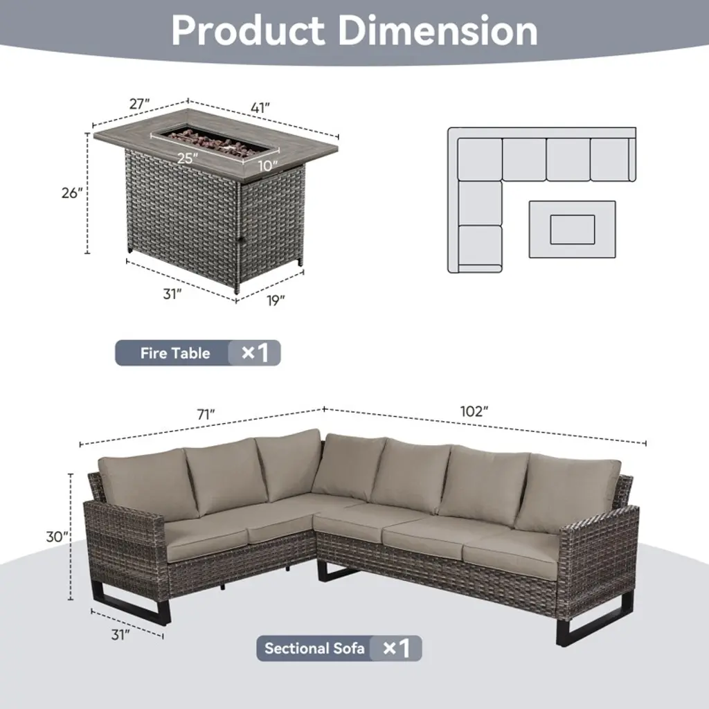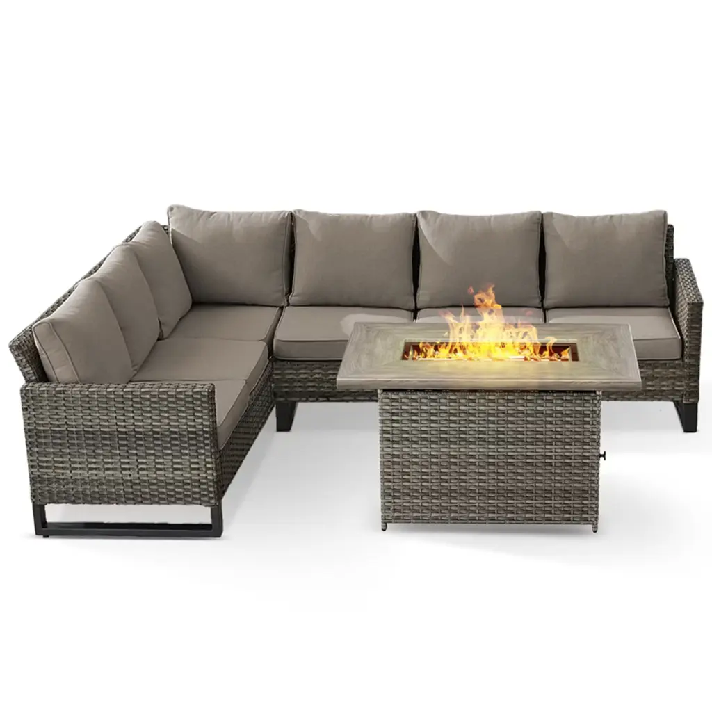 Introducing the POCASSY Outdoor Sectional Sofa Set with Fire Pit Table! Perfect for those backyard hangouts, this set features an L-shaped Sectional Sofa and a spacious 41-inch rectangle 50000BTU propane fire pit table. Built with a sturdy powder-coated steel frame and wrapped in stylish handwoven PE wicker, it!-s as tough as it is good-looking. The fire pit table comes with a handy lid, so you can stay toasty during chilly winter nights and effortlessly flip it into a table for summer. Whether you!-re roasting marshmallows or sipping drinks with friends, this sectional patio furniture set is the ultimate outdoor upgrade for any American home.