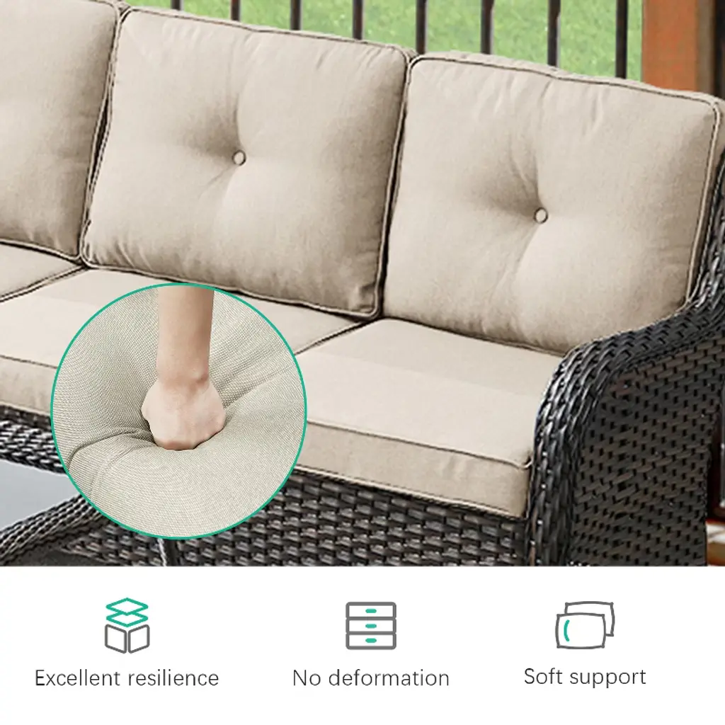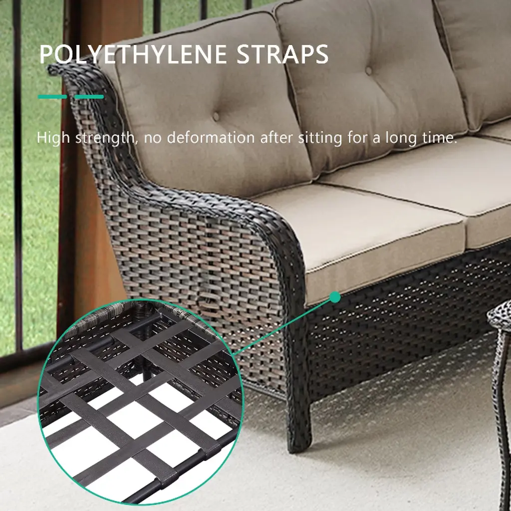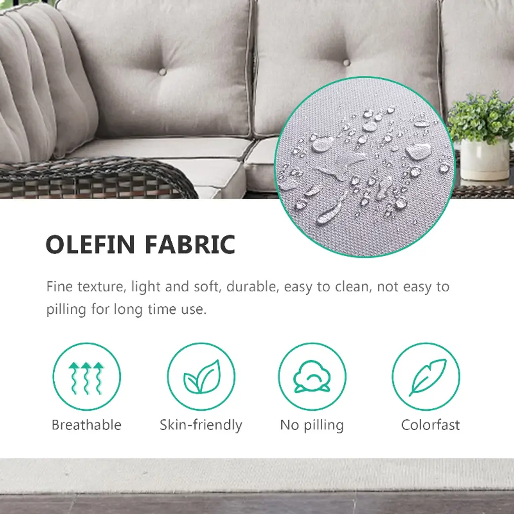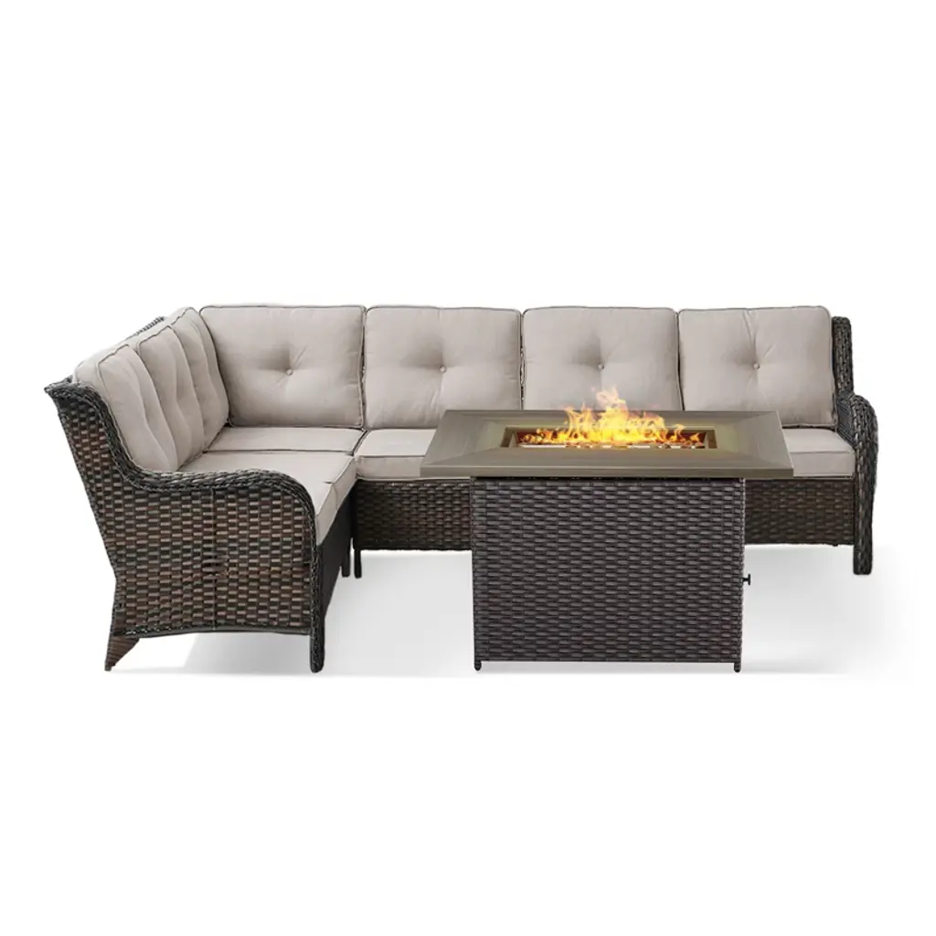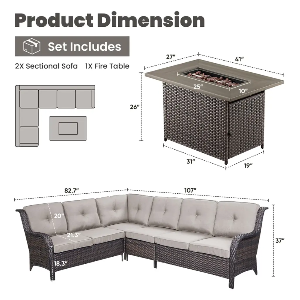 Introducing the POCASSY Outdoor Sectional Sofa Set with Fire Pit Table!athe perfect addition to your backyard get-togethers! This stylish patio furniture set with fire pit includes an L-shaped sectional sofa and a spacious 41" rectangular fire pit table that provides a 50,000 BTU propane flame for a warm ambiance. Made with a durable powder-coated steel frame and wrapped in sleek hand-woven PE wicker, it's as sturdy as it is beautiful. The fire pit table comes with a convenient cover so you can enjoy cozy evenings by the fire in the cooler months and easily convert it to a dining or coffee table in the warmer months. Whether you're gathering around the fire to keep warm or sharing a drink with friends, this furniture set is the ultimate upgrade for outdoor family entertainment and relaxation.