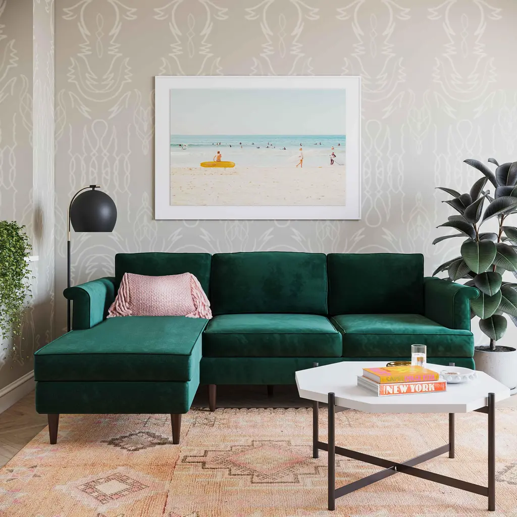 Mid-century modern is a classic design and the Porter sectional reinforces its allure. It offers timelessness and comfort with its removable cushions, sumptuous velvet upholstery, sturdy birch wood frame, and elegant rolled arms. This splendid sectional is available in grey or forest green options and either RAF or LAF configuration.
