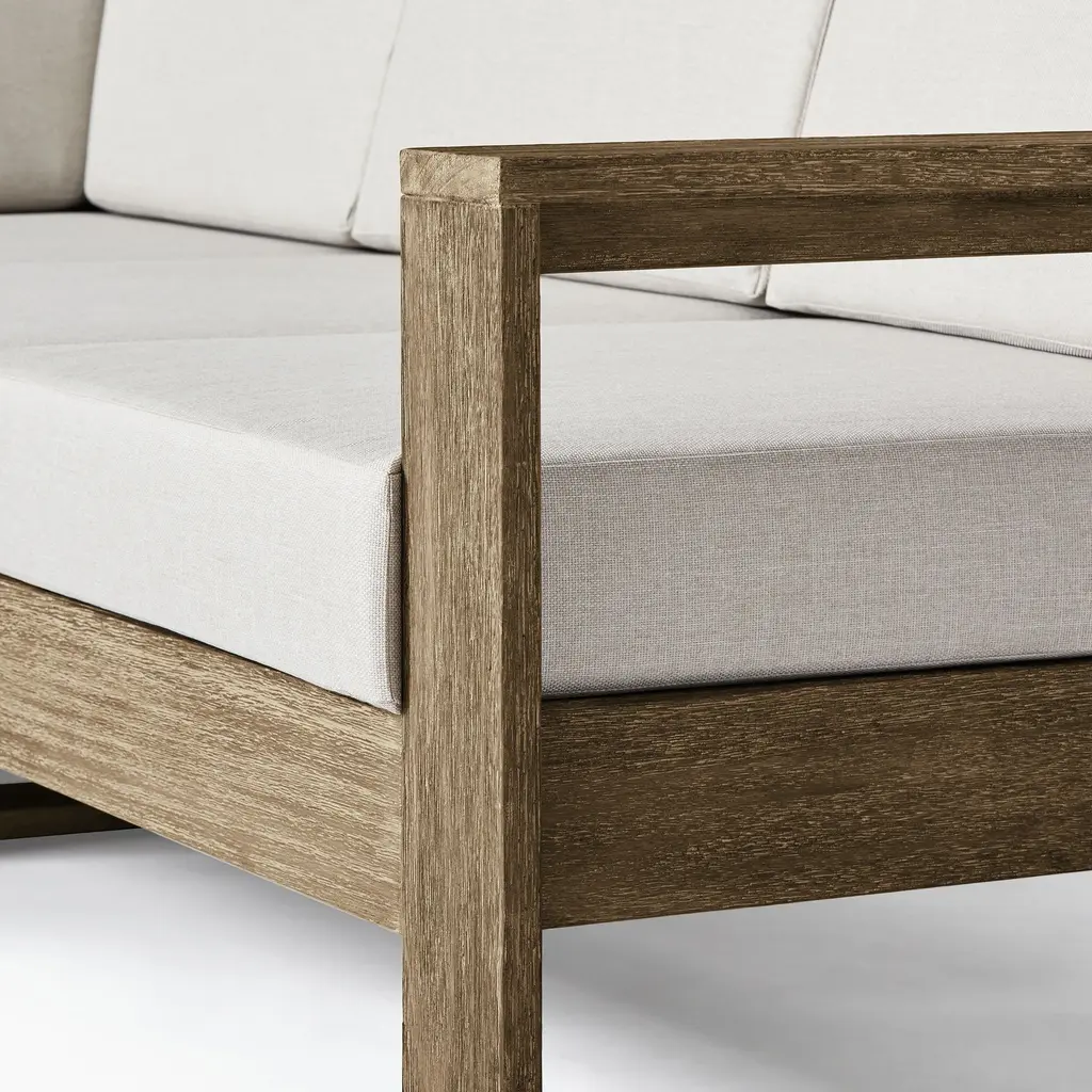 Rustic-meets-refined look with a weathered finish. Made from solid, sustainably sourced wood. Upgrade to high-performance, long-lasting Sunbrella® fabric. Makes the ultimate outdoor lounging spot.