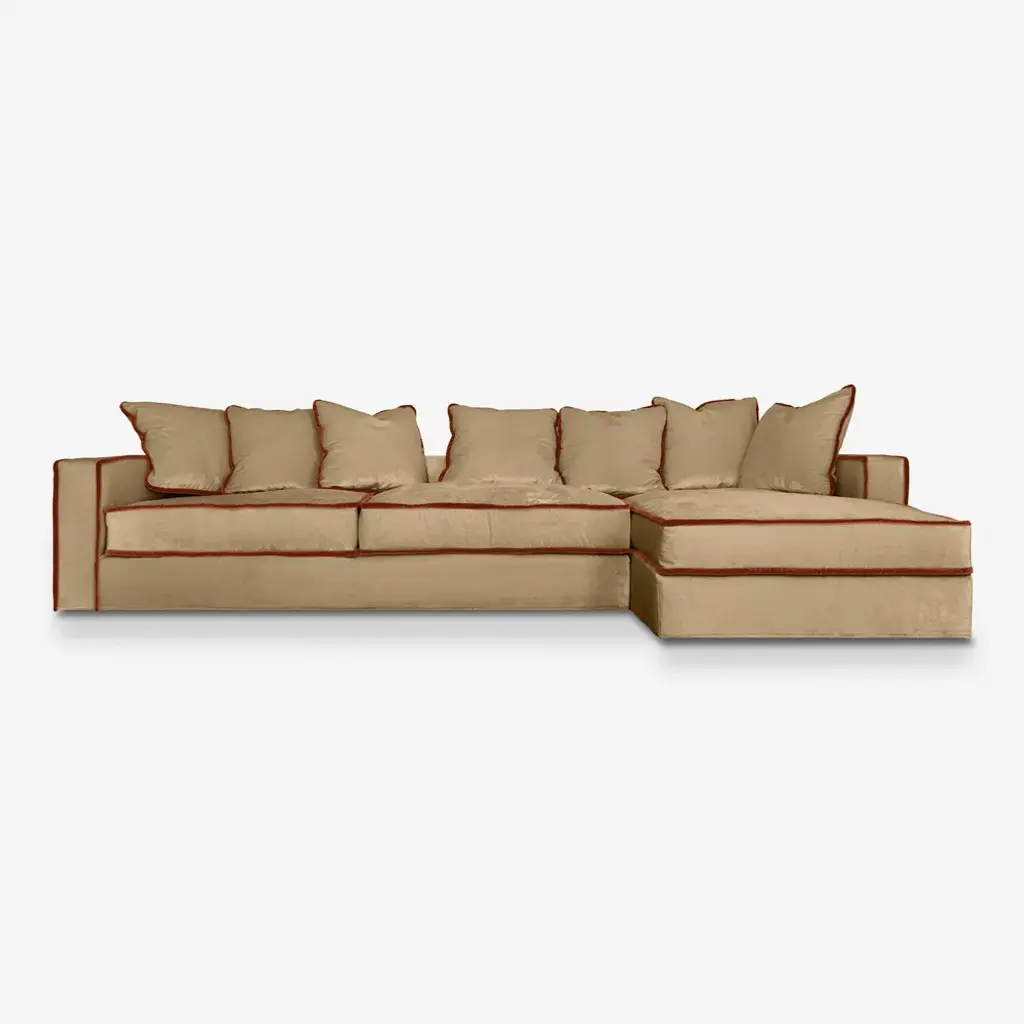 Rafaella Chaise Sofa In Camel Beige Velvet With Rusty Orange Trim From Biosofa