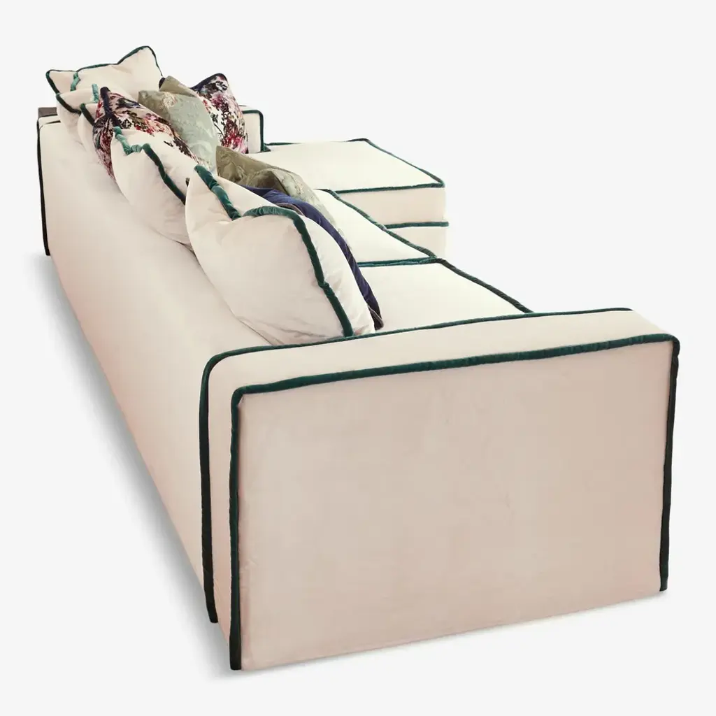 Indulge in luxury: rafaella chaise sofa - modern comfort redefined experience the epitome of sophistication with our rafaella chaise sofa. Immerse yourself in the smooth, ultra-comfortable embrace of deep seats and a wide chaise, making relaxation a true pleasure. This luxurious sofa boasts a modern twist on revival style with rafaella's angular profile, complemented by plush cushions offering both comfort and a charming contrast. perfect for evenings and long weekends, the chaise module enhances conviviality, providing extra seating for guests. Rafaella adds a delightfully cozy and chic touch to your home, with the continuous backrest and light, airy design visually expanding your living space. transform your living experience with rafaella – where smooth soft luxury meets contemporary elegance. materials internal frame: solid dried beech wood, jute belts with steel springs. padding: 100% natural latex, goose down layer, pressed cotton. finishing: choice of 100% natural fabrics (linen, cotton velvet, natural mixes), steel and cotton zippers, removable cover. production entirely handmade in our workshops in northern italy.