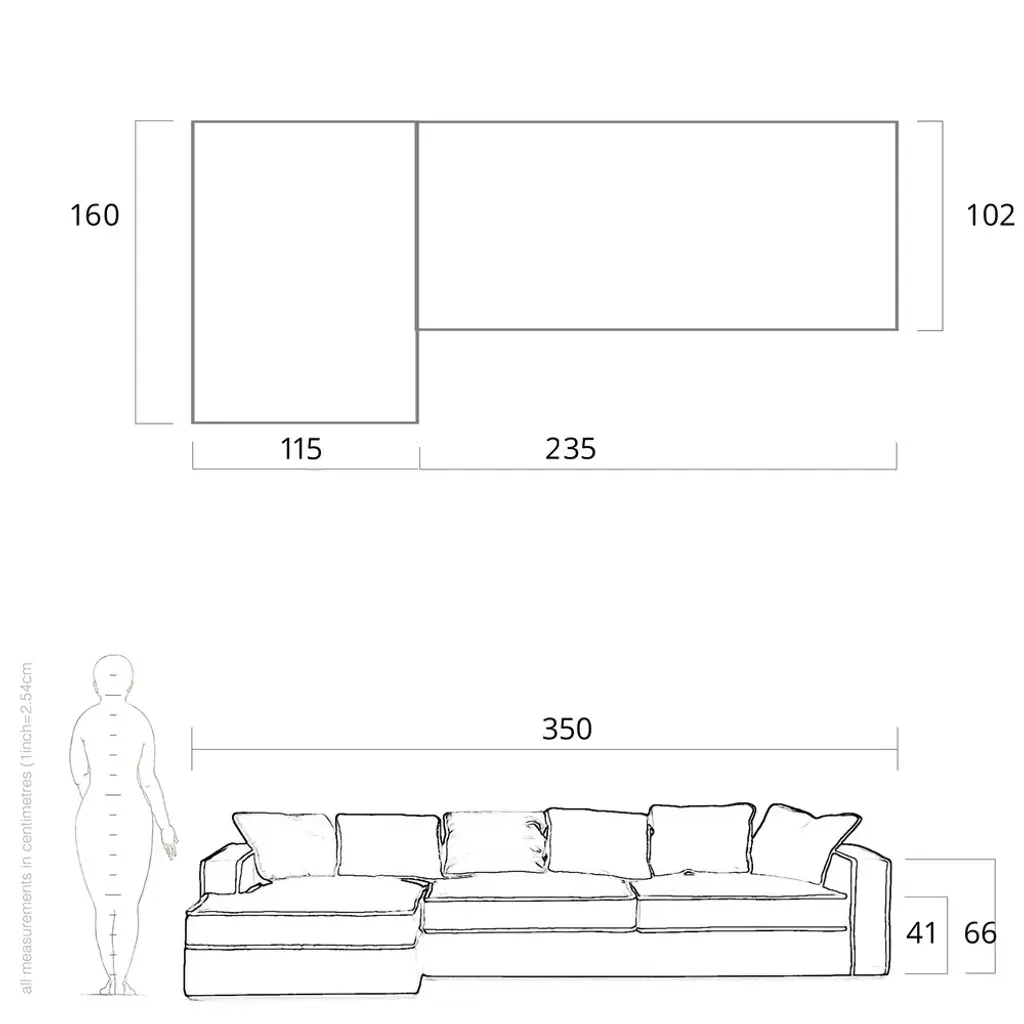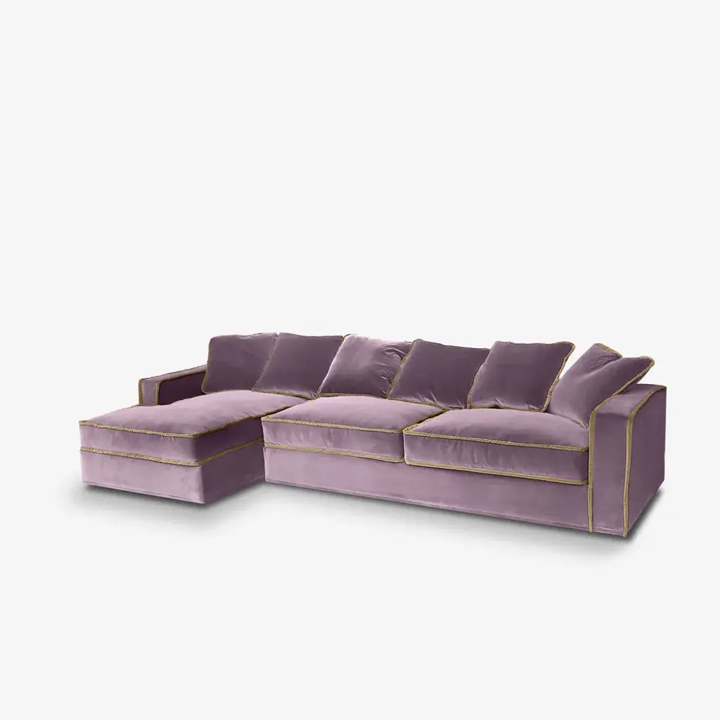 Indulge in luxury: rafaella chaise sofa - modern comfort redefined experience the epitome of sophistication with our rafaella chaise sofa. Immerse yourself in the smooth, ultra-comfortable embrace of deep seats and a wide chaise, making relaxation a true pleasure. This luxurious sofa boasts a modern twist on revival style with rafaella's angular profile, complemented by plush cushions offering both comfort and a charming contrast. perfect for evenings and long weekends, the chaise module enhances conviviality, providing extra seating for guests. Rafaella adds a delightfully cozy and chic touch to your home, with the continuous backrest and light, airy design visually expanding your living space. transform your living experience with rafaella – where smooth soft luxury meets contemporary elegance. materials internal frame: solid dried beech wood, jute belts with steel springs. padding: 100% natural latex, goose down layer, pressed cotton. finishing: choice of 100% natural fabrics (linen, cotton velvet, natural mixes), steel and cotton zippers, removable cover. production entirely handmade in our workshops in northern italy.