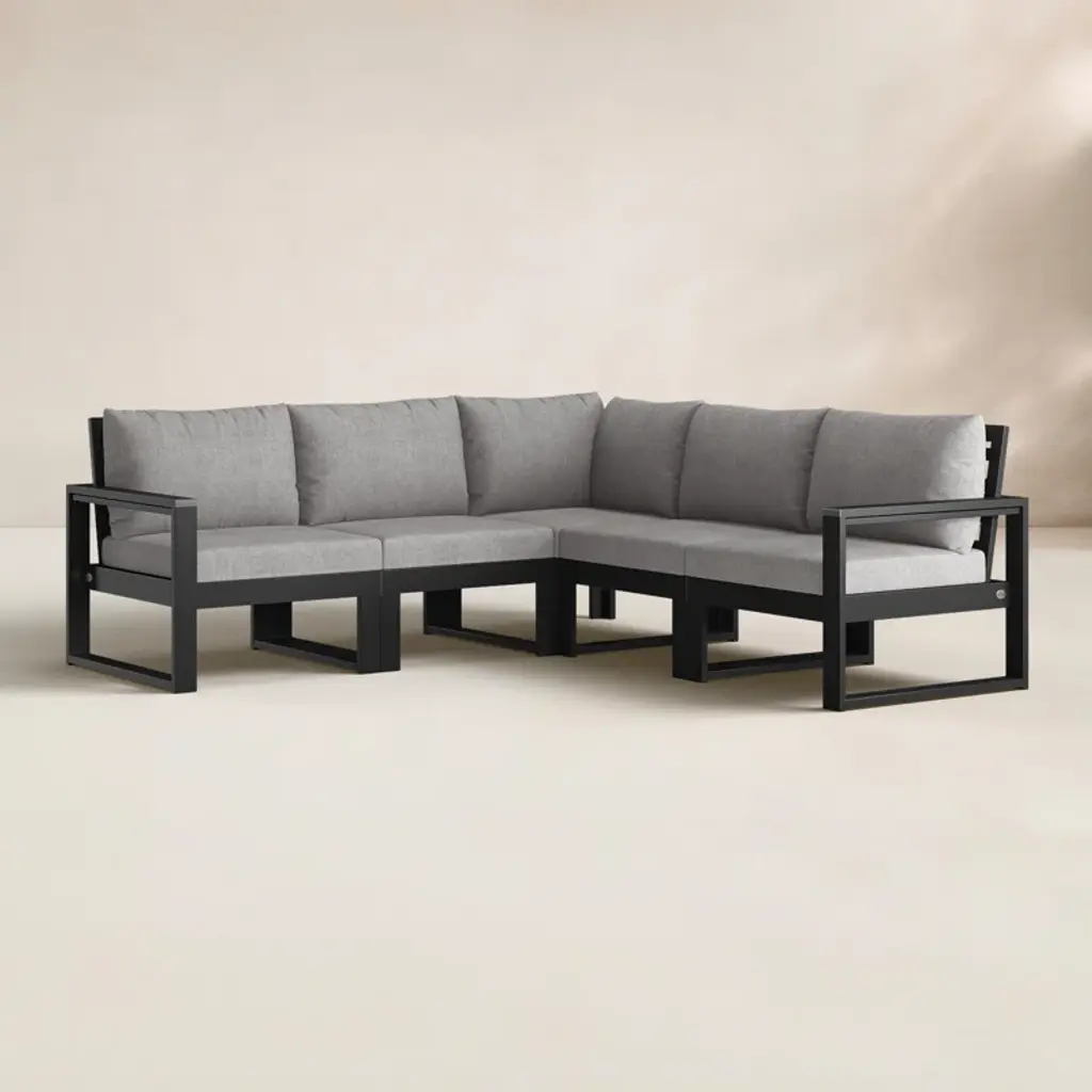 Introducing the Ravelo Natural Grey Outdoor 4 Piece 122" Sectional, designed to bring comfort and style to your outdoor space. This modern, modular sectional features deep seating and is upholstered in durable gunmetal polyester fabric. Perfect for patios, decks, and verandas, it combines functionality with a sleek, contemporary look.