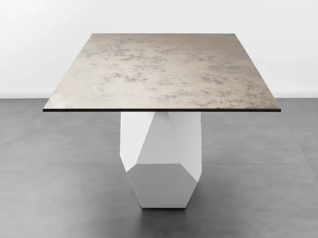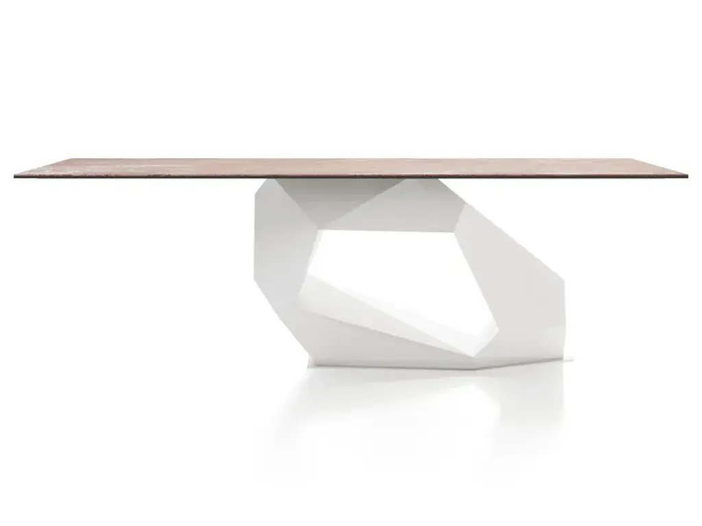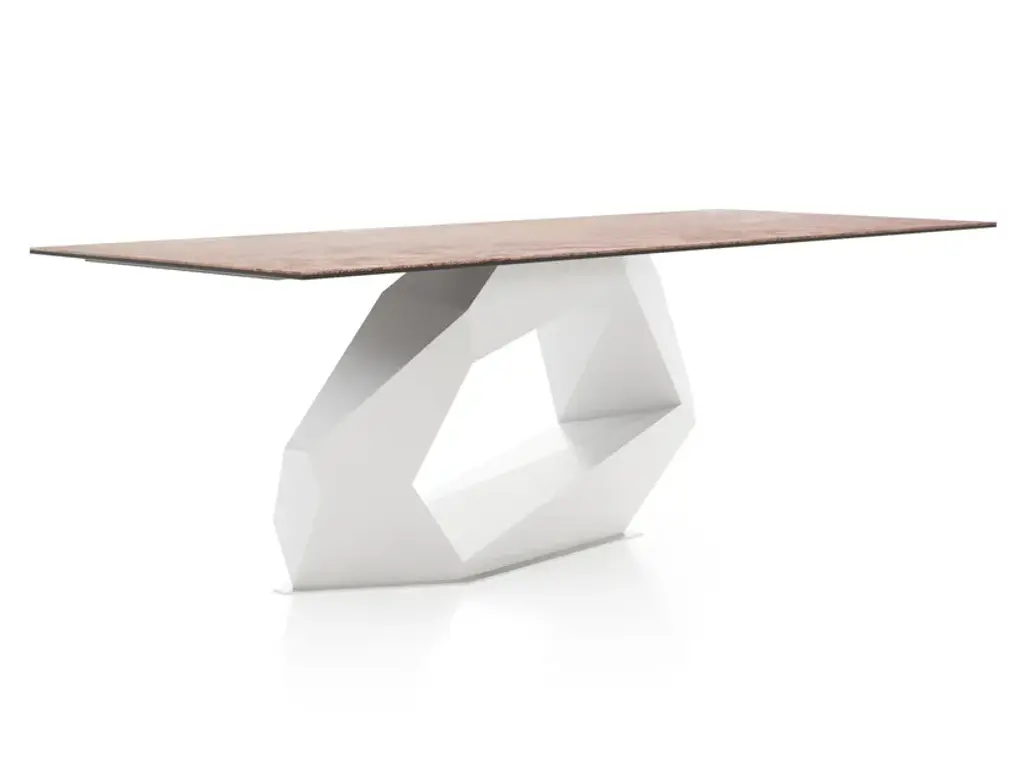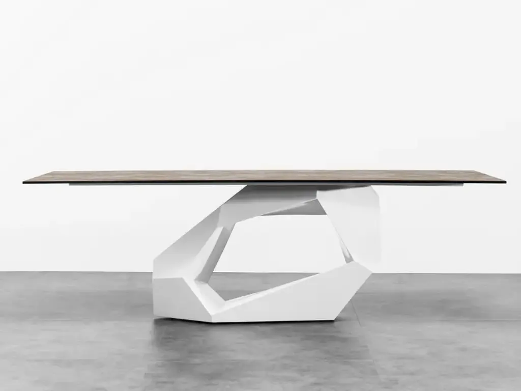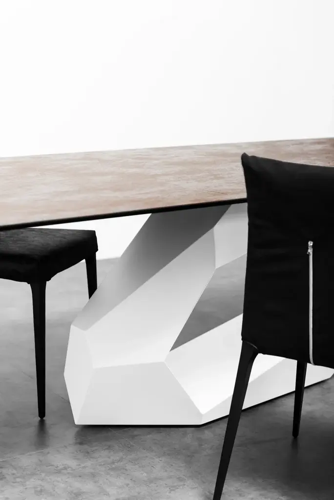 RAW DIAMOND is a rectangular table with glass or ceramic top and sheet metal base. Only apparently asymmetrical lines create a solid and airy volume at the same time. The infinite facets of the base are enhanced by the light that strikes it in an optical game of full/empty that creates a material vortex in continuous movement.Top: 12 mm thick tempered rear lacquered glass or 3/5+10 mm thick ceramic glass.Base: bent and powder-coated metal.From the creative vision of Liu Jo was born the custom-made living room. Craftsmanship, versatility, style and sustainability come together to enter the world of home and transform the furniture. Liujo’s living collection is a declaration of intent: new forms and customizable materials open the space to new reading keys and give life to unique pieces. The house is dressed and changed to meet all the needs of everyday life detaching from the classic nomenclatures and running on elegant lines, delicate finishes, soft fabrics and customizable colors. Not only sofas, poufs or armchairs, but design with a strong identity, free, sectional and removable, with irregular and fresh shapes that revolutionize the environment. Recognizable and iconographic in ideas, shape and finish, the pieces of furniture by Liu Jo find their reason for being in contrast: structures and rigid elements are designed to contain and embrace curves and movements, enhancing personal style and easily changing position and function.
