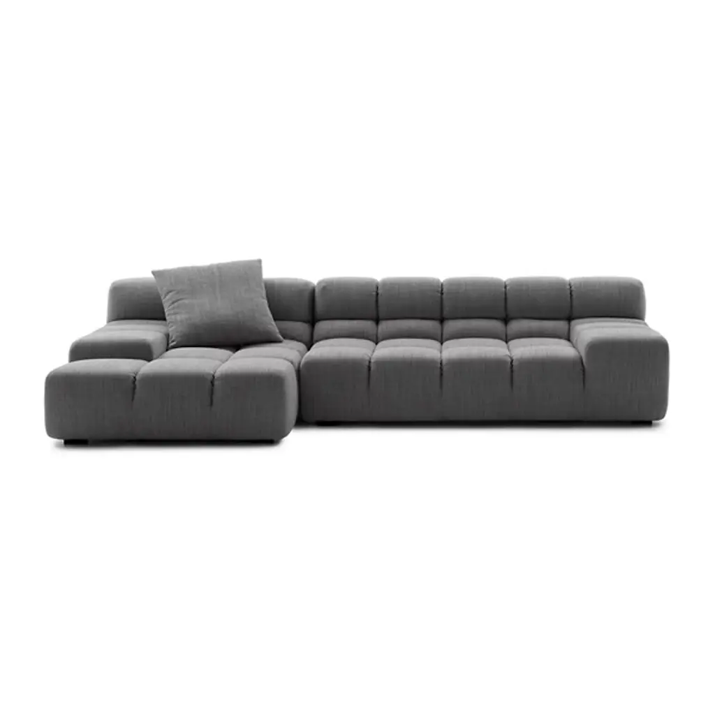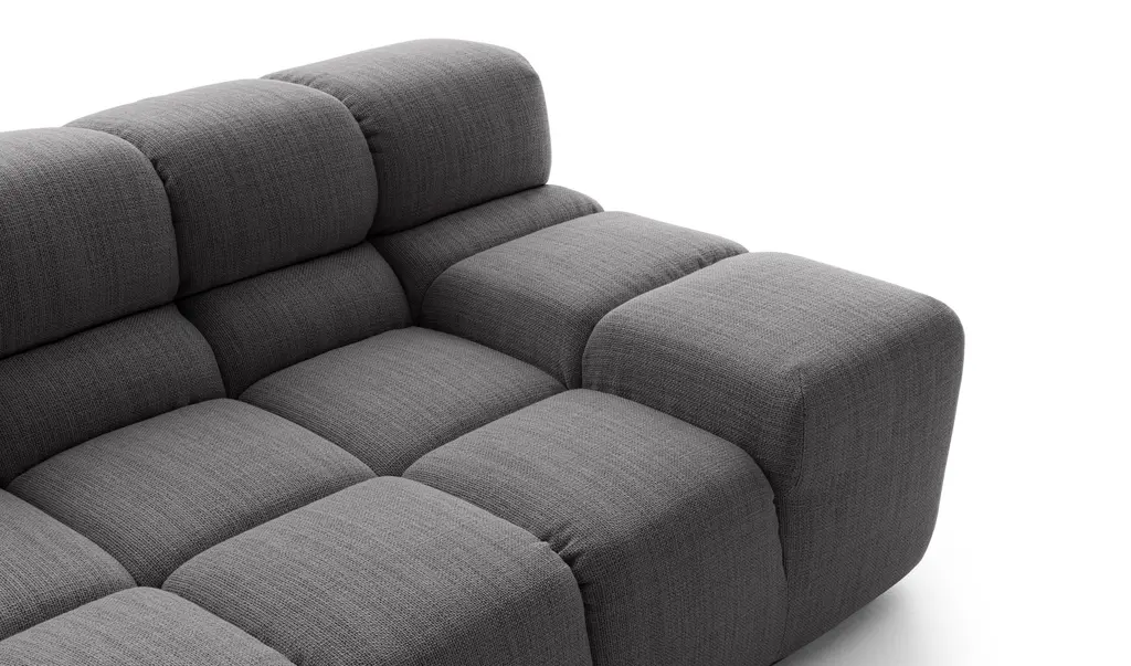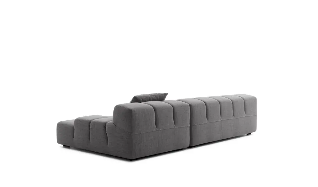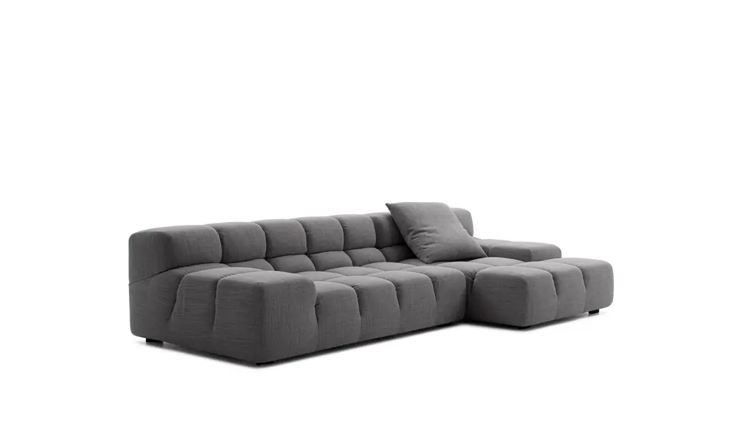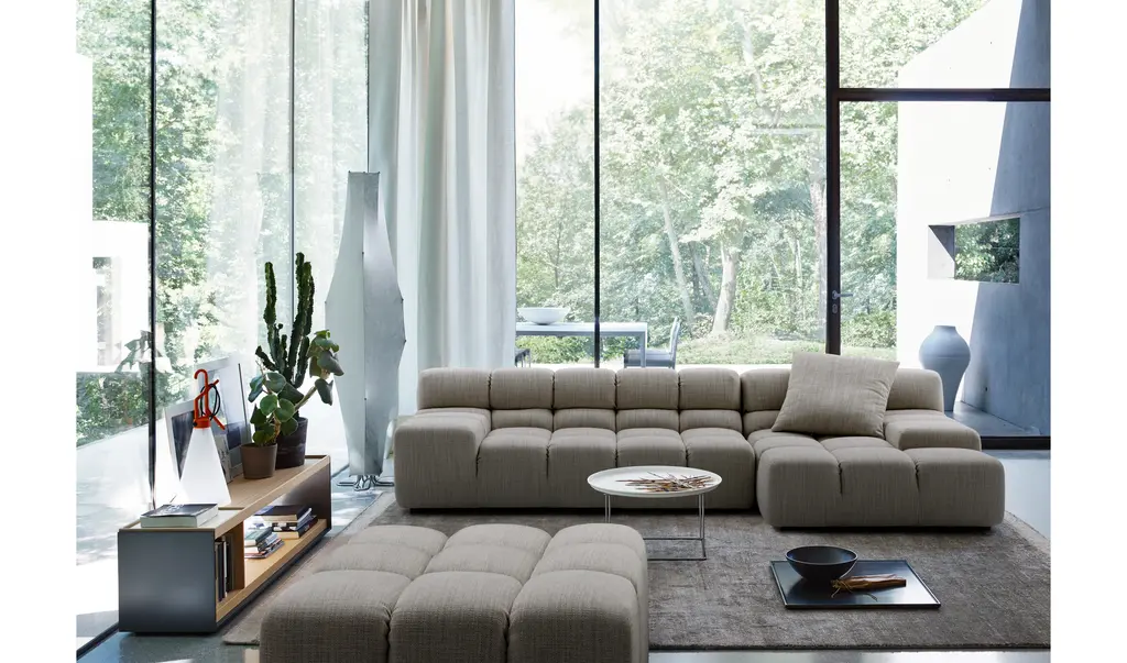 The Tufty-Time sofa series, one of B&B Italia’s most consolidated successes, finds effective answers to the themes of modularity, comfort and removable covers. The Tufty-Time modular system starts with an ottoman as the basic piece, which is then accompanied by central, corner and terminal elements with a low or high armrest. The elements are used to invent traditional sofas, sofas with chaise longue, corner sofas and island elements that provide a 360° seating solution. Cosy in its more accentuated depth, becomes a meeting place, a welcoming refuge where people can just relax. With its fabric upholstery, offers a more contemporary take on the traditional Chesterfield and capitonné sofas, with a freer and more informal lifestyle.