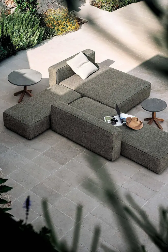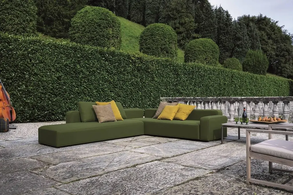 Overview:Dandy is the new revolutionary outdoor system by Roda, which includes all the functions of a textile sofa for indoor use, so intimate and familiar, in a completely new proposal for outdoor. Designed by the unmistakable talent of Rodolfo Dordoni, Dandy is characterized by the versatility of its design, the technological innovation processes and the highest quality of materials used. The "soul” of Dandy consists of an aluminum frame, lightweight but extremely strong, hidden by a padding with a "total outdoor technology" completely draining , breathable, and weather resistant. Dandy’s covers are available in a wide range of fabrics, with an outstanding natural beauty and an appealing color palette. The covers, fixed to the structure, are easily removable to be stored during the winter season, or to be cleaned. Dandy is a modular project that allows multiple compositions, in order to enjoy the conviviality and to meet the various needs of customization and space. The seat (available in size 225 x 75cm, 150 x 75cm and 150 x 130cm) and backrests / armrest (225 x 22 H 60cm, 150 x 22 H 60cm, 130 x 22 H 60cm, 75 x 22 H 60/44 cm) are indeed configurable for any environment, from the most intimate and cozy, to the widest and lively, from private to contract.Details:The Hydro Draining Technology: The upholstered collections have perfected the notion of breath ability in hydro draining cushions, attaining the highest level of complexity and efficiency. For the upholstered collections, Roda combines open-cell polyurethanes of different.Dimensions: W 126.5" x D 59.8 x H 23.6"Pillows included:Three Dandy back pillows 60 x 48cmFabric Panama X03 limeOne Deco 606 throw pillow 60 x 60cmFabric: Hive F02 peanut fabricTwo Deco 505 throw pillows 50 x 50cmFabric: Hive F02 peanut fabric & hive F03 oil fabric.