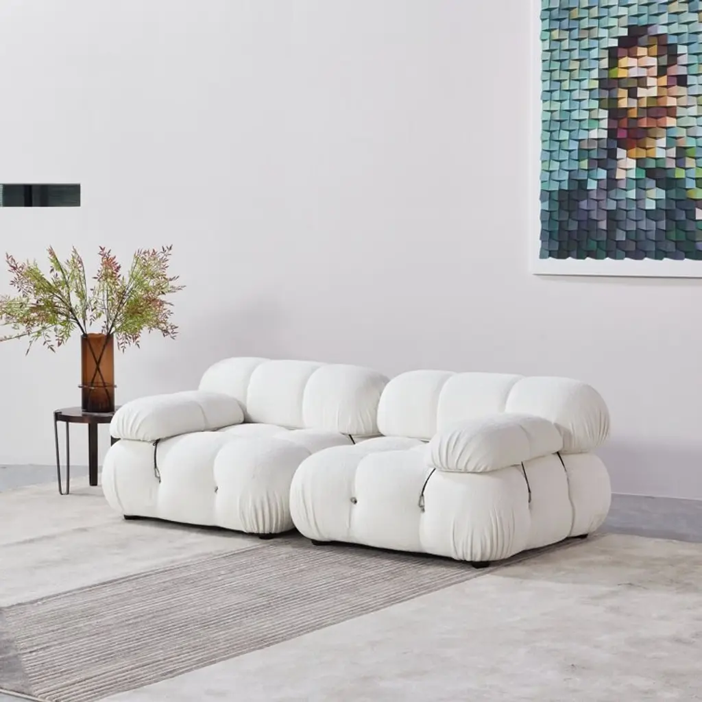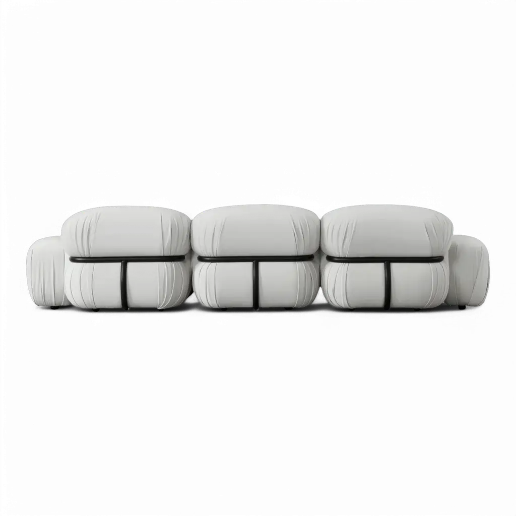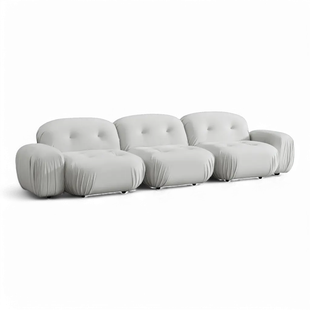 Elevate your living space with the chic and luxurious Rune Sectional Sofa Off White. Designed with a modern aesthetic, this three-piece sectional is fully upholstered in sumptuous off-white velvet, offering a soft and inviting texture. Its rounded seats and backrest create a harmonious, sculptural silhouette, perfect for adding elegance to any room. The tufted button detailing enhances the design, blending timeless charm with contemporary sophistication. Spacious and versatile, the Rune Sectional provides ample seating for lounging, entertaining, or relaxing in style, making it a stunning centerpiece for any interior setting. Also available in Terracotta Velvet. Velvet Upholstery: 100% Polyester | Inner Frame: Solid Wood, MDF, Plywood | Padding: High Density Foam | Legs: Solid PVC