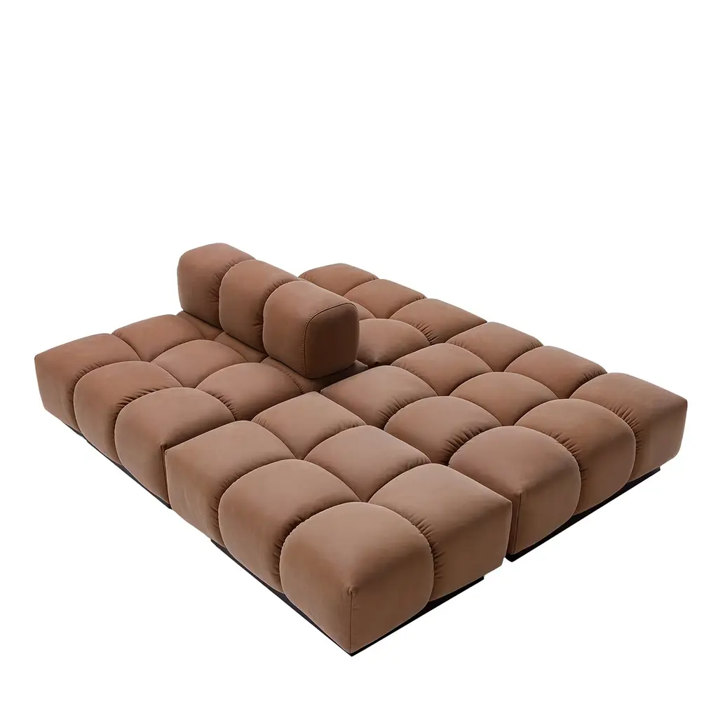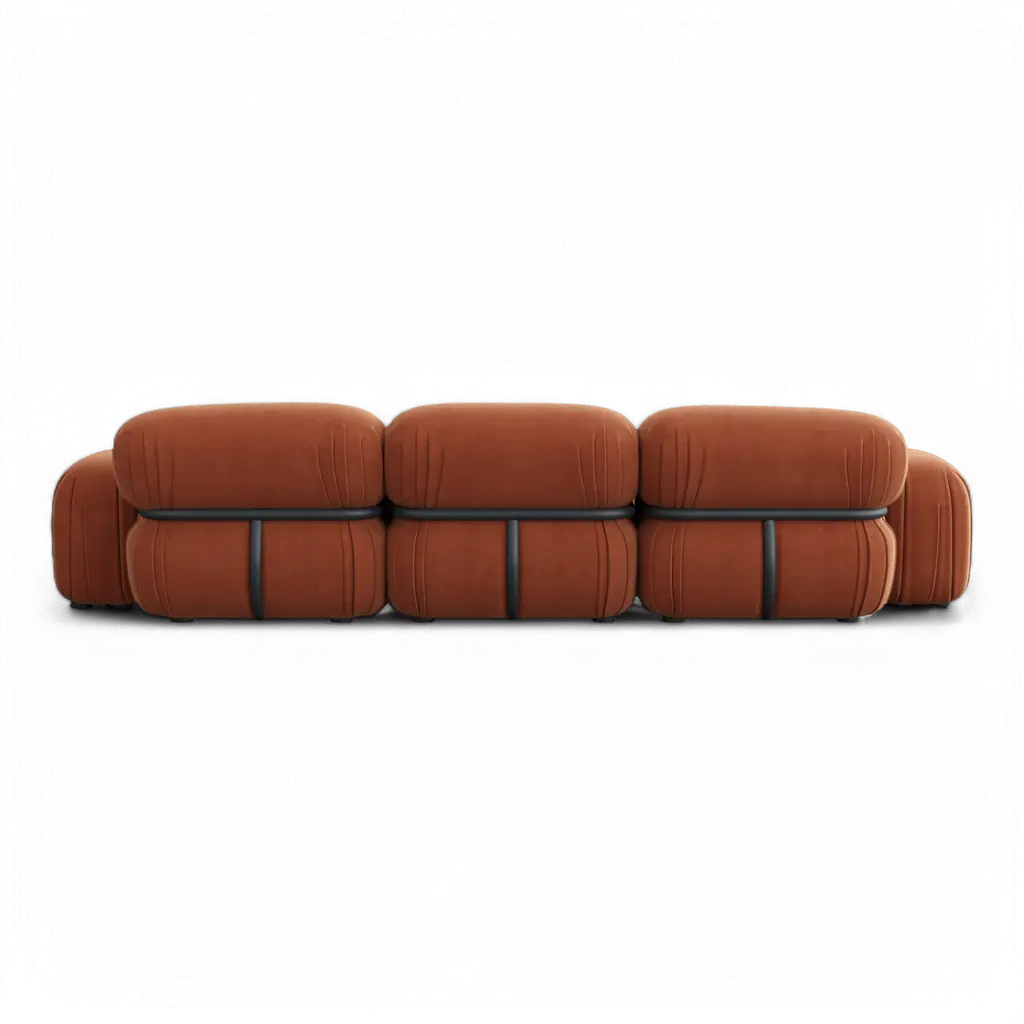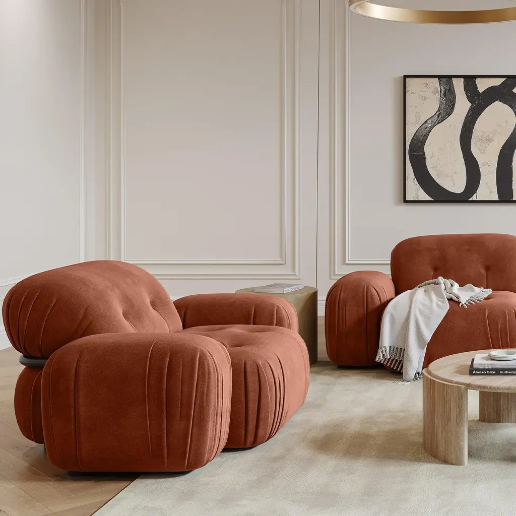 Elevate your living space with the chic and luxurious Rune Sectional Sofa in Terracotta Velvet. Designed with a modern aesthetic, this three-piece sectional is fully upholstered in sumptuous terracotta velvet, offering a soft and inviting texture. Its rounded seats and backrest create a harmonious, sculptural silhouette, perfect for adding elegance to any room. The tufted button detailing enhances the design, blending timeless charm with contemporary sophistication. Spacious and versatile, the Rune Sectional provides ample seating for lounging, entertaining, or relaxing in style, making it a stunning centerpiece for any interior setting. Also available in Off White Velvet. Velvet Upholstery: 100% Polyester | Inner Frame: Solid Wood, MDF, Plywood | Padding: High Density Foam | Legs: Solid PVC