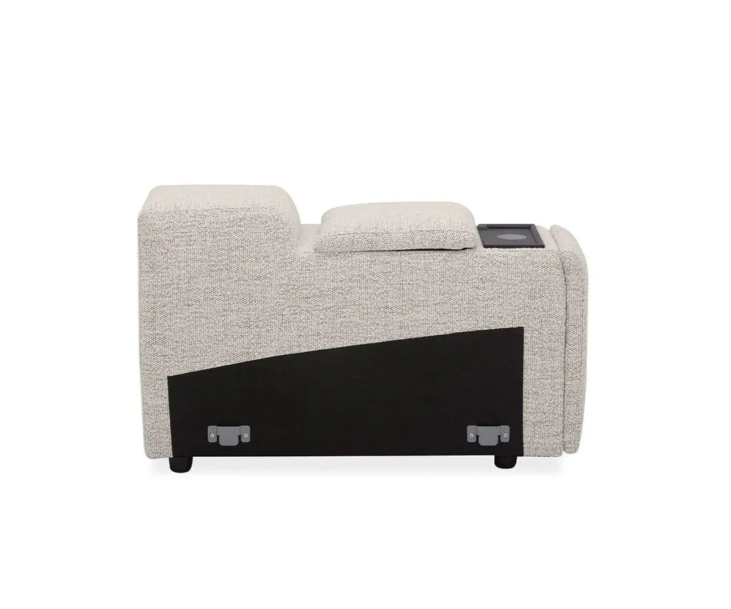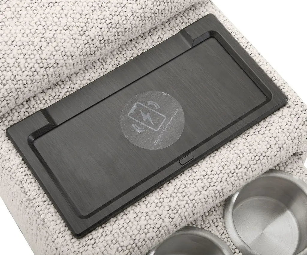 Take your Ryden Modular Sectional to the next level with the Ryden Console; this useful console comes complete with a wireless charger, power-hidden cup holders and a storage compartment that includes two electrical outlets and two USB ports. The gracefully-rounded curves of the Ryden Collection lends these modular pieces a sense of chic, effortless comfort. This versatile collection is at home in any contemporary setting, but can also be easily styled to blend with a rustic or mid-century aesthetic. Upholstered in a lovely fabric, the Ryden Collection consists of a group of modular power motion pieces, designed so that multiple sofa and sectional configurations can be created. A plush feather-blend filling enhances the feel of the seats, backs and curved arms.