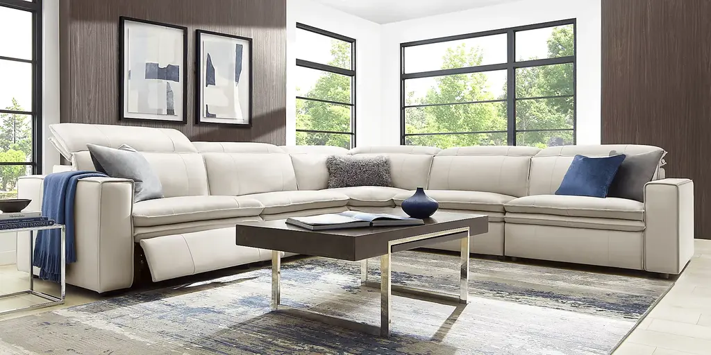 Uptown style meets weekend mode with the Drew & Jonathan Santorini sectional's spacious seating and high-tech functionality, offering the perfect blend of chic style and cozy comfort. Upholstered in top grain leather where the body touches, this sectional features stylish track arms and attached double pillow pad seat cushions for a sophisticated feel. The dual power reclining feature allows adjustment in the headrest and footrest for personalized support and the ultimate lounging experience. Upholstery: Top grain leather where the body touches and polyurethane fabric sides and backs. Leather is a durable, low maintenance product, however, general regular maintenance is necessary. To keep your leather clean, vacuum it regularly, removing any dust, and clean it with water and a mild non-detergent soap.