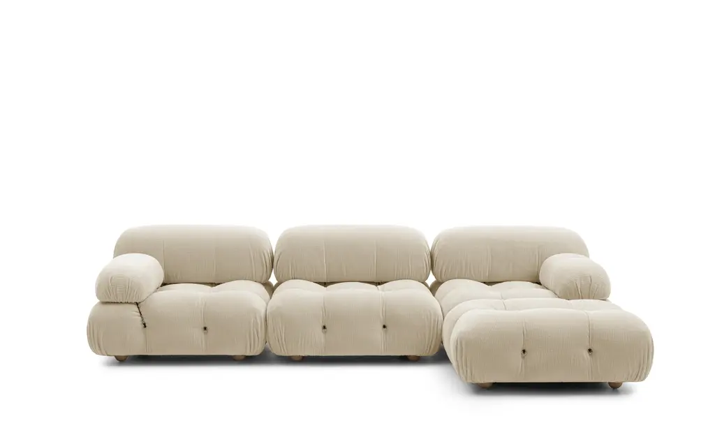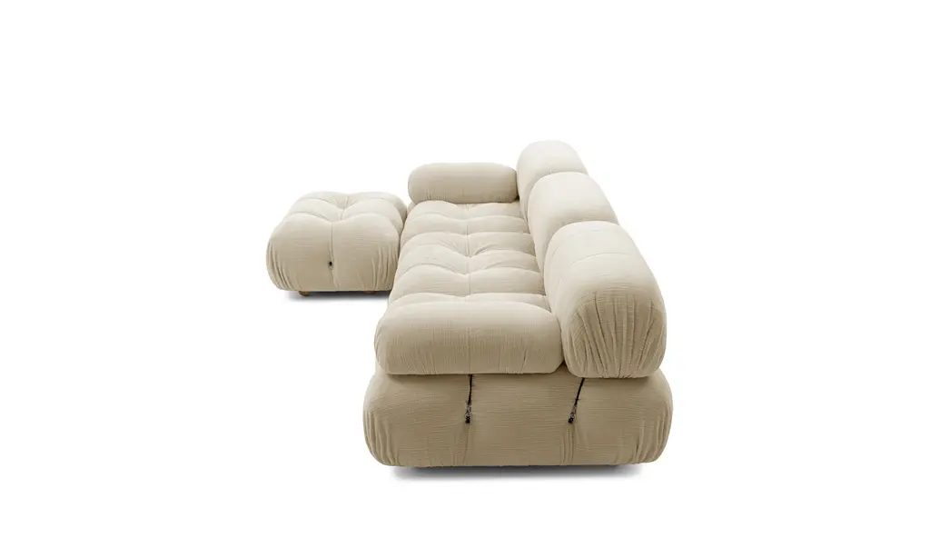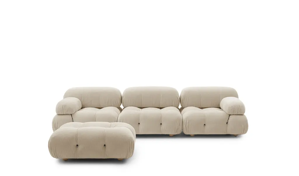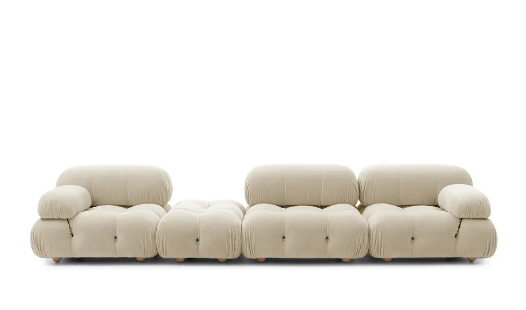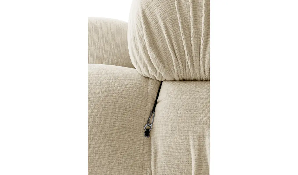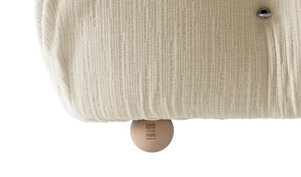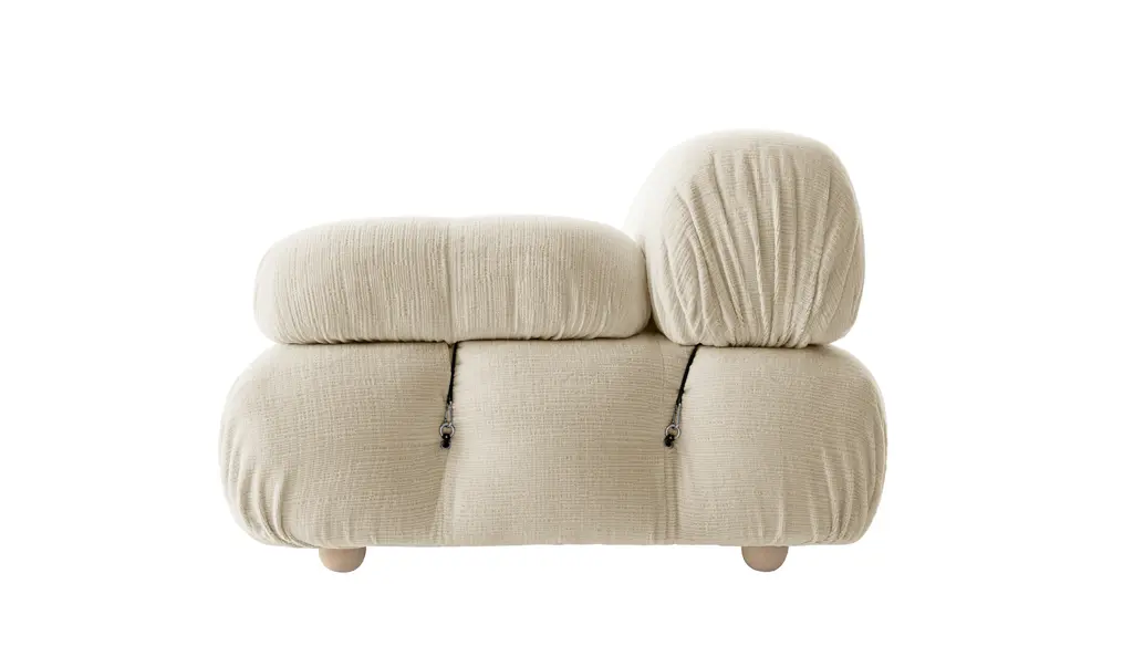 In its new version, Camaleonda preserves the elements that have made it an iconic piece of furniture. Certain elements remain faithful to the original project, such as the seat module, the backrest and armrest, and the characteristic capitonné design, still manufactured with the innovative system of cables, hooks and rings created by Bellini in 1970, which defines its characteristic look and modularity. Internally, instead, it has been completely redesigned to make Camaleonda even more comfortable than the original, as well as sustainable. The internal structure is now built like a sandwich, with easily disassembled layers of recycled or recyclable materials. The core of the seats, backs and armrests is made up of wooden panels; the padding is made of polyurethane in various levels of density and firmness, with different shaped layers interacting to create a comfortable spring-like effect. This engineering feature makes Camaleonda extraordinarily comfortable and allows the interior of the sofa to be disassembled, making it easy to recycle. The fundamental characteristic of Camaleonda is its unlimited modularity, a geometric nature that allows each element to become a sort of enormous pixel through which to define your home environment. Thanks to the tie-rods and rings, the modules can be unhooked and recombined at will, allowing the sofa to adapt to an evolving taste and to the dynamic needs of those using it, while always maintaining its unique identity.