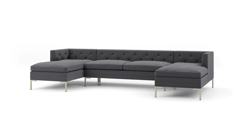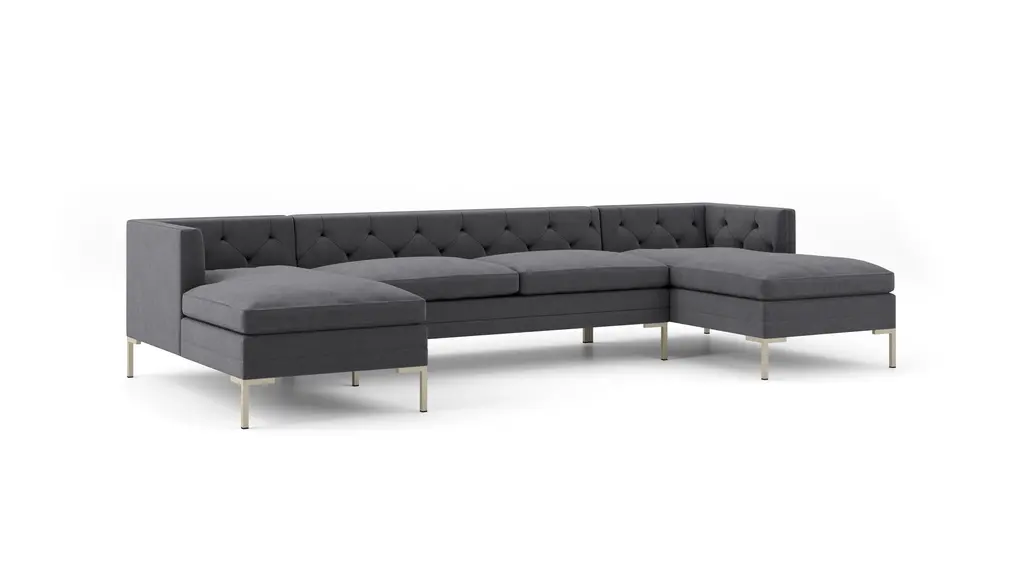 DESIGN A modern take on traditional tufting, the Sit Tight collection blends architectural elegance with everyday comfort. Elevated by a tailored silhouette and sleek metal legs, the Sit Tight Double Chaise Sectional can be customized in your choice of fabrics, sizes, and leg finishes - creating a design that's as unique as your space. Handcrafted in the United States. FEATURES Solid Foundation: Our frames are constructed from precision-cut, FSC-certified engineered wood for unmatched strength and stability, featuring reinforced, interlocking joinery for added durability. Customizable Cushion Options: Choose from standard or down alternative cushions. Standard cushions offer our most supportive sit and a sleek, tailored look that requires minimal fluffing. These cushions feature high-quality, high-resiliency CertiPUR-US® foam core seats wrapped in premium fiber with a high-density foam tight-back cushion. Down alternative cushions deliver our most relaxed yet supportive sit, with a more casual look that requires moderate fluffing. These cushions feature high-quality, high-resiliency CertiPUR-US® foam core seats wrapped in plush down-alternative fiber with a high-density foam tight-back cushion. CertiPur-US® foam is held to the highest standards of product safety and durability, so you can rest easy. Supportive Webbing Suspension: Designed to maximize comfort, our premium webbing system provides a resilient foundation. Customizable Upholstery: Choose from a vast selection of durable premium and performance fabrics and genuine Italian leather to personalize your Sit Tight Sectional's look.
