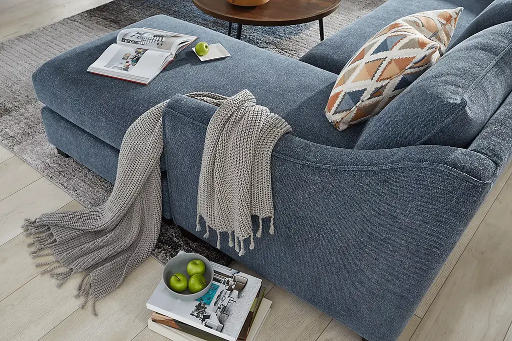 Casual grace with a sly glint of fashion-forward style in the Soho Place collection from Cindy Crawford Home are the keys to a trendy living room that adds an easy groove to an uptown zip. Upholstered in soft navy chenille, the sofa features chic sloped track arms and reversible scatter back pillows. The seat cushions are also reversible, perfect when it's time to move the floating chaise over for a fresh room arrangement. Welted seams on the arms and back pillows give the impression of a frame, heightening the contemporary look. Nestled away for overnight guests, a Nature's Bed gel foam mattress pulls out to provide a cool and comfortable place for rest. Upholstery: 95% Polyester 5% Linen.