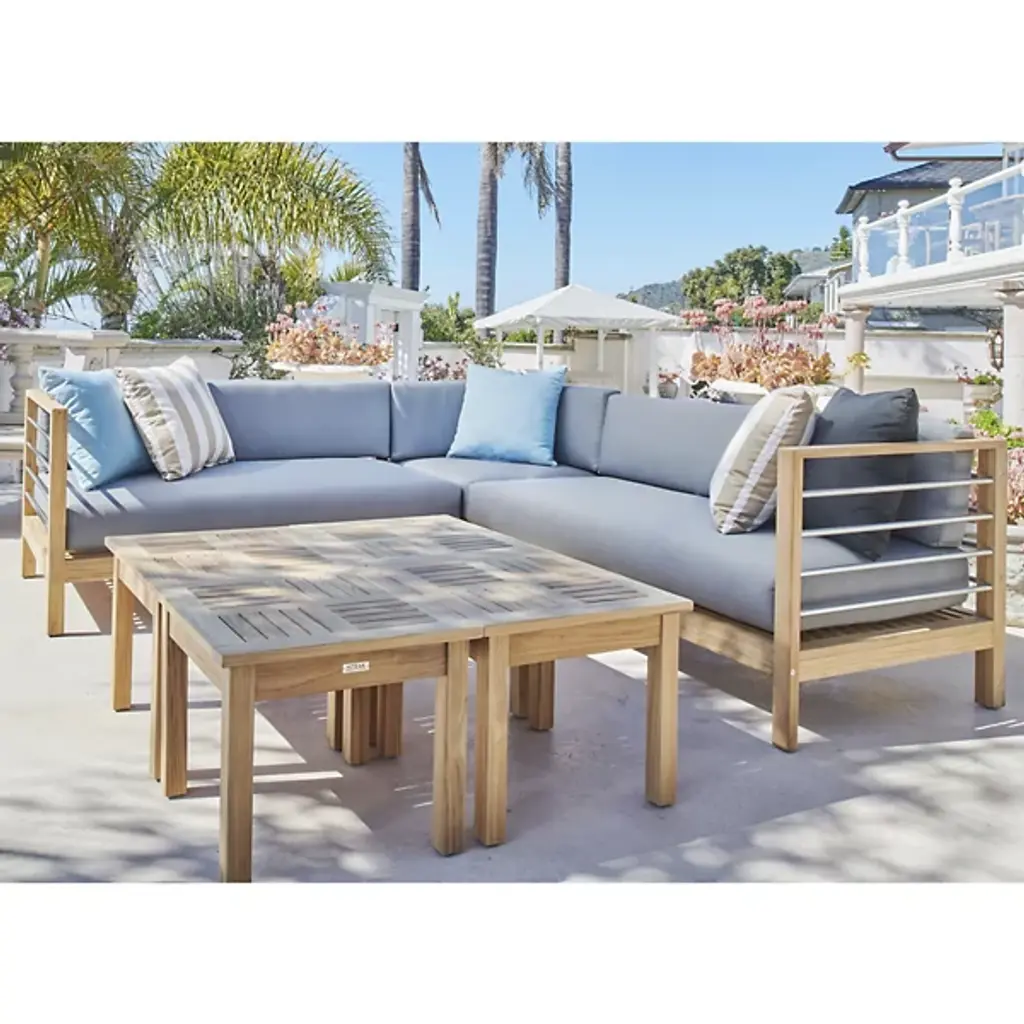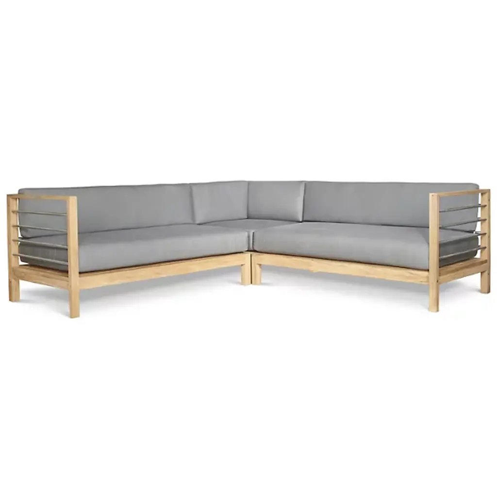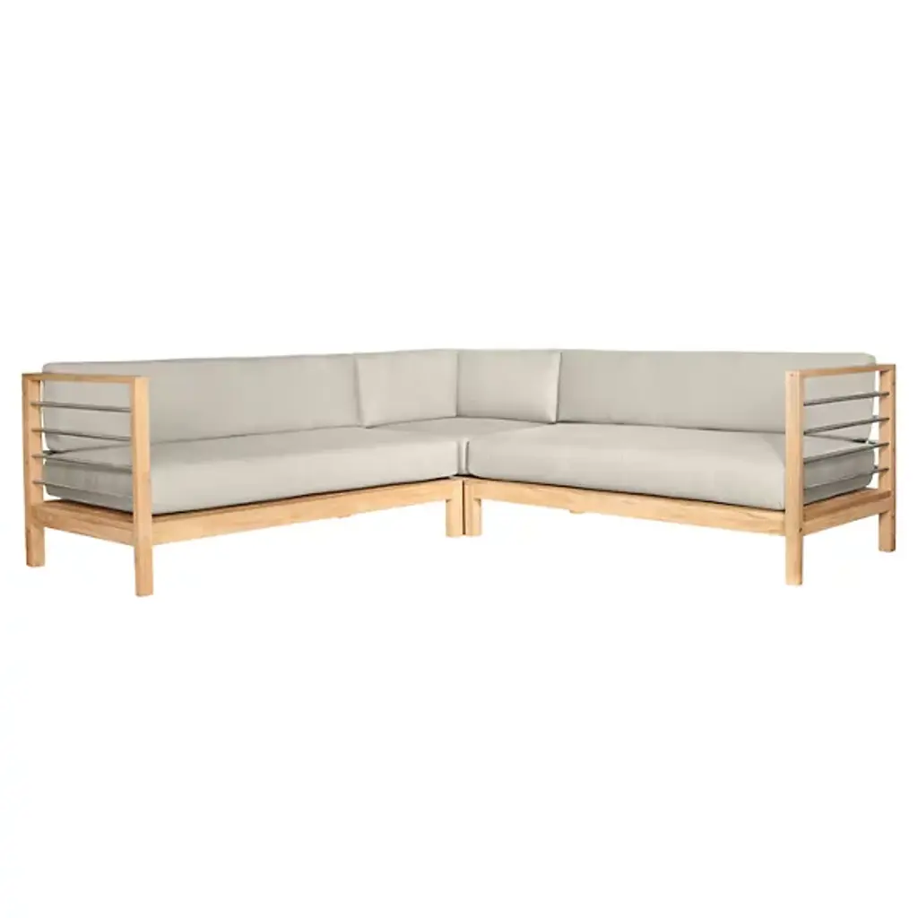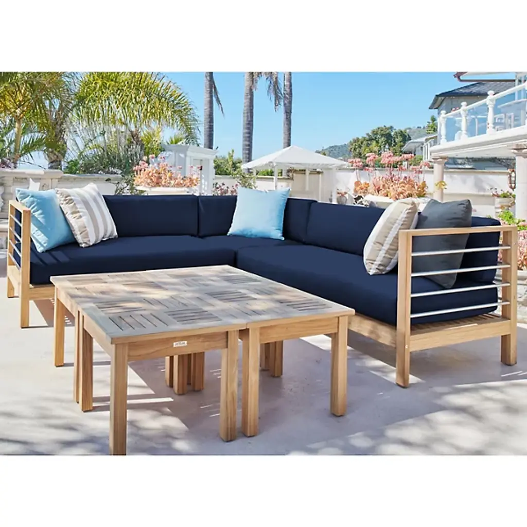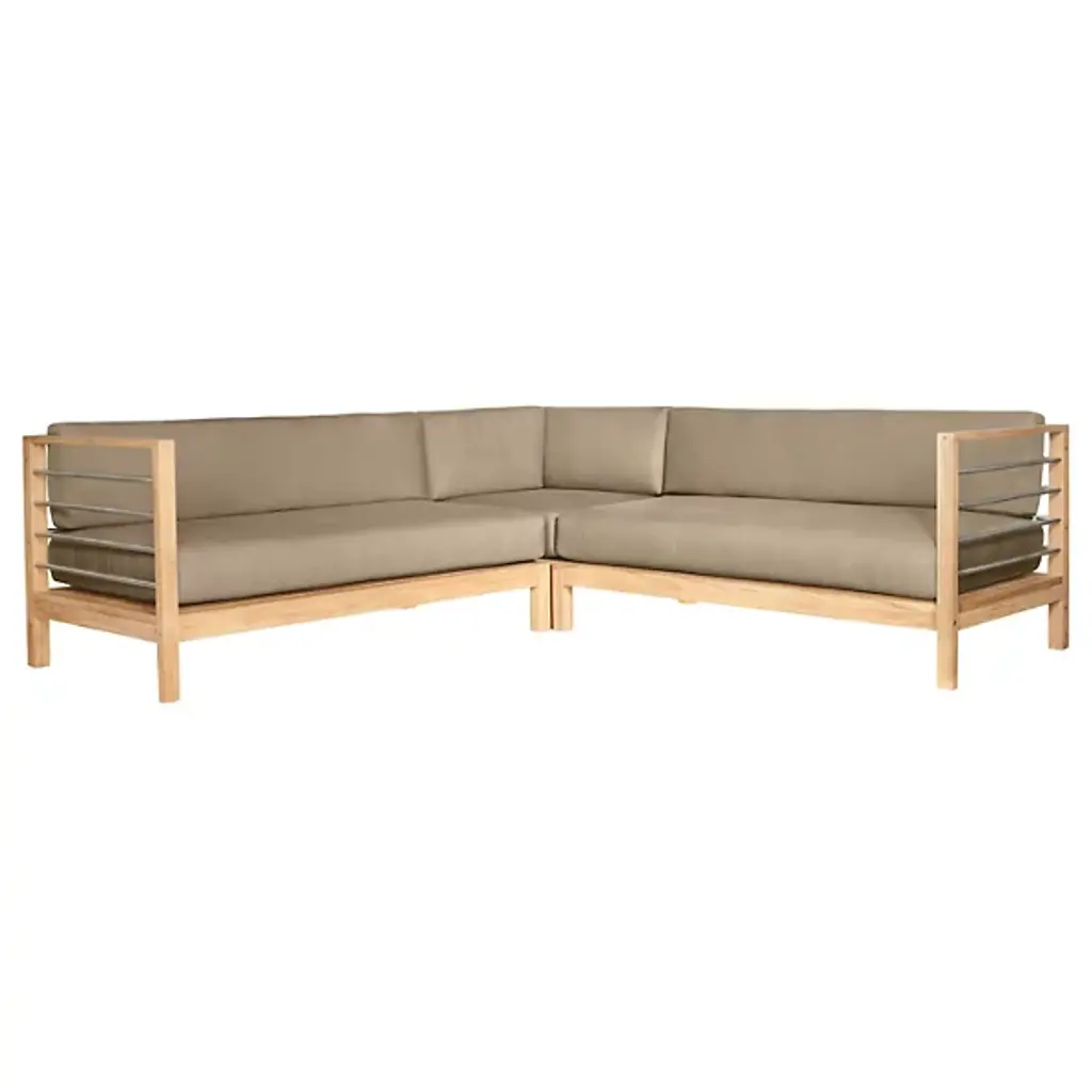 Clean edges and plump shapes underscore this modern living standout. Great on its own or when combined, the SoHo Teak Outdoor Sectional Sofa from HiTeak Furniture freshens up the outdoors with an ultra-refined design. The sectional's geometric framework complements the architectural lines of the modern home. The teakwood frame may be slim, but it's as strong as wood gets. Teak's dense quality lets it stay solid after seasons left outdoors. The wood's textured, organic hues visually enhance the piece against the uniform color of the cushions. The L-shaped cushion setup leans one back with plenty of support. The cushion's sunbrella exterior adds an extra level of durability.