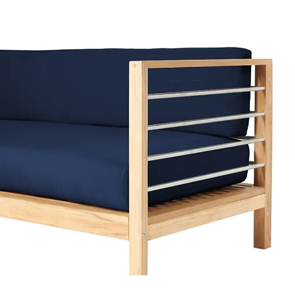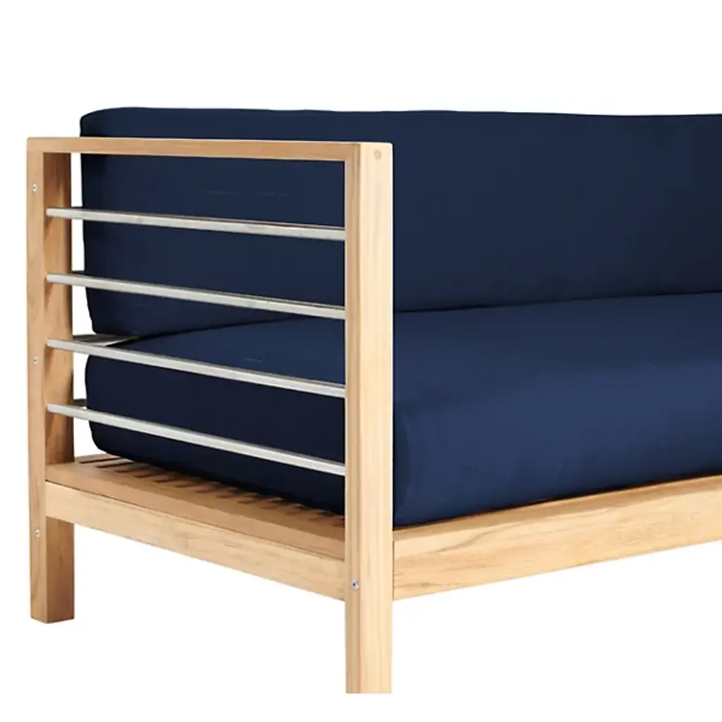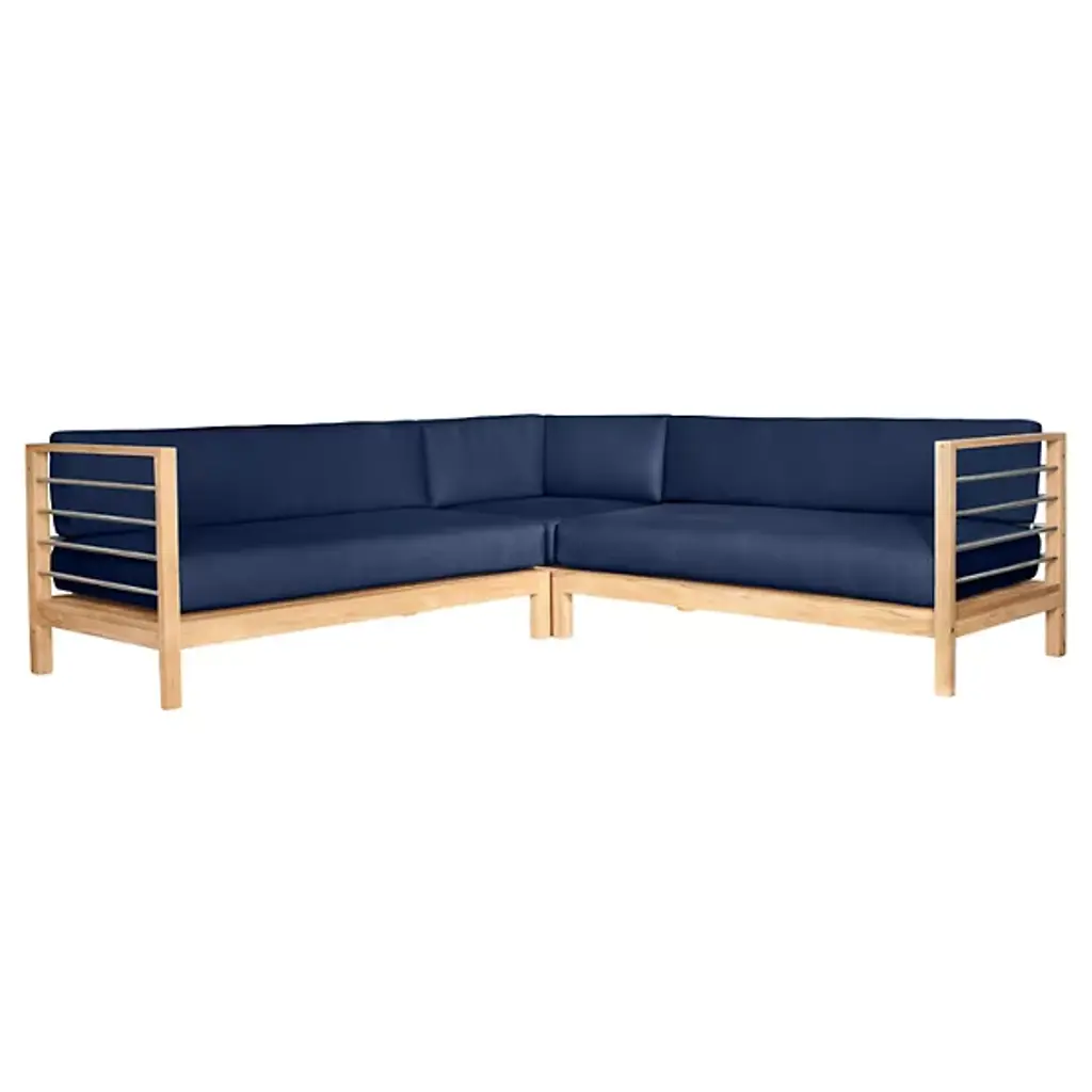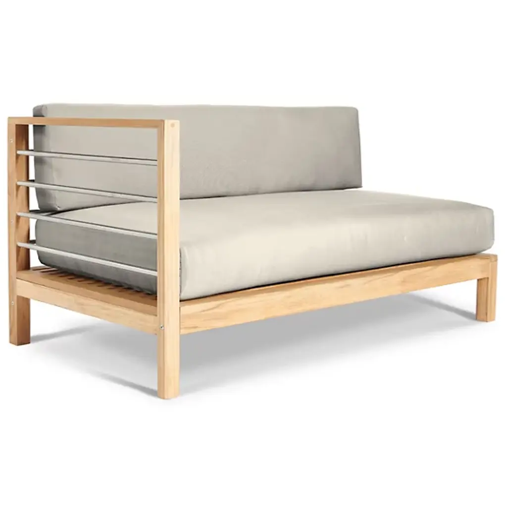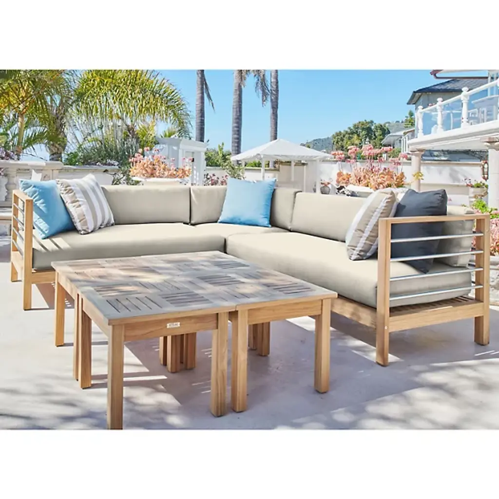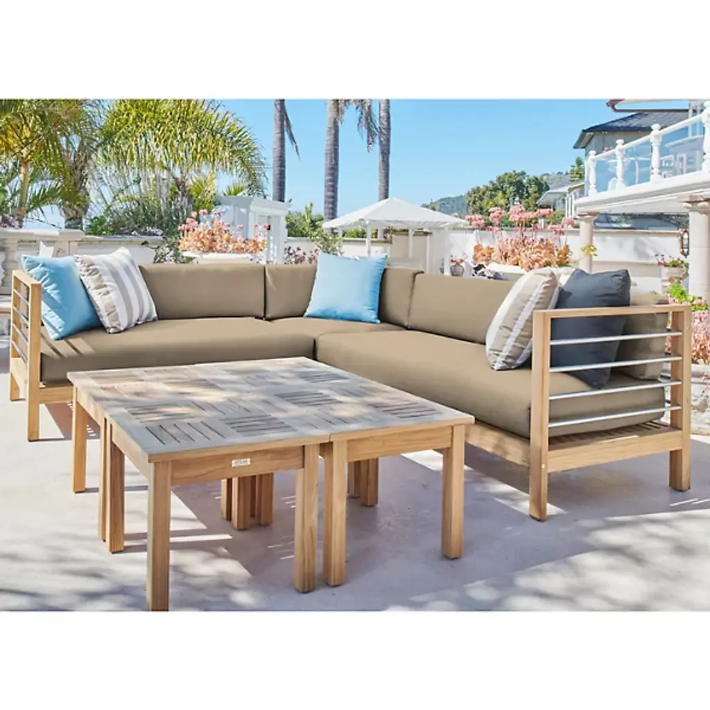 Clean edges and plump shapes underscore this modern living standout. Great on its own or when combined, the SoHo Teak Outdoor Sectional Sofa from HiTeak Furniture freshens up the outdoors with an ultra-refined design. The sectional's geometric framework complements the architectural lines of the modern home. The teakwood frame may be slim, but it's as strong as wood gets. Teak's dense quality lets it stay solid after seasons left outdoors. The wood's textured, organic hues visually enhance the piece against the uniform color of the cushions. The L-shaped cushion setup leans one back with plenty of support. The cushion's sunbrella exterior adds an extra level of durability.