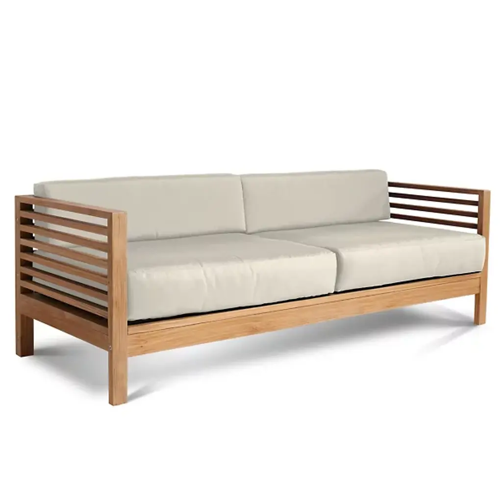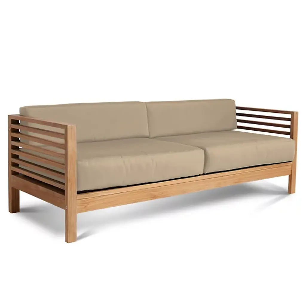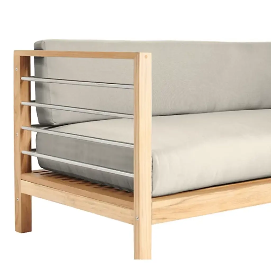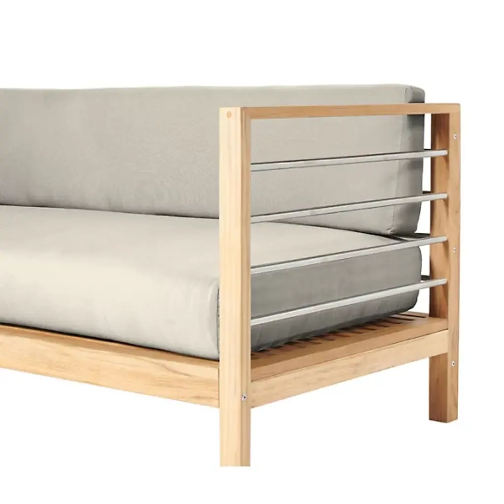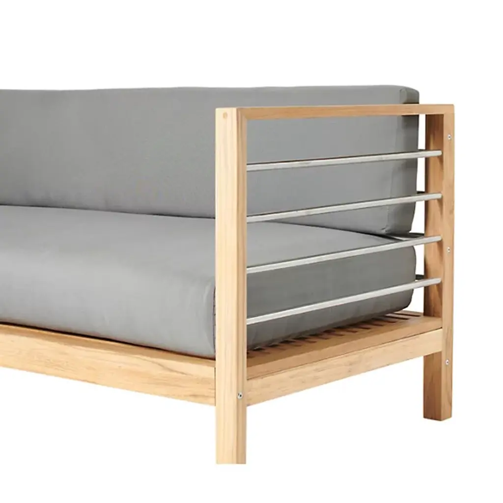 Clean edges and plump shapes underscore this modern living standout. Great on its own or when combined, the SoHo Teak Outdoor Sectional Sofa from HiTeak Furniture freshens up the outdoors with an ultra-refined design. The sectional's geometric framework complements the architectural lines of the modern home. The teakwood frame may be slim, but it's as strong as wood gets. Teak's dense quality lets it stay solid after seasons left outdoors. The wood's textured, organic hues visually enhance the piece against the uniform color of the cushions. The L-shaped cushion setup leans one back with plenty of support. The cushion's sunbrella exterior adds an extra level of durability.