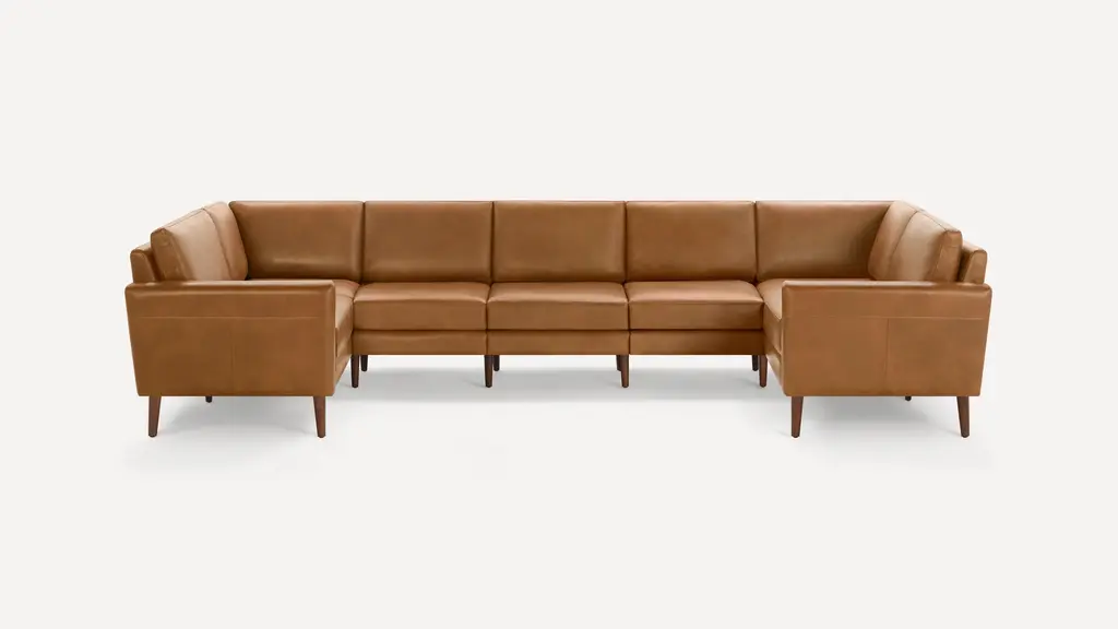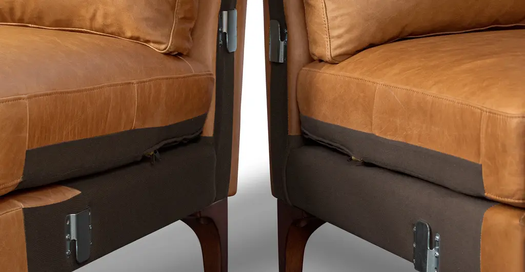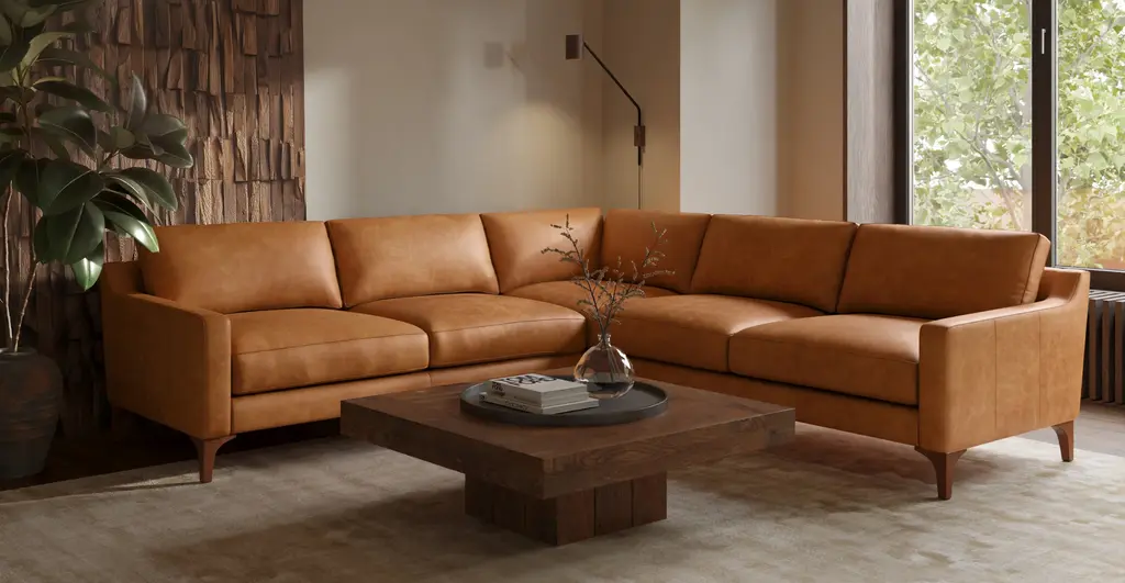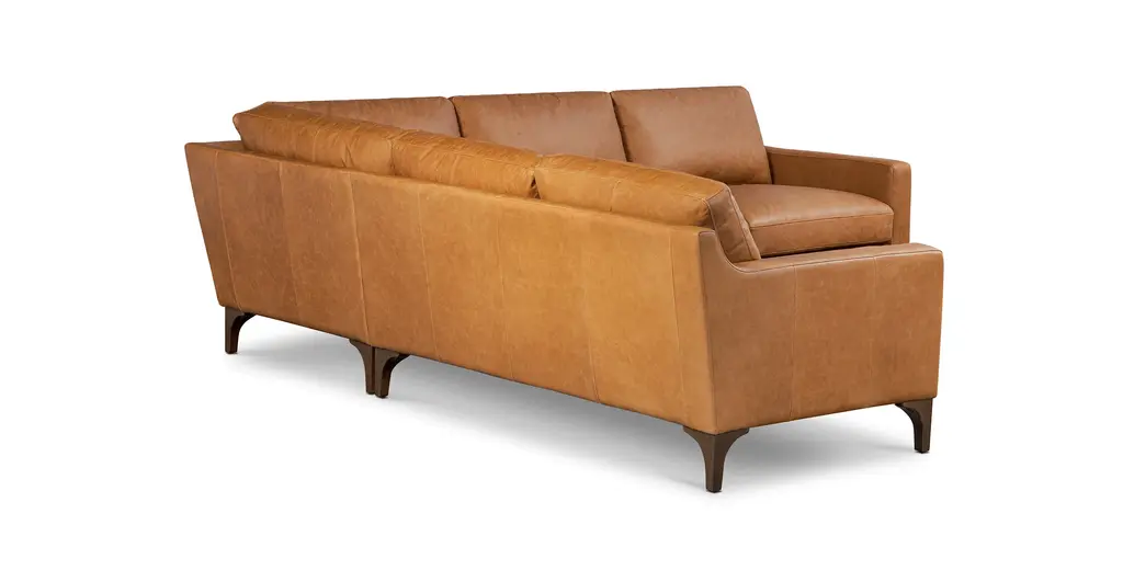 Swathed in full-grain Italian leather, the Sorrento corner sectional exudes an elegant aura in cognac tan, gracefully aging into a refined vintage patina. Each hide's unique depth of color rests on solid wood curved legs, ensuring a distinguished look. Supported by a kiln-dried frame and plush feather-down cushions, it promises a luxurious embrace, maturing beautifully with each passing year.