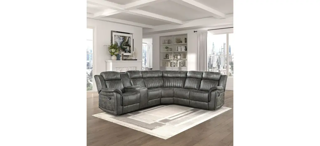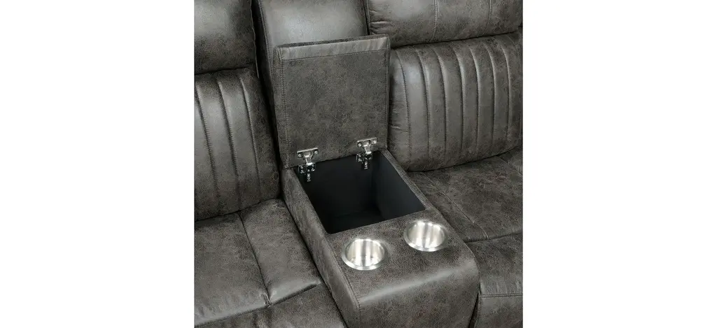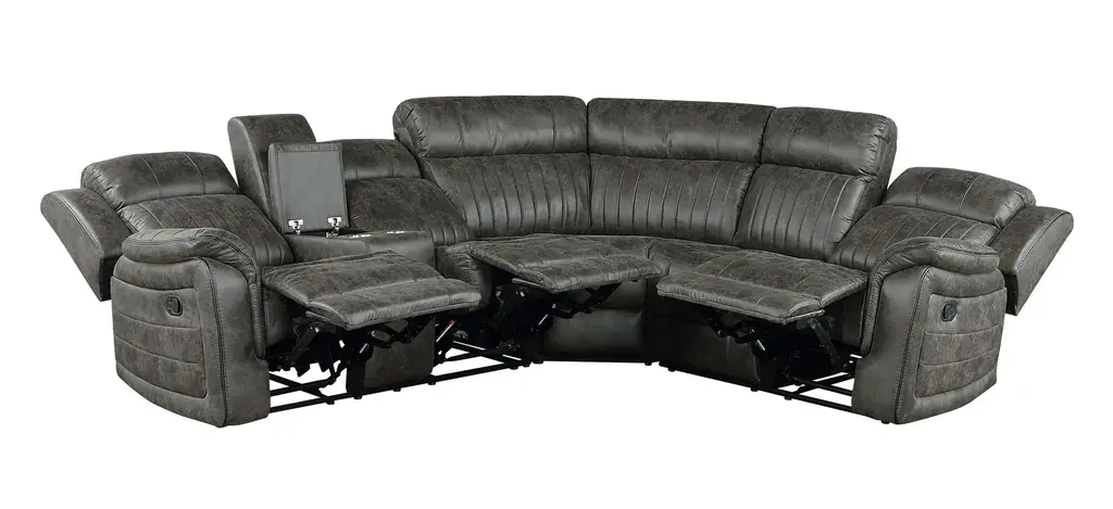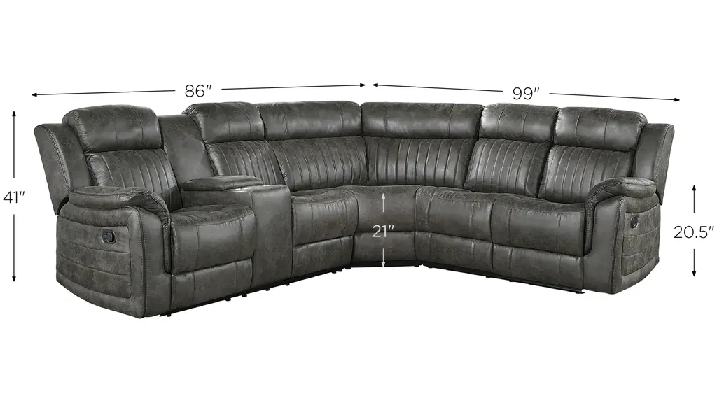The design of the Spivey 3-pc. reclining sectional provides a platform for your relaxing downtime. From the classic transitional style to the versatile neutral color of the brown-ish gray faux suede fabric covering, this collection is the perfect addition to your living room. Plush seating features vertical tufting, pillow-top arms, each enhanced by the dual end recliners of the sectional. Creating additional function is the console unit providing secure placement of beverages and lift top hidden storage. The reclining mechanisms of the end recliners are engaged by a pull of the side mounted tabs, taking you from seated to prone in an easy motion.