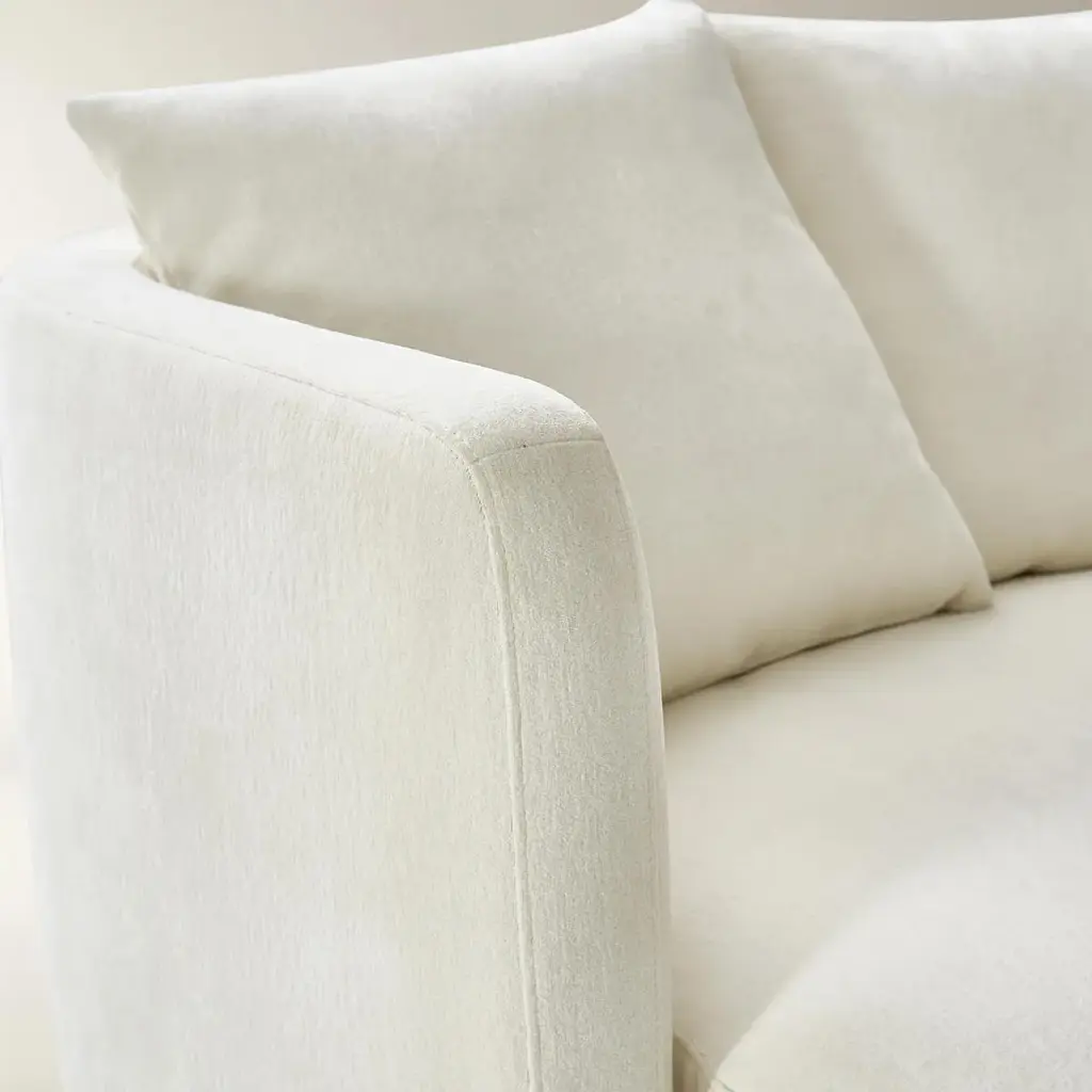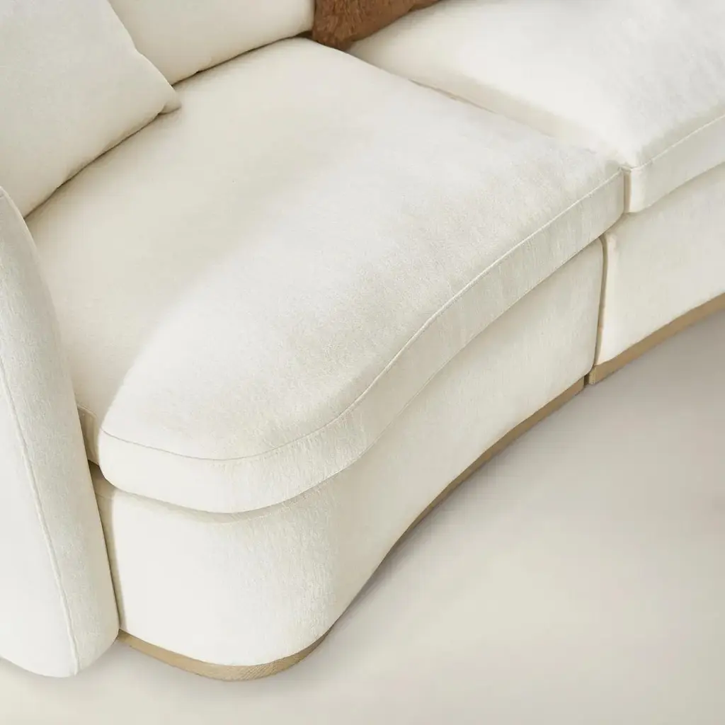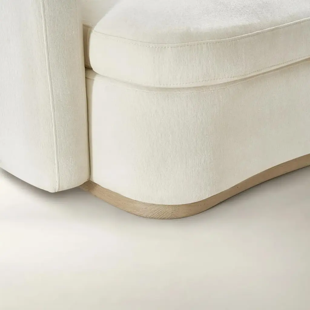 The Stria Sectional in ivory brings a sculptural softness to modern living. Its gracefully curved silhouette invites connection and creates a natural flow within smaller spaces. Upholstered in plush ivory chenille, the surface feels velvety and breathable, combining timeless elegance with durable performance. Each seat features triple-layer cushioning, blending high-density foam for support, down blend for sink-in comfort, and ergonomic shaping for everyday ease. A kiln-dried solid oak frame provides long-term stability, while hand-finished upholstery details elevate the look from functional to refined. This curved ivory sectional sofa is perfect for movie nights, casual lounging, or sophisticated entertaining—all in one compact, beautifully crafted design.ZG Exclusive