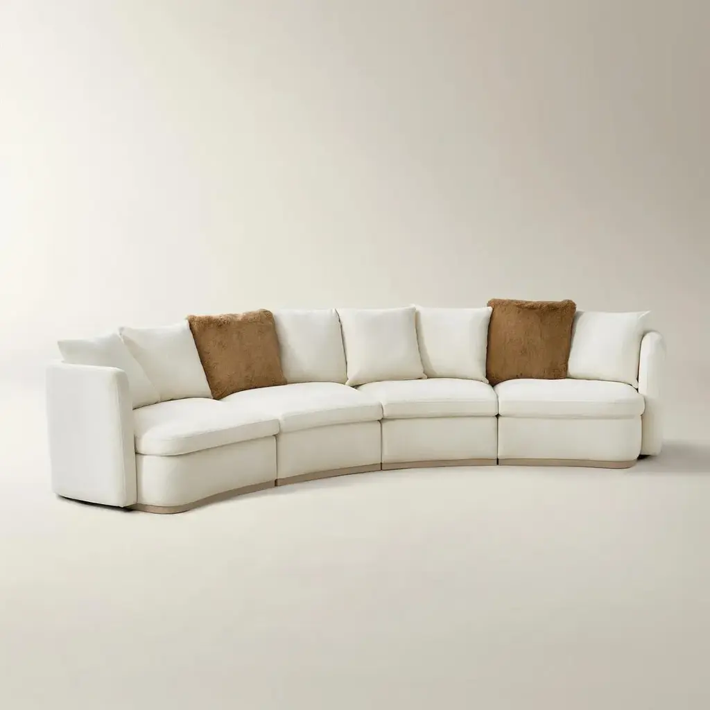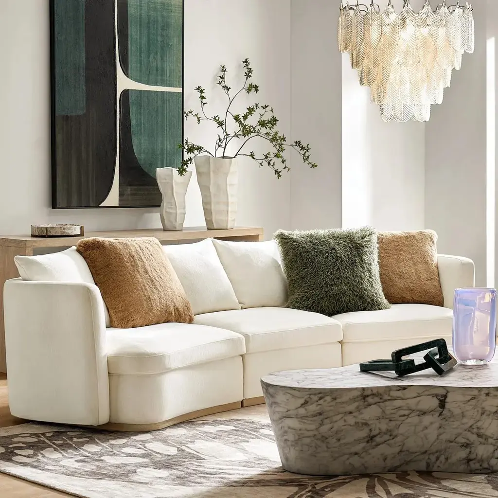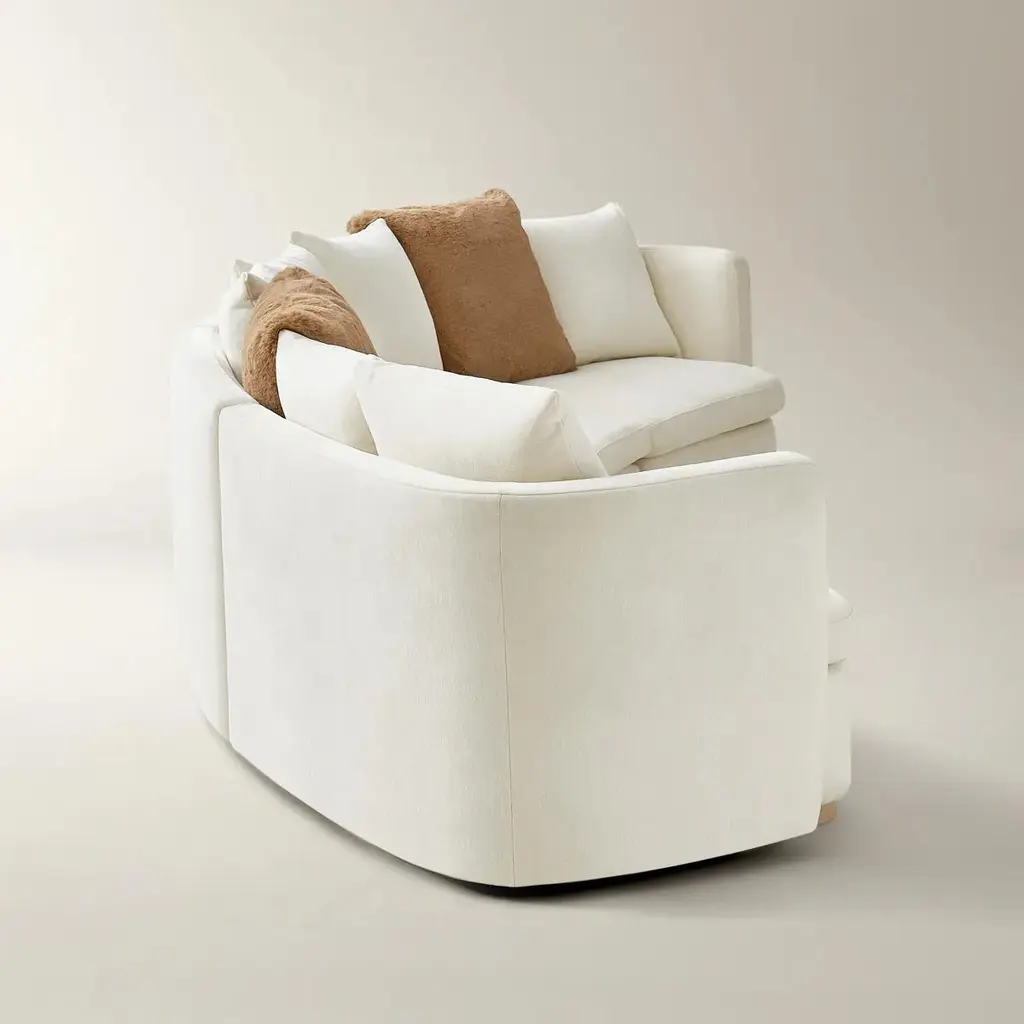 The Stria Sofa in ivory brings sculptural softness and serene comfort to your space. Its curved design creates a sense of flow and intimacy, ideal for small living rooms or open-plan areas. Upholstered in breathable, velvety ivory chenille, this sofa is as refined as it is welcoming. Triple-layer cushioning combines high-density foam, a plush down blend, and ergonomic shaping to deliver a tailored seating experience that supports and cradles in equal measure. Built on a kiln-dried oak frame with handcrafted upholstery details and seamless reconfiguration connectors, this curved chenille sofa pairs artisan quality with everyday luxury.ZG Exclusive