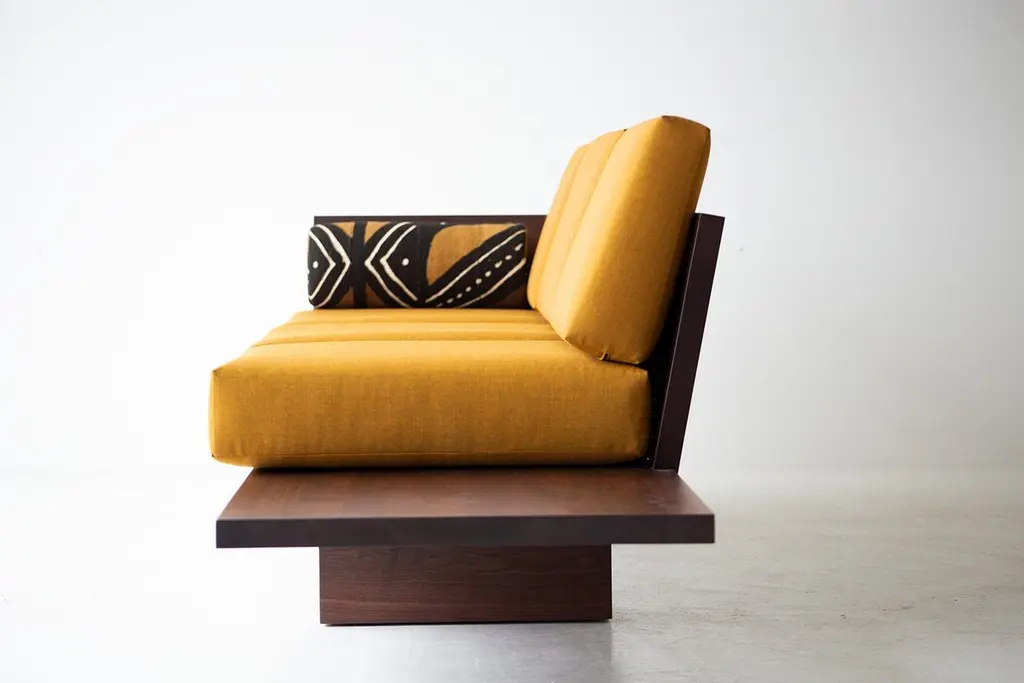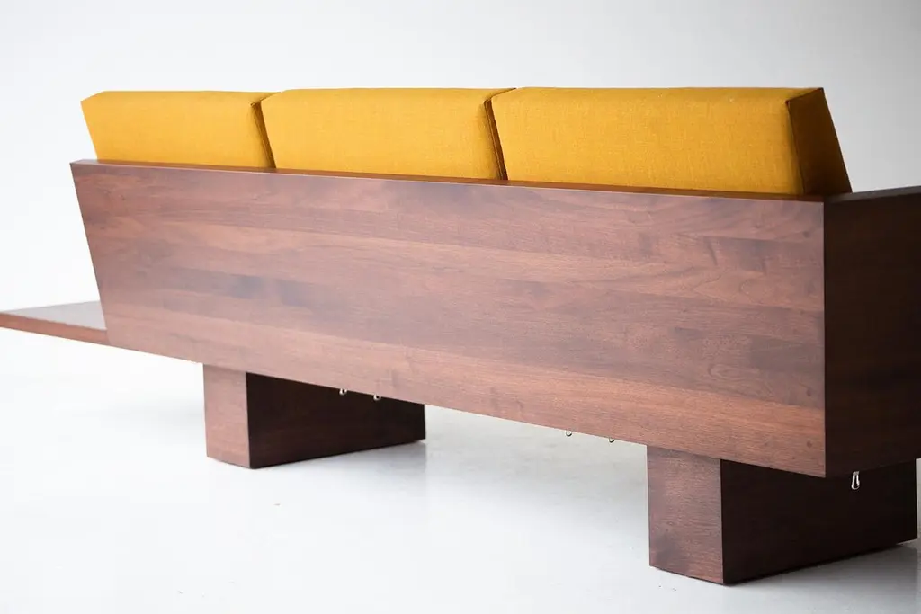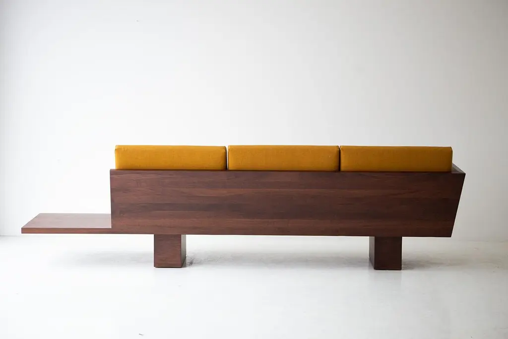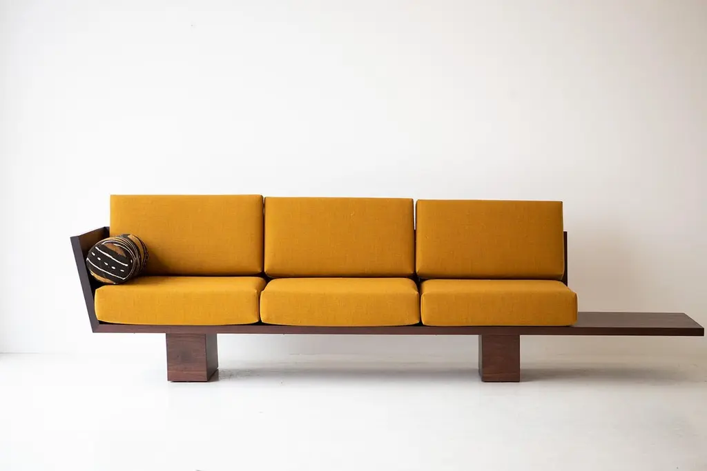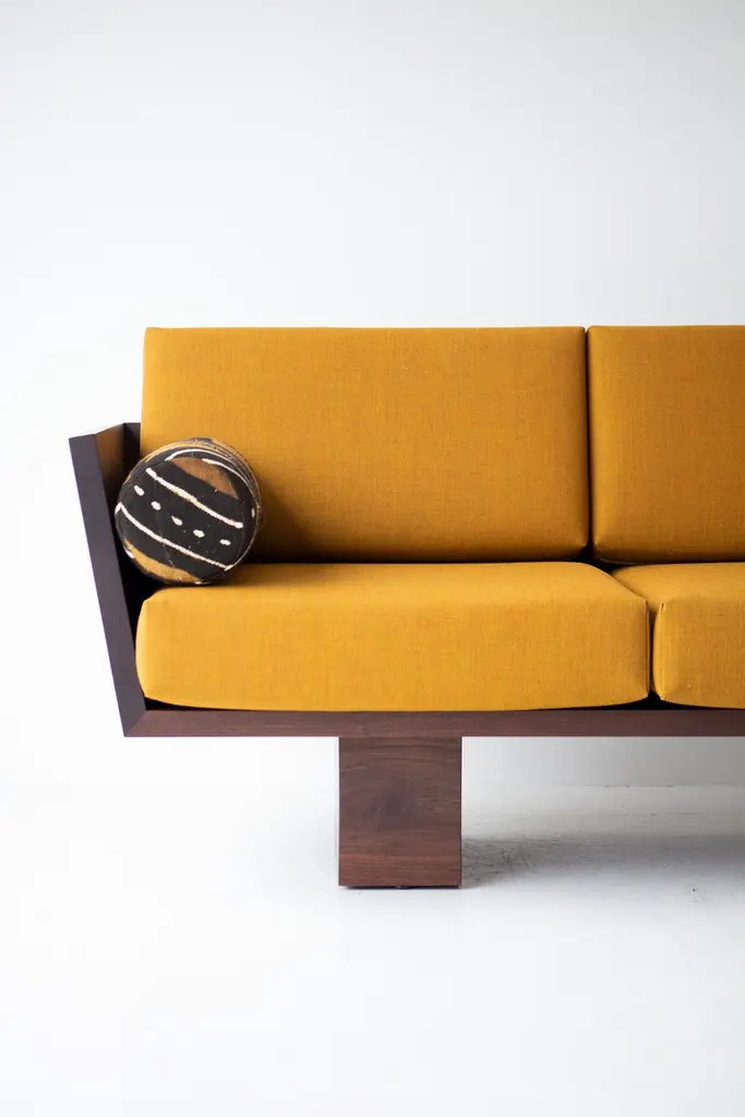 This Suelo® Modern Wood sofa in solid walnut is beautifully constructed from solid wood in Ohio, USA. The sofa's silhouette is simple, modern, and sleek with comfortable back and seat cushions. This is the perfect sofa for any space, indoor or outdoor. The Suelo® Collection consists of an arm chair, side chair, bench, daybed, loveseat, ottoman, dining chairs - both arm and side, and multiple orientations of sofas/sectionals for indoor or outdoor use. You can get any Suelo® piece in a solid or slatted version. This specific wood species is for indoor only; please contact for outdoor options. Price includes thick weave fabric and finish of your choice - natural, grey-wash, walnut, and black. Multiple fabric colors available.Designer Inspiration: "The Suelo® Collection was inspired by my love for travel. So many places that inspire me have very minimal furniture, often built-in sofas with big comfy cushions, hammocks, raw natural wood, etc. The feel is low-key, simple, and comfortable. The wood isn't refined, it just IS. Functionality always plays into my designs as well, represented here by lower seating for a more intimate talking or lounging environment, and the platform wood extension detail on the sofa, which makes a great little table for your drink or cell phone. I envision this furniture used for indoor/outdoor spaces or any room that needs some comfort or relief. The Suelo® line reminds me of your own getaway - it has a natural, cool vibe and doesn't take itself too seriously. I imagine the sofa loaded up with pillows and some music playing in the background, of course." -Gretta Jones specsPeriod/Model: New; ModernSpecs: Walnut, Commercial Grade FinishCustomizable: Yes! It's what we do :)DimensionsH: 31.5" W: 111"D: 31"Seat H: 16"Seat D: 21" with back cushion, 27" without.