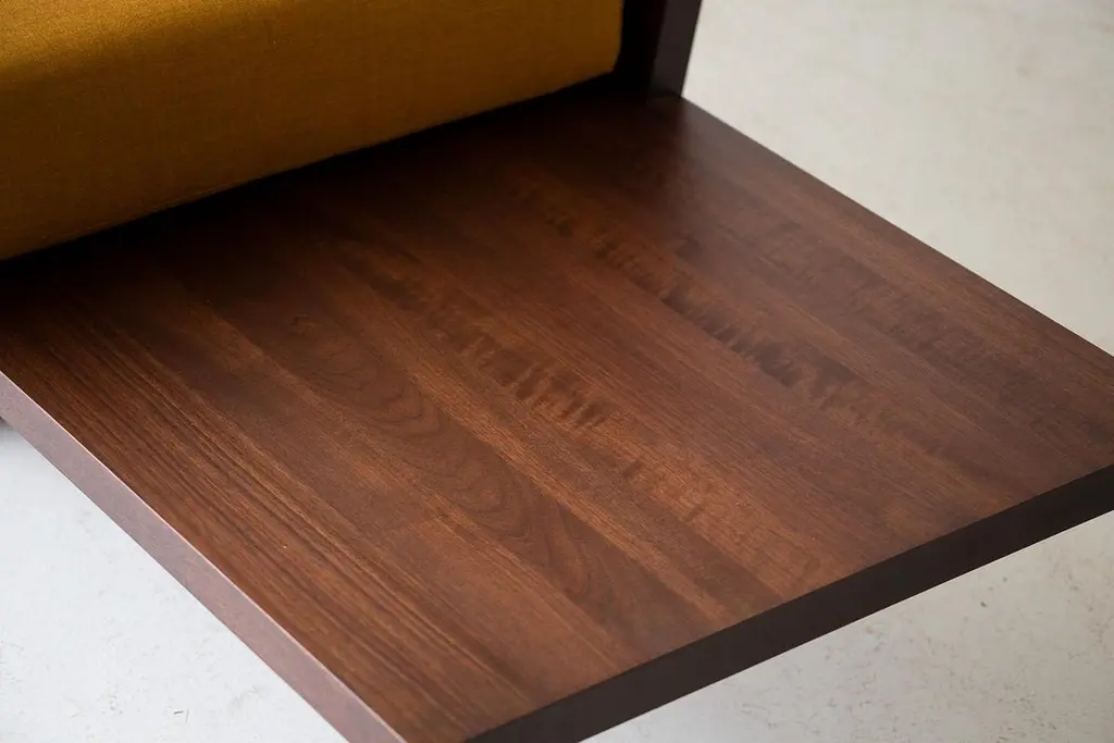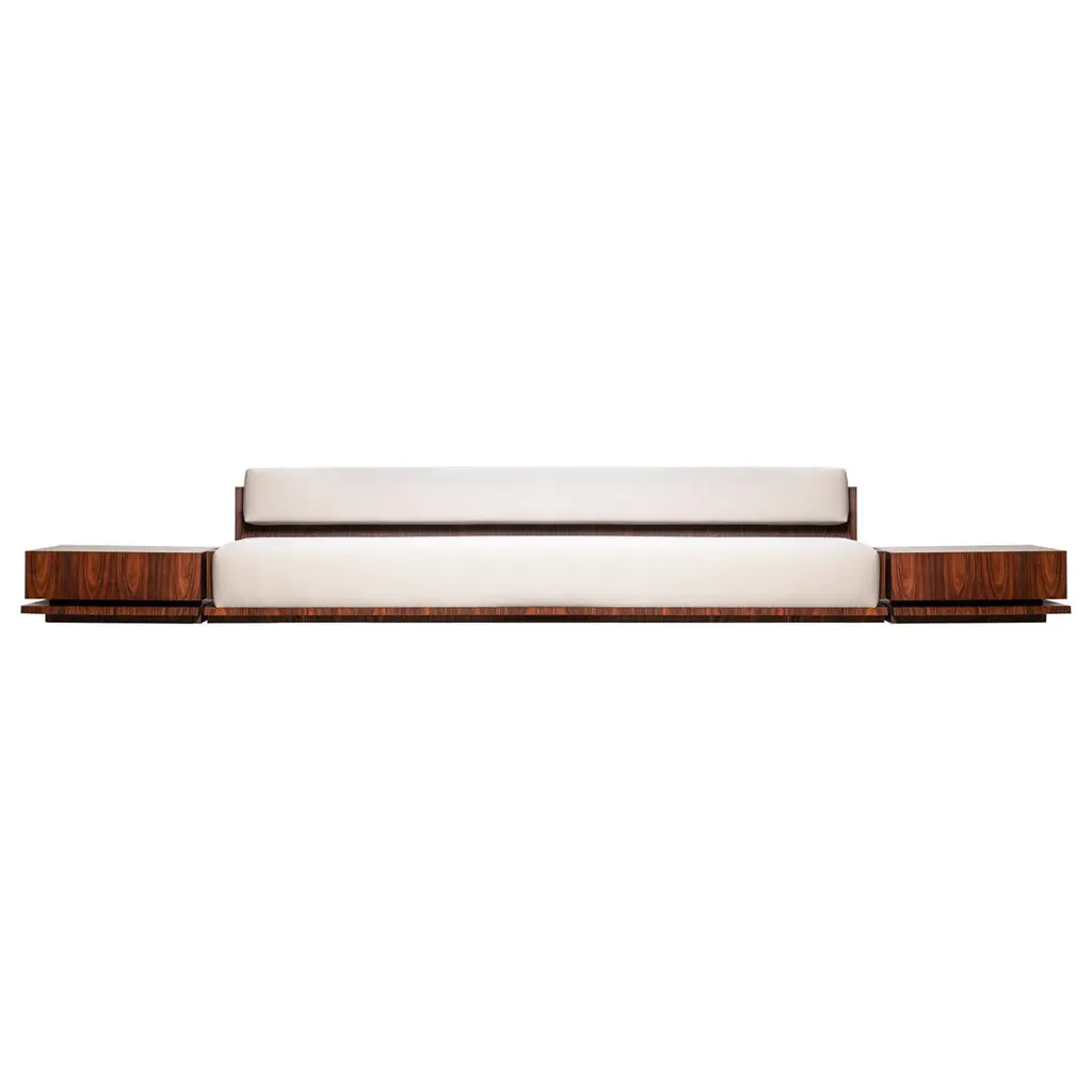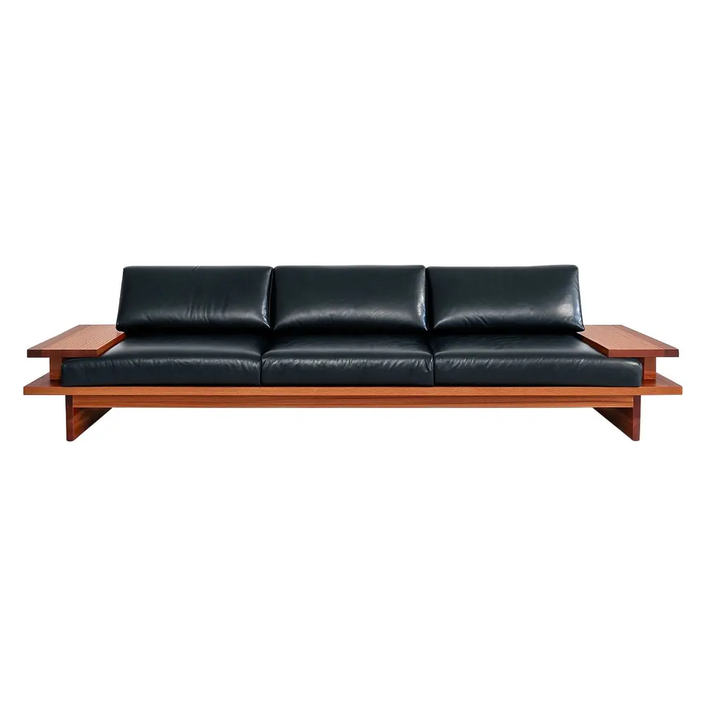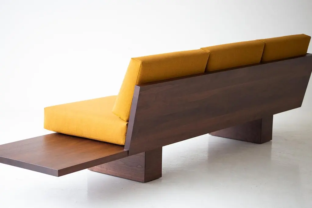 This Suelo® Modern Wood sofa in solid walnut is beautifully constructed from solid wood in Ohio, USA. The sofa's silhouette is simple, modern, and sleek with comfortable back and seat cushions. This is the perfect sofa for any space, indoor or outdoor. The Suelo® Collection consists of an arm chair, side chair, bench, daybed, loveseat, ottoman, dining chairs - both arm and side, and multiple orientations of sofas/sectionals for indoor or outdoor use. You can get any Suelo® piece in a solid or slatted version. This specific wood species is for indoor only; please contact for outdoor options. Price includes thick weave fabric and finish of your choice - natural, grey-wash, walnut, and black. Multiple fabric colors available.Designer Inspiration: "The Suelo® Collection was inspired by my love for travel. So many places that inspire me have very minimal furniture, often built-in sofas with big comfy cushions, hammocks, raw natural wood, etc. The feel is low-key, simple, and comfortable. The wood isn't refined, it just IS. Functionality always plays into my designs as well, represented here by lower seating for a more intimate talking or lounging environment, and the platform wood extension detail on the sofa, which makes a great little table for your drink or cell phone. I envision this furniture used for indoor/outdoor spaces or any room that needs some comfort or relief. The Suelo® line reminds me of your own getaway - it has a natural, cool vibe and doesn't take itself too seriously. I imagine the sofa loaded up with pillows and some music playing in the background, of course." -Gretta Jones specsPeriod/Model: New; ModernSpecs: Walnut, Commercial Grade FinishCustomizable: Yes! It's what we do :)DimensionsH: 31.5" W: 111"D: 31"Seat H: 16"Seat D: 21" with back cushion, 27" without.