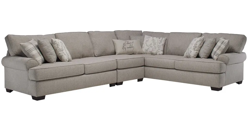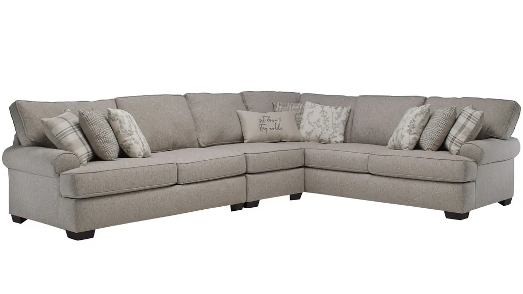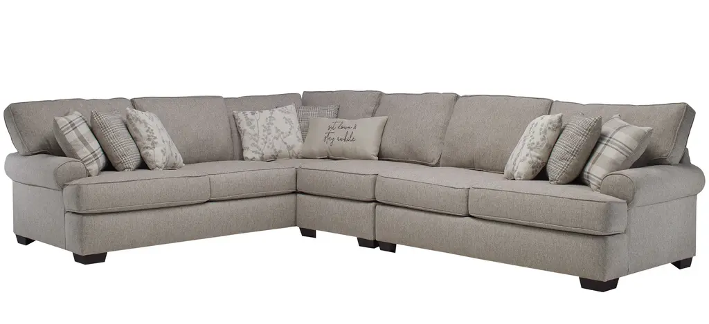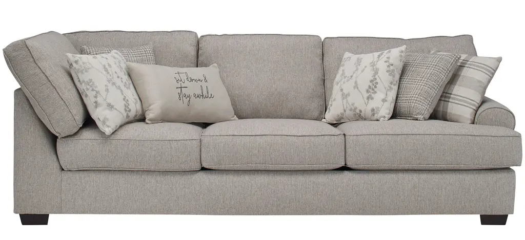 There is so much to love about the Suzanne sectional! With the casual elegance of a transitional design and featuring soft, neutral fabric, it's the perfect foundation for creating a warm and inviting atmosphere for your living room. The T cushions and loose back cushions are boxed and reversible, and the left arm facing sofa w/corner is just one configuration you can choose to fit your space and needs. Accent pillows in complementary patterns are the crowning touch.
