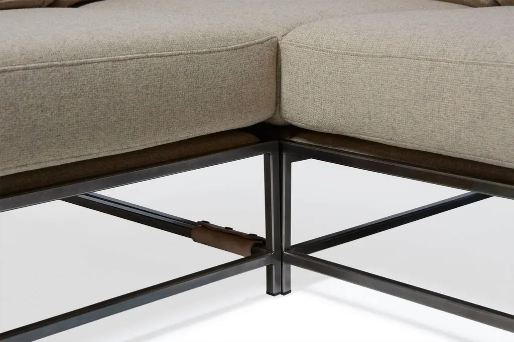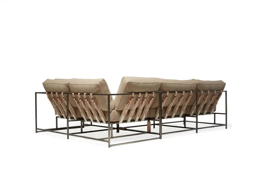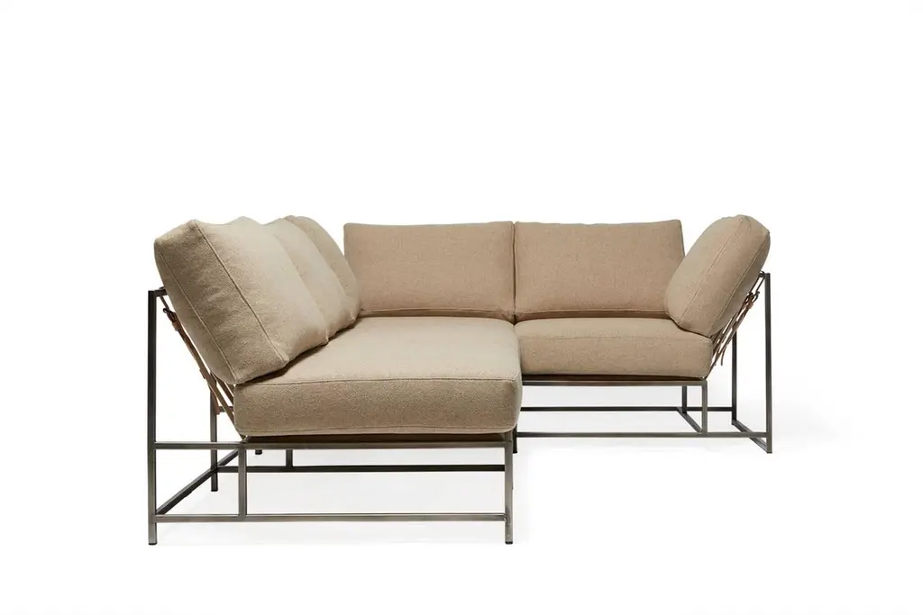 Our sectionals are great ways to customize your space and create the ultimate lounge spaces. This variation is upholstered in a warm tan wool. The foam seat cushions have been wrapped in polyfiber, allowing for a soft and comfortable lounge experience. Sitting atop an antique nickel plated steel frame, the piece has support belts featuring natural cotton webbing, natural veg tan leather, and antique nickel buckles.This variation of sectional is composed of an extra-small two seat sofa with a loveseat. Made in two pieces that can be fixed together easily, each piece can be used independently if desired.Dimensions: 100"W (long side), 76"W (return) x 38"D x 30"HEvery Stephen Kenn piece is made to order through our Los Angeles studio. We create these pieces utilizing a number of small businesses and fabricators in the LA area. We welcome inquiries about custom dimensions or custom material combinations to best fit your space and personal aesthetic.