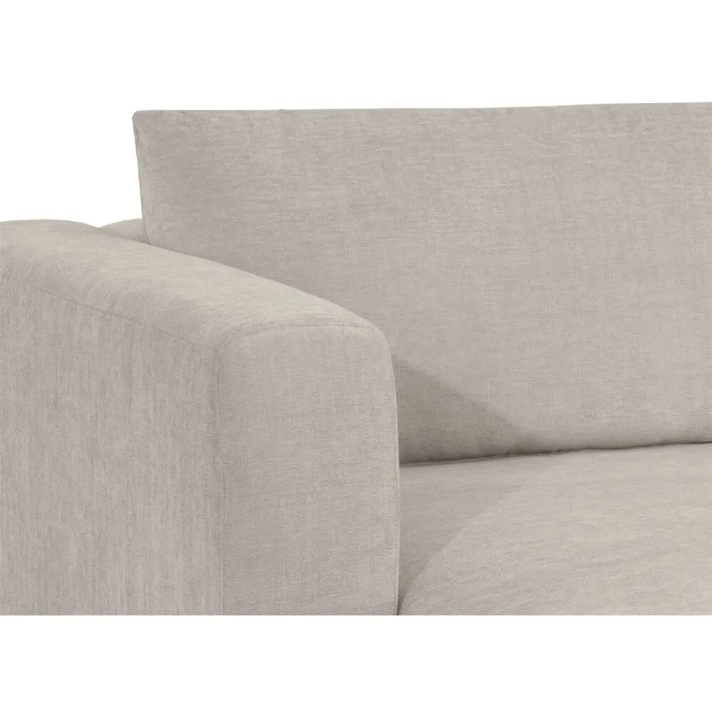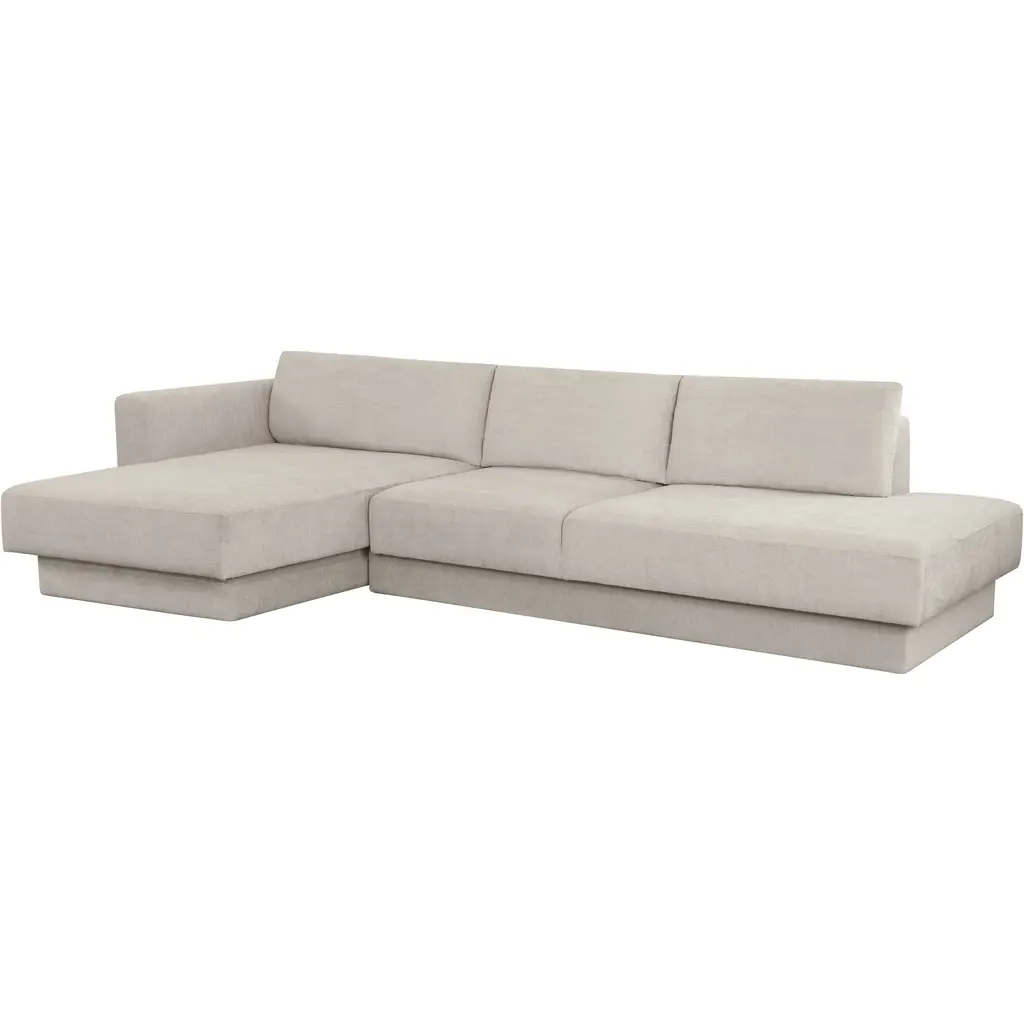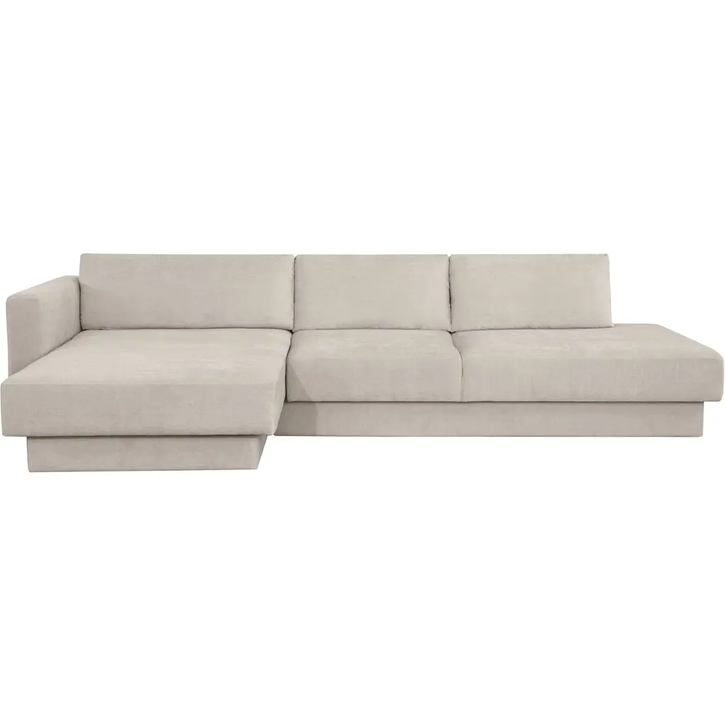 This contemporary sofa chaise features a low-profile design with a structured silhouette. A comfortable design with a left hand facing chaise. Stocked in danny cream and navy fabric. Also available with a right hand facing chaise.