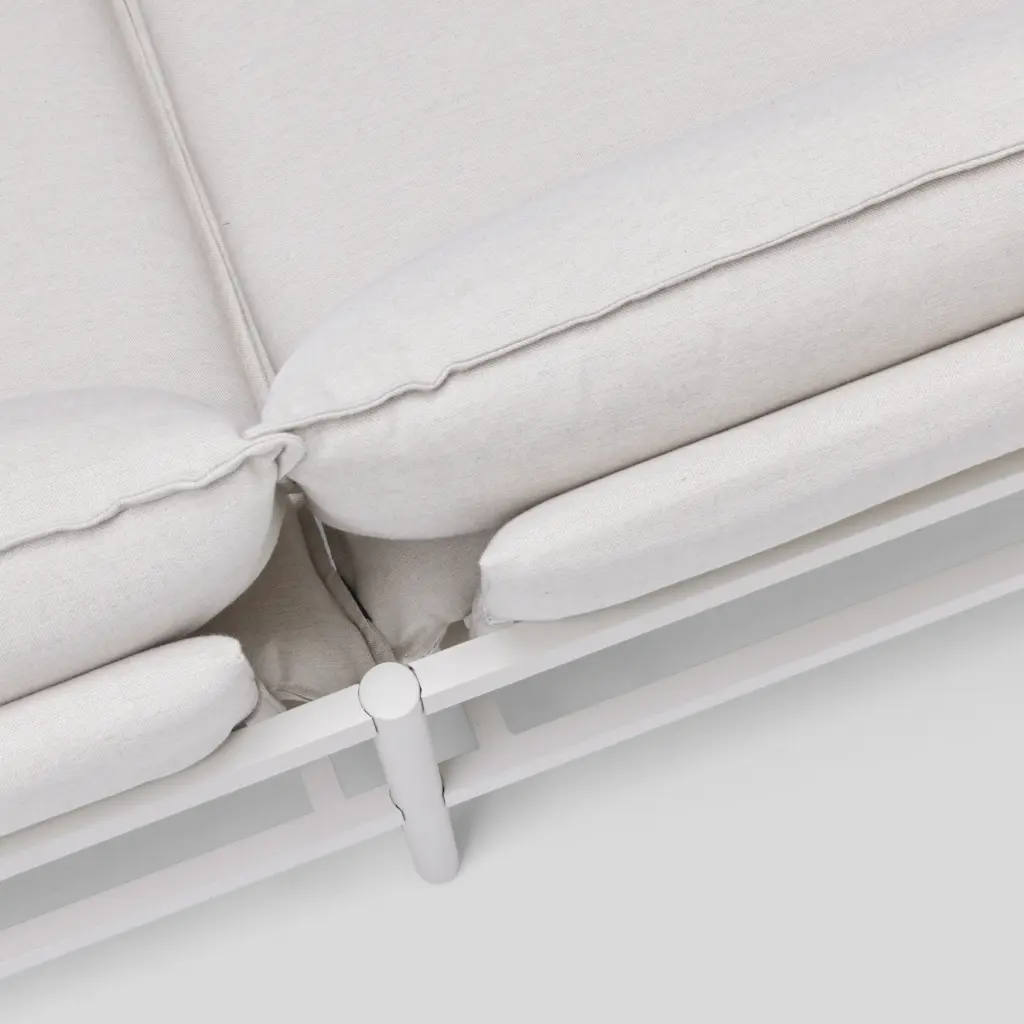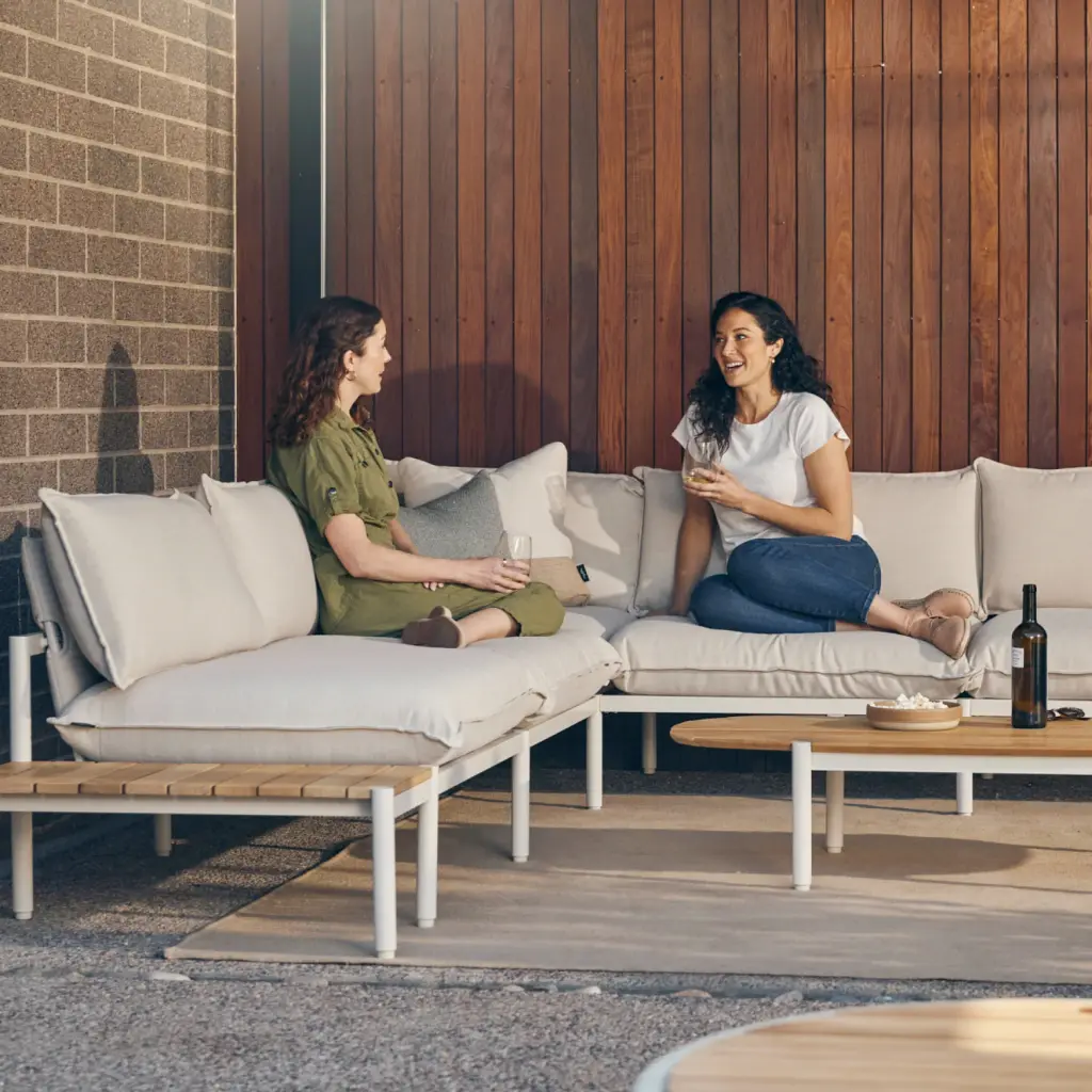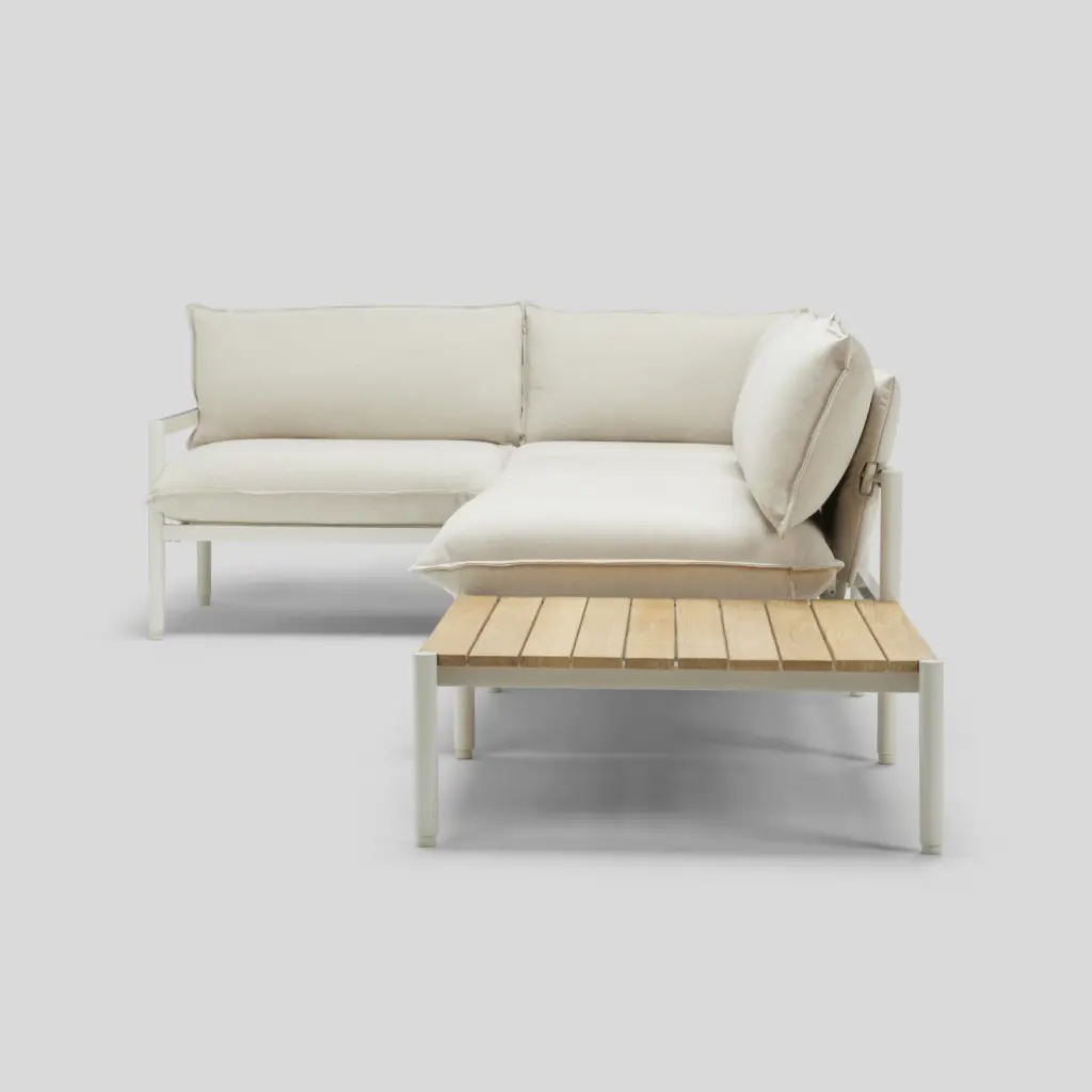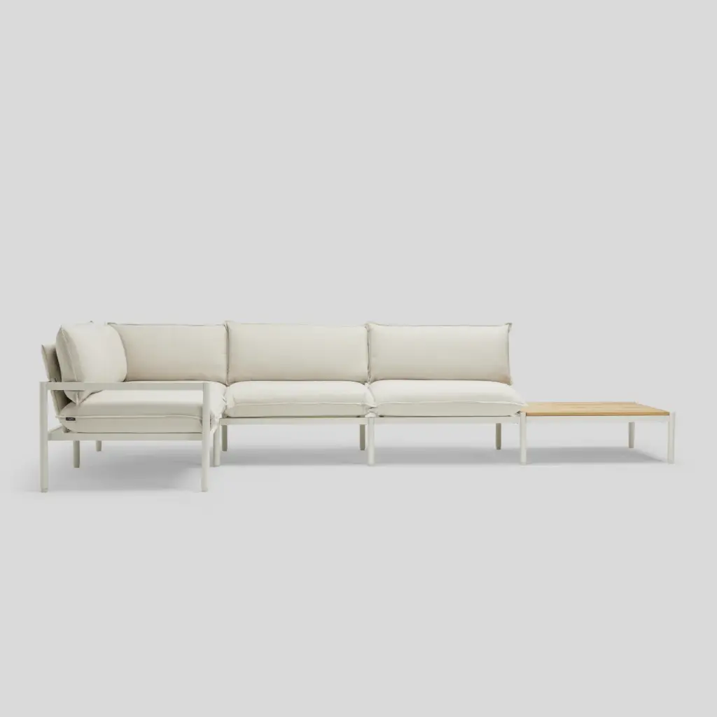 The Terra lounge collection gives you our highest level of outdoor comfort yet. Easy to clean and designed to last in all weather, it’s made with a matte-finish aluminum frame and recycled Sunbrella® fabric made exclusively for Neighbor. This combination includes a small or large In-line table that can fit between two modules or as an attached end table.