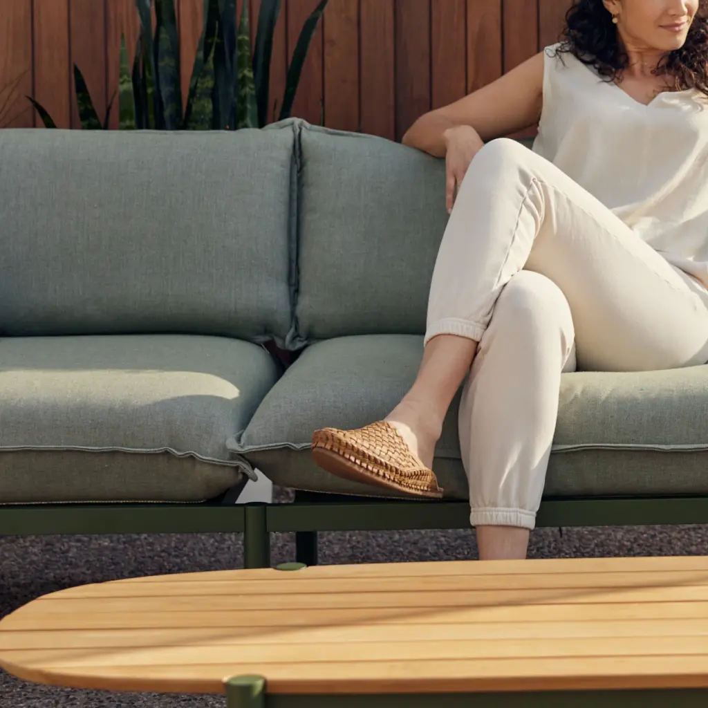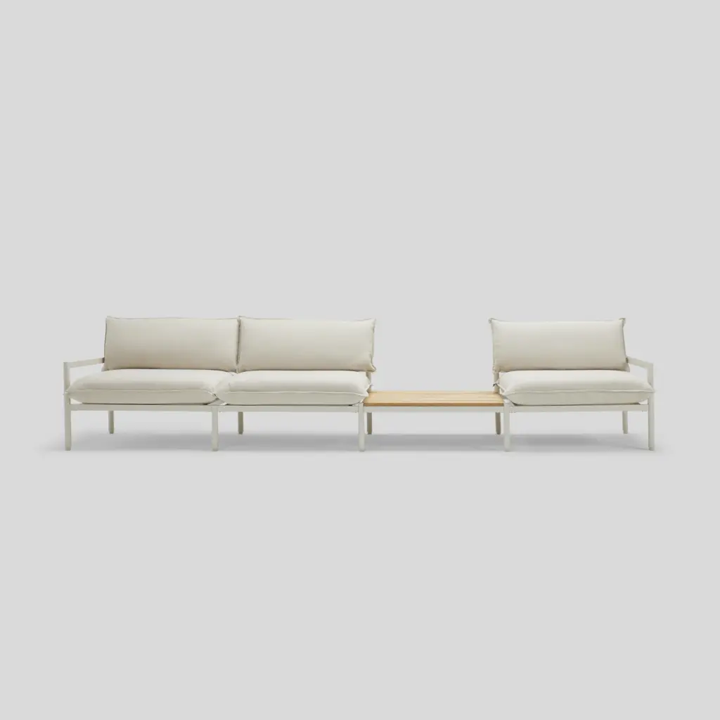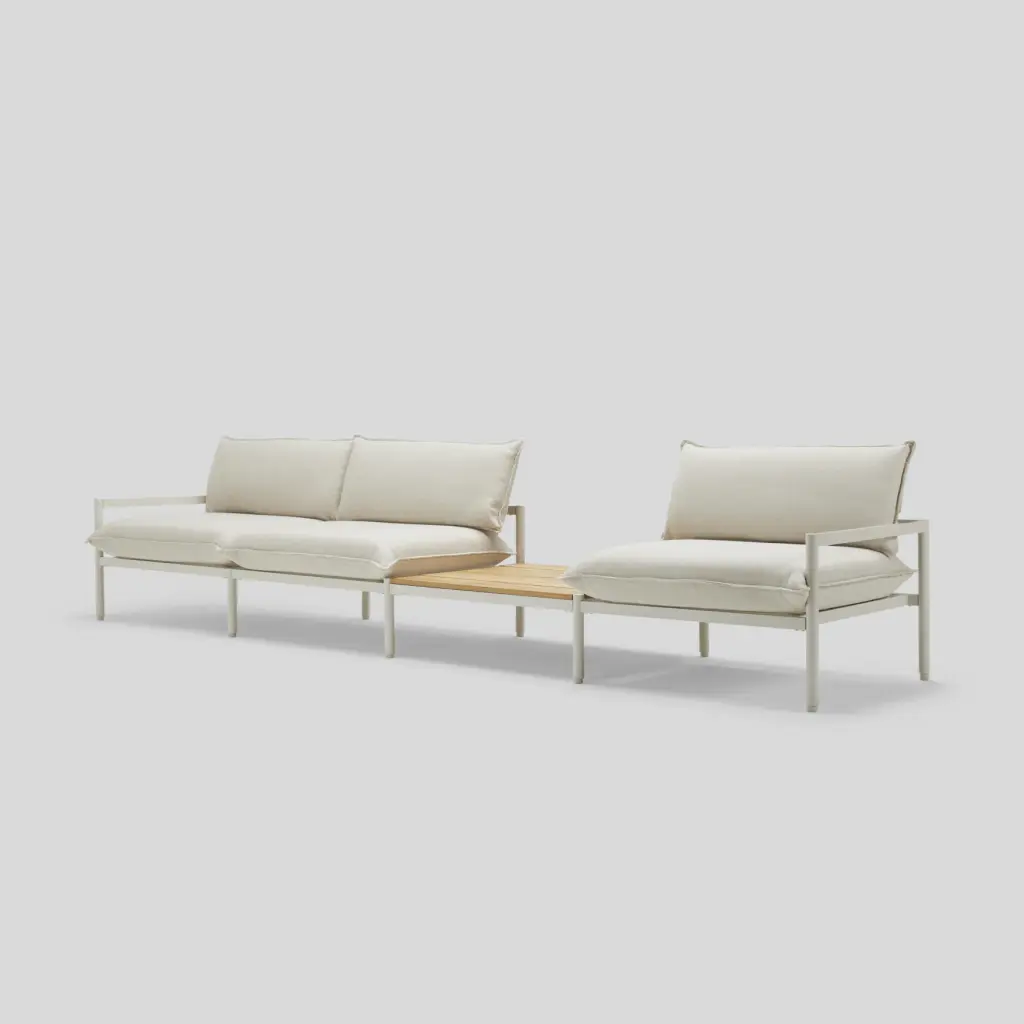 The Terra lounge collection gives you our highest level of outdoor comfort yet. Easy to clean and designed to last in all weather, it’s made with a matte-finish aluminum frame and recycled Sunbrella® fabric made exclusively for Neighbor. This combination includes a small or large In-line table that can fit between two modules or as an attached end table.
