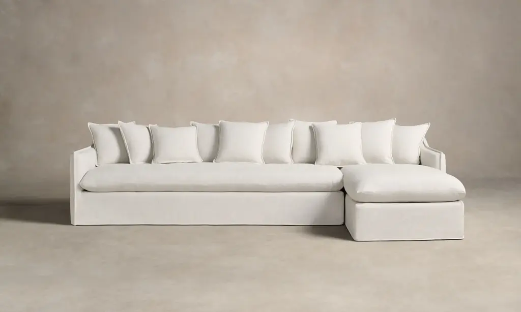 The Dune Sectional is a vision of effortlessness and ease. It boasts a deep seat, plush cushioning, and relaxed slipcover with hand-sewn flange seams for an elegant finish. Handcrafted in North Carolina.