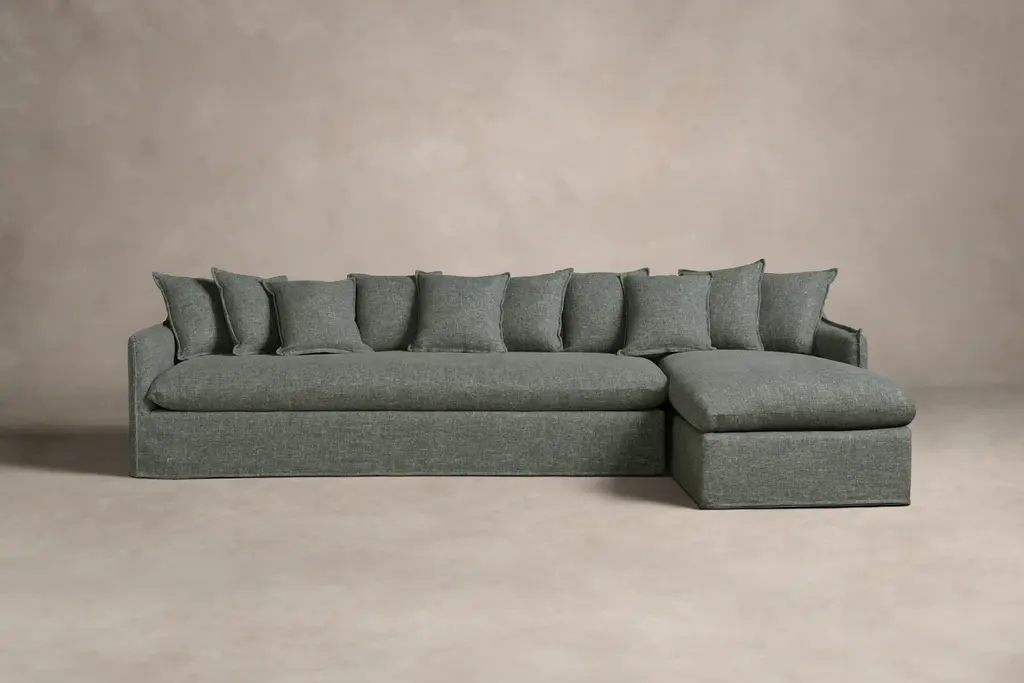 The Dune Sectional is a vision of effortlessness and ease. It boasts a deep seat, plush cushioning, and relaxed slipcover with hand-sewn flange seams for an elegant finish. Handcrafted in North Carolina.