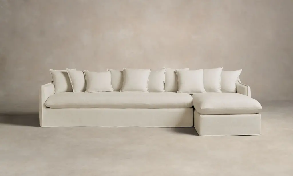 The Dune Sectional is a vision of effortlessness and ease. It boasts a deep seat, plush cushioning, and relaxed slipcover with hand-sewn flange seams for an elegant finish. Handcrafted in North Carolina.