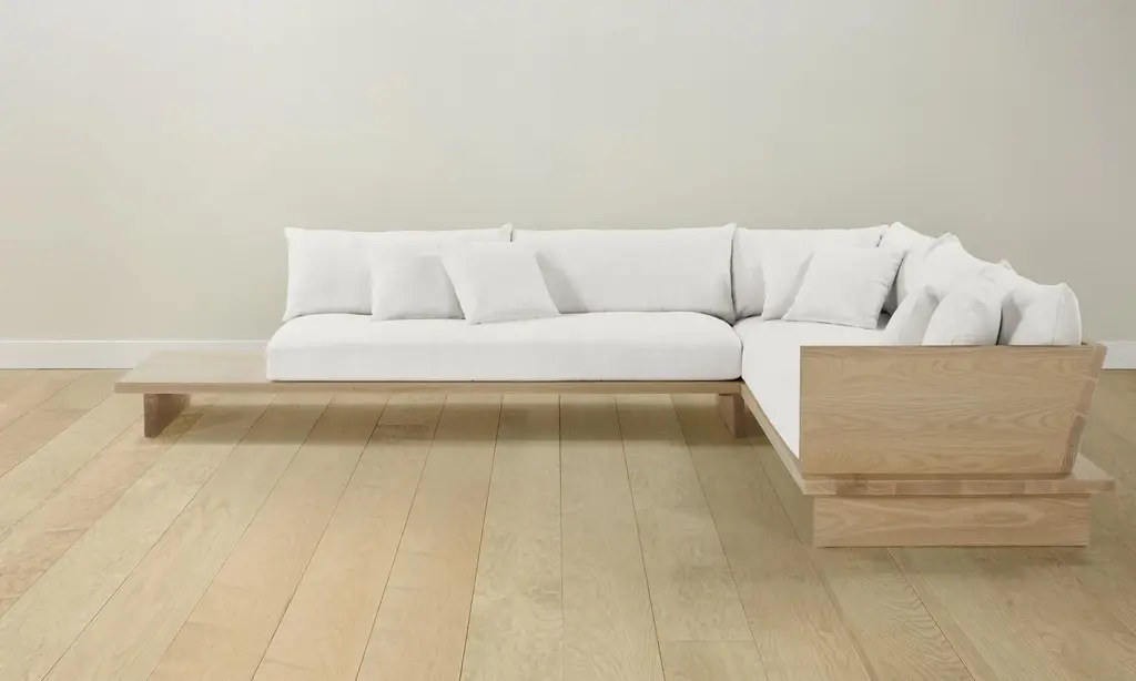 From the woodwork to the tailoring, every element of the Muir Sectional is a display of exquisite artisanship. Its angular frame extends beyond the seat cushion, allowing space for decorative objects or necessities. Handcrafted in North Carolina.