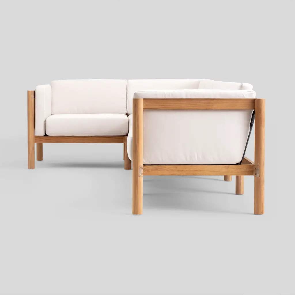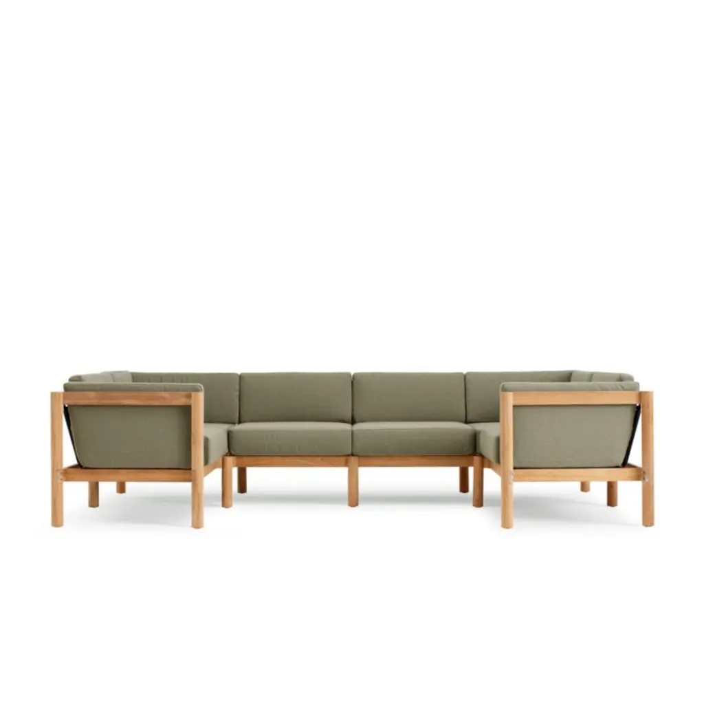 A solid teak wood frame and roped back lend a modern silhouette to cushioned armrests, quick-drying foam, and life-proof Sunbrella fabric. The Haven collection can be customized to fit any space thanks to its modular design. Intended for lounging, pair with our teak outdoor coffee table for the perfect outdoor living room.