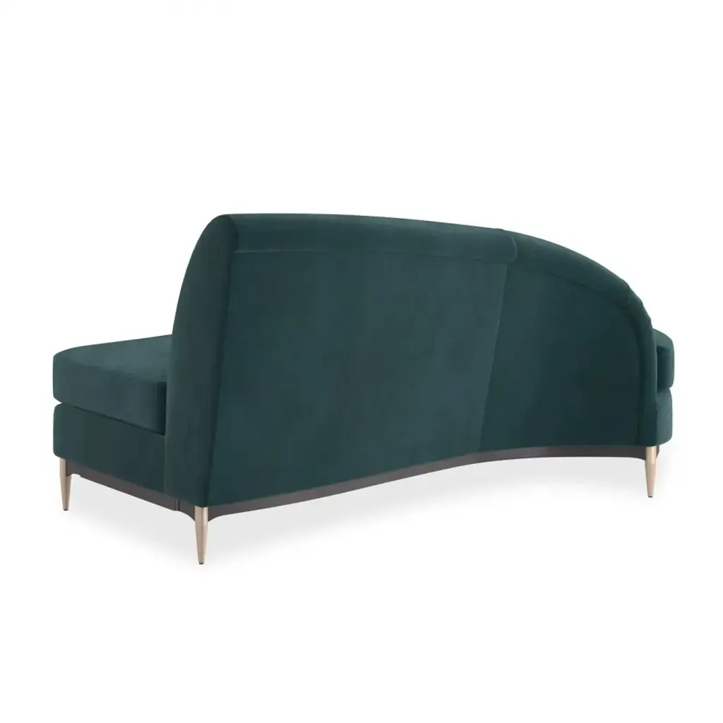 This regal sectional makes a dramatic showpiece that emanates glamour. Upholstered in a dark peacock blue velvet, its curved profile is complemented by sumptuous comfort. Reflecting the gracious elegance of the Hollywood Regency era, it features a shapely back button-tufted with vertical, cuff link-inspired gold metal bars. Its lower edge and outer arms are trimmed in Almost Black while its metal tapered feet are finished in Champagne Gold. Artful from edge to edge, this statement piece creates drama wherever it goes.