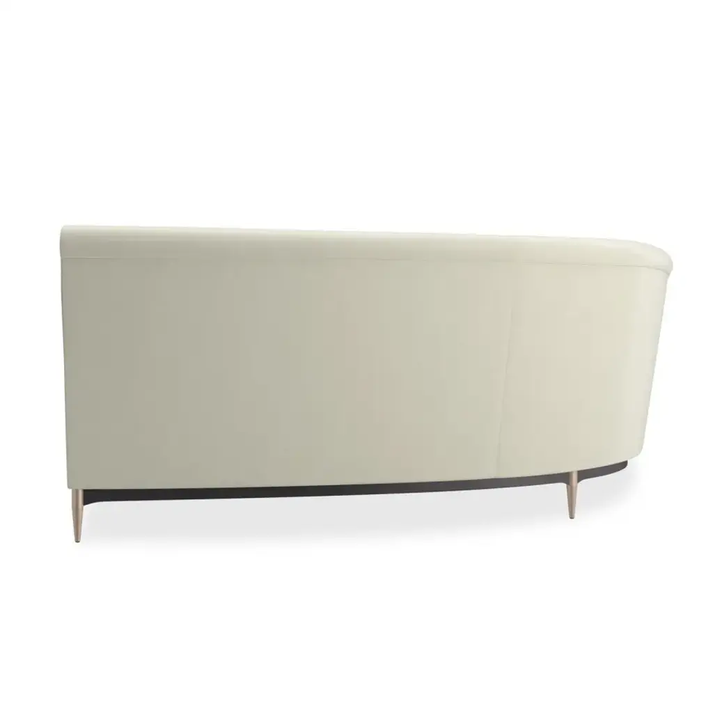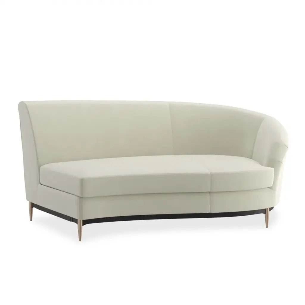 This regal sectional makes a dramatic showpiece that emanates glamour. Upholstered in velvet, its curved profile is complemented by sumptuous comfort. Reflecting the gracious elegance of the Hollywood Regency era, it features a shapely back button-tufted with vertical, cuff link-inspired gold metal bars. Its lower edge and outer arms are trimmed in Almost Black while its metal tapered feet are finished in Champagne Gold. Artful from edge to edge, this statement piece creates drama wherever it goes.