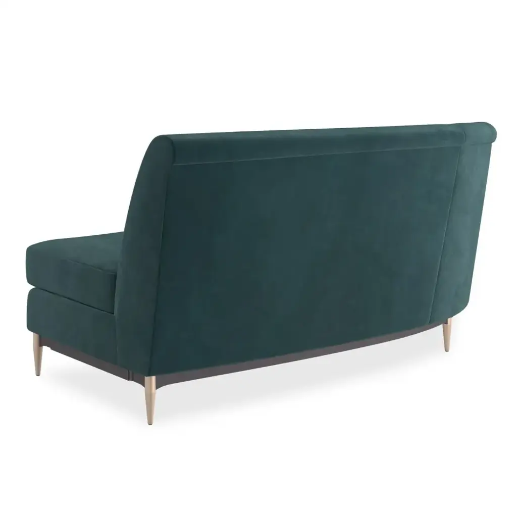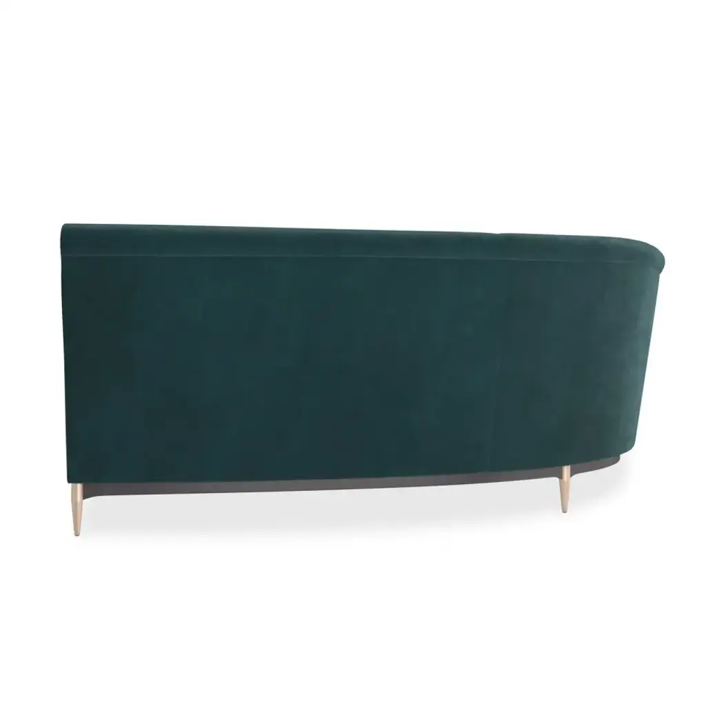This regal sectional makes a dramatic showpiece that emanates glamour. Upholstered in a dark peacock blue velvet, its curved profile is complemented by sumptuous comfort. Reflecting the gracious elegance of the Hollywood Regency era, it features a shapely back button-tufted with vertical, cuff link-inspired gold metal bars. Its lower edge and outer arms are trimmed in Almost Black while its metal tapered feet are finished in Champagne Gold. Artful from edge to edge, this statement piece creates drama wherever it goes.