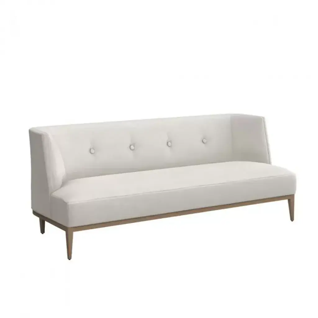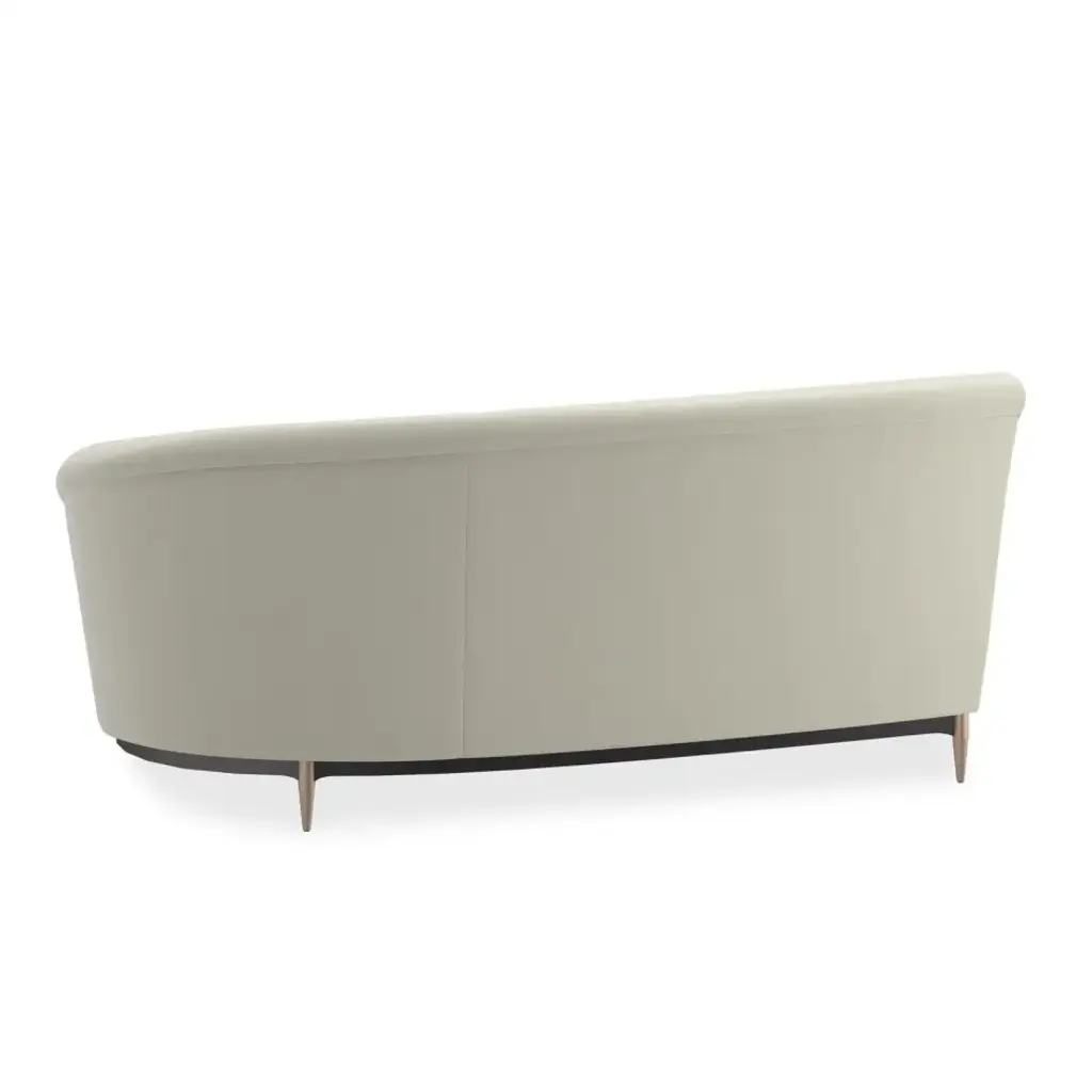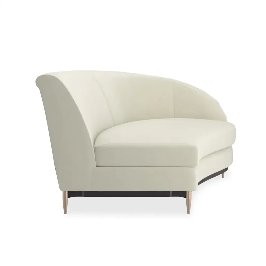 This regal sectional makes a dramatic showpiece that emanates glamour. Upholstered in velvet, its curved profile is complemented by sumptuous comfort. Reflecting the gracious elegance of the Hollywood Regency era, it features a shapely back button-tufted with vertical, cuff link-inspired gold metal bars. Its lower edge and outer arms are trimmed in Almost Black while its metal tapered feet are finished in Champagne Gold. Artful from edge to edge, this statement piece creates drama wherever it goes.