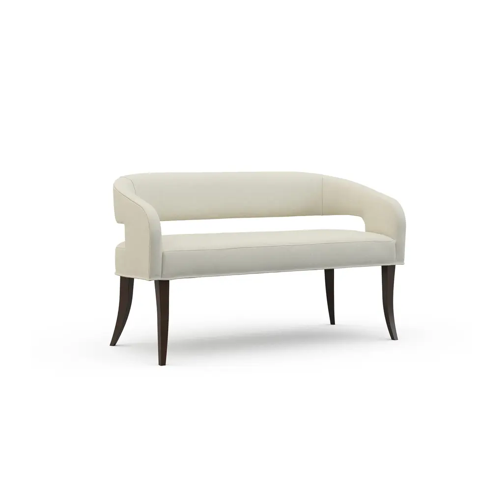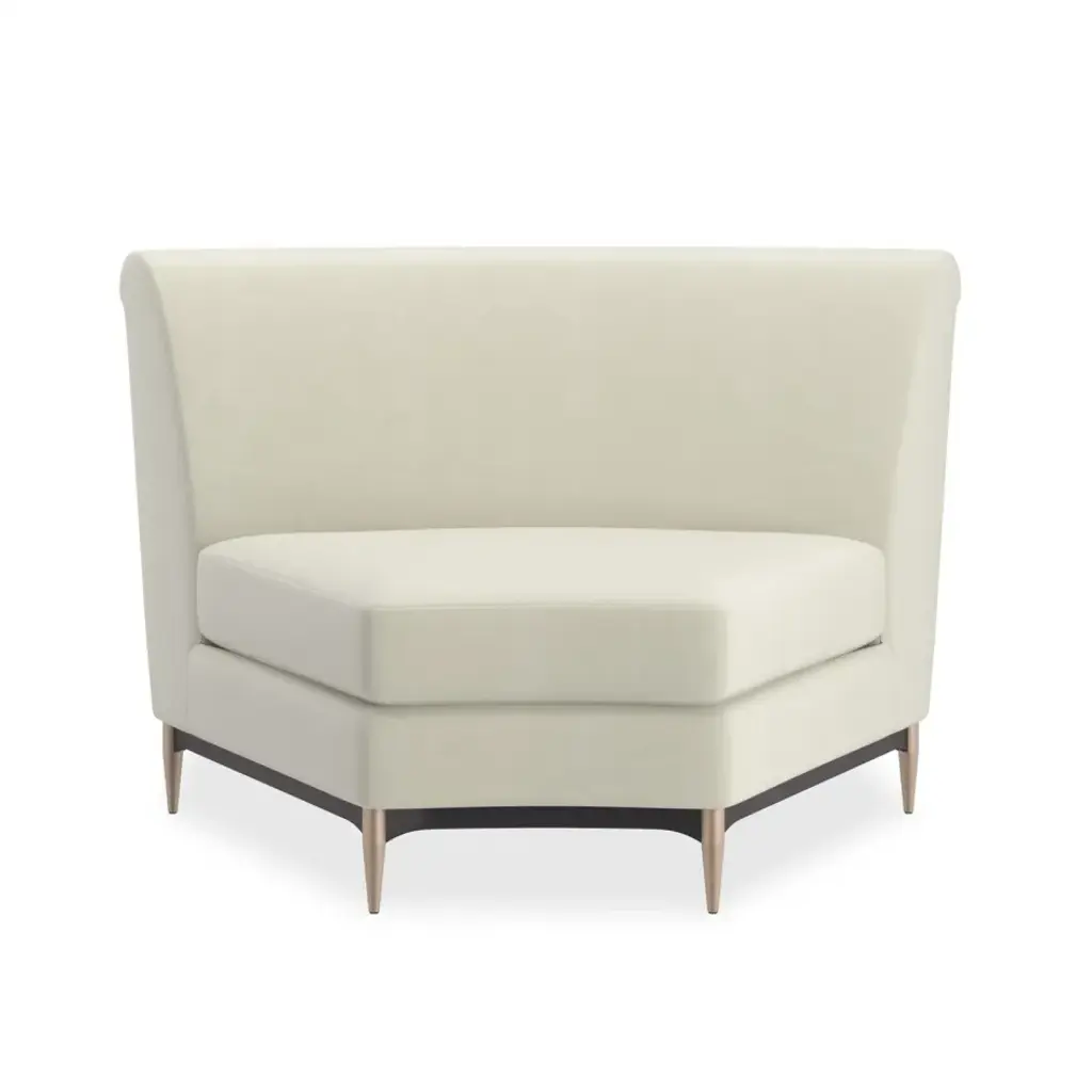 This regal sectional makes a dramatic showpiece that emanates glamour. Upholstered in velvet, its curved profile is complemented by sumptuous comfort. Reflecting the gracious elegance of the Hollywood Regency era, it features a shapely back button-tufted with vertical, cuff link-inspired gold metal bars. Its lower edge and outer arms are trimmed in Almost Black while its metal tapered feet are finished in Champagne Gold. Artful from edge to edge, this statement piece creates drama wherever it goes.