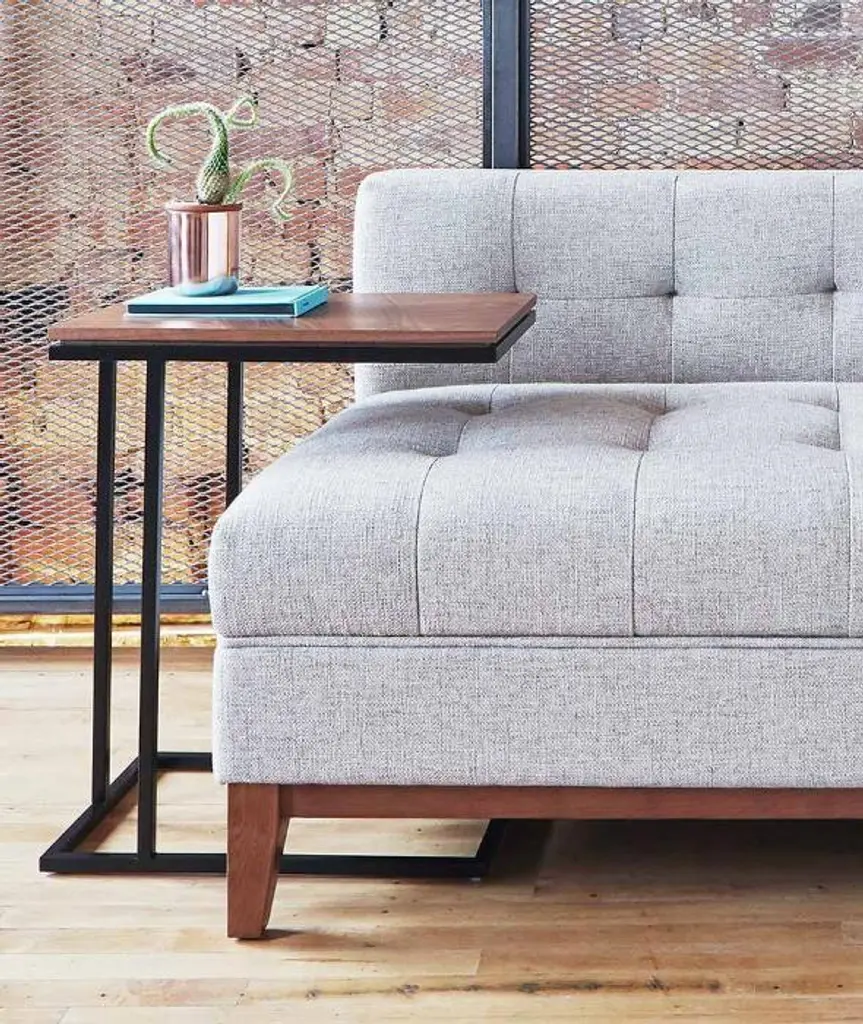 The Tobias Nesting Table is a minimalist, geometric accent piece well suited for modern spaces. The top features a dynamic arrangement of walnut wood grain panels, which rest on a slim, solid steel base. The table is designed to nest into your sectional or sofa to create a handy surface for your snacks or smart devices.