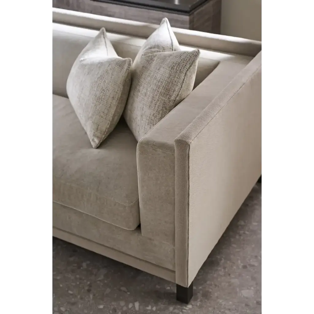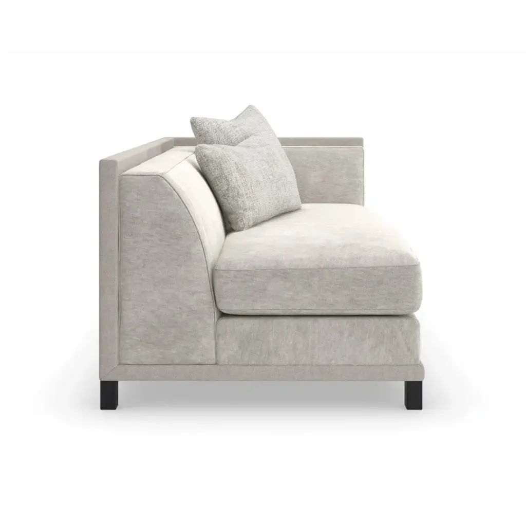 A fashionable component of our classic shelter arm sectional, with clean lines and crisp tailoring in a fresh neutral colorway. Impeccably dressed, its sophisticated silhouette is punctuated by a faux mohair opal fabric on the inside, and a textured woven wrapping the back. Metal legs in brushed deep bronze add warmth and a dashing finish, complemented by accentuating toss pillows in a tactile tonal mix.