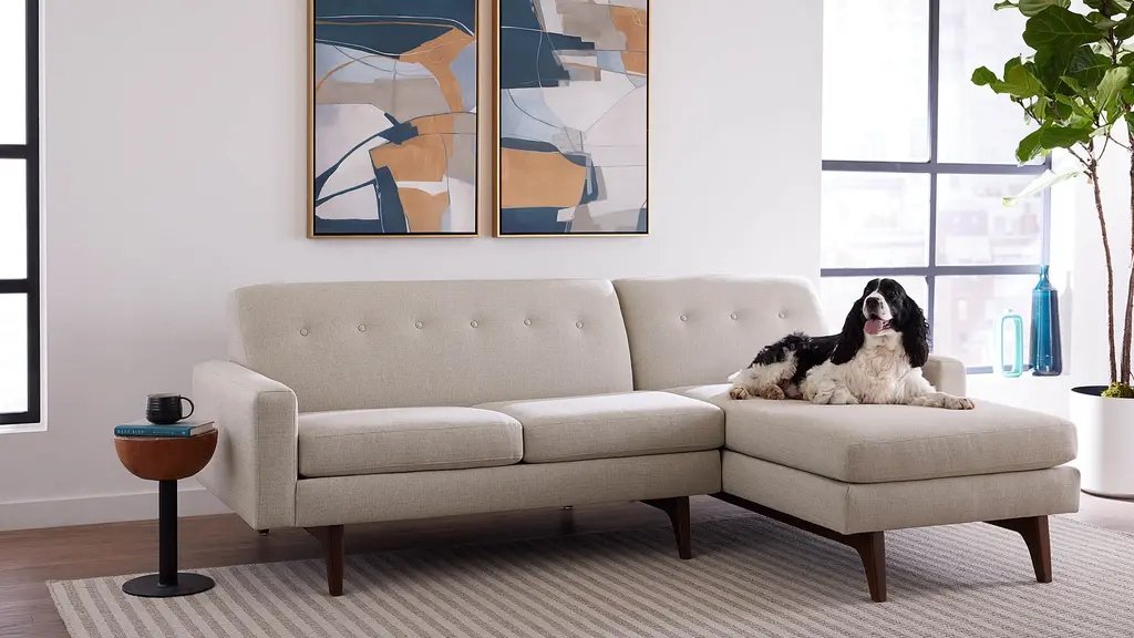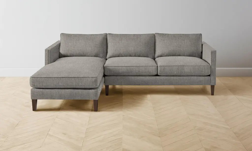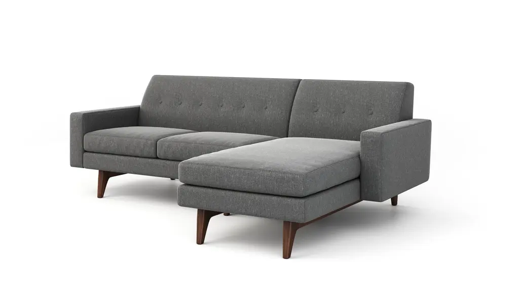 DESIGN Simply modern and slightly classic, the Tyler collection is a versatile choice for just about any space. This design has clean lines, low profile wrap-around side, tufted buttons, and an eye-catching exposed leg detail. Handcrafted in the United States. FEATURES Solid Foundation: Our frames are constructed from precision-cut, FSC-certified engineered wood for unmatched strength and stability, featuring reinforced, interlocking joinery for added durability. Customizable Cushion Options: Choose from standard or down alternative cushions. Standard cushions offer our most supportive sit and a sleek, tailored look that requires minimal fluffing. These cushions feature high-quality, high-resiliency CertiPUR-US® foam core seats wrapped in premium fiber with a high-density foam tight-back cushion. Down alternative cushions deliver our most relaxed yet supportive sit, with a more casual look that requires moderate fluffing. These cushions feature high-quality, high-resiliency CertiPUR-US® foam core seats wrapped in plush down-alternative fiber with a high-density foam tight-back cushion. CertiPur-US® foam is held to the highest standards of product safety and durability, so you can rest easy. Supportive Webbing Suspension: Designed to maximize comfort, our premium webbing system provides a resilient foundation. Customizable Upholstery: Choose from a vast selection of durable premium and performance fabrics and genuine Italian leather to personalize your Tyler Sofa with Chaise's look.