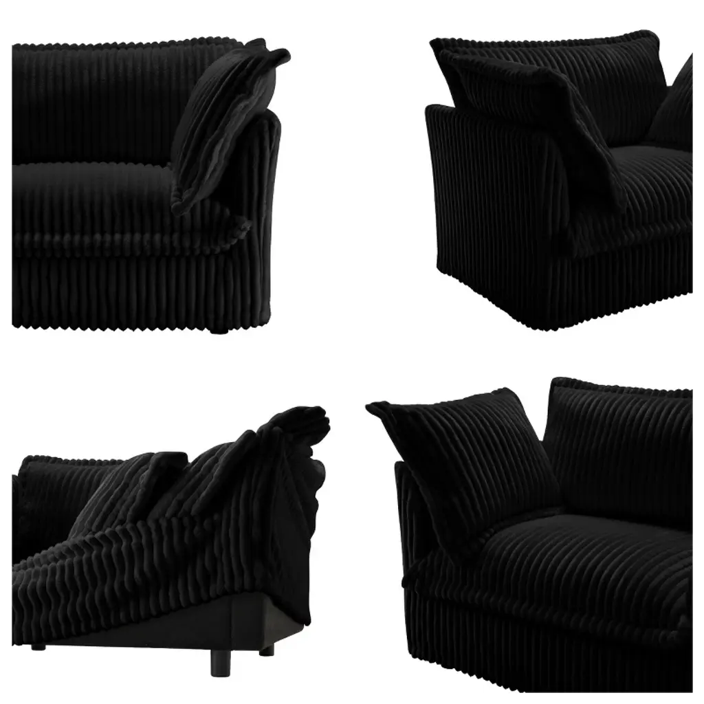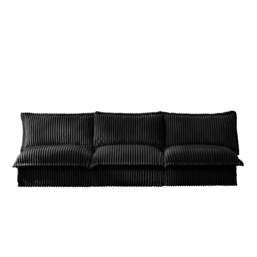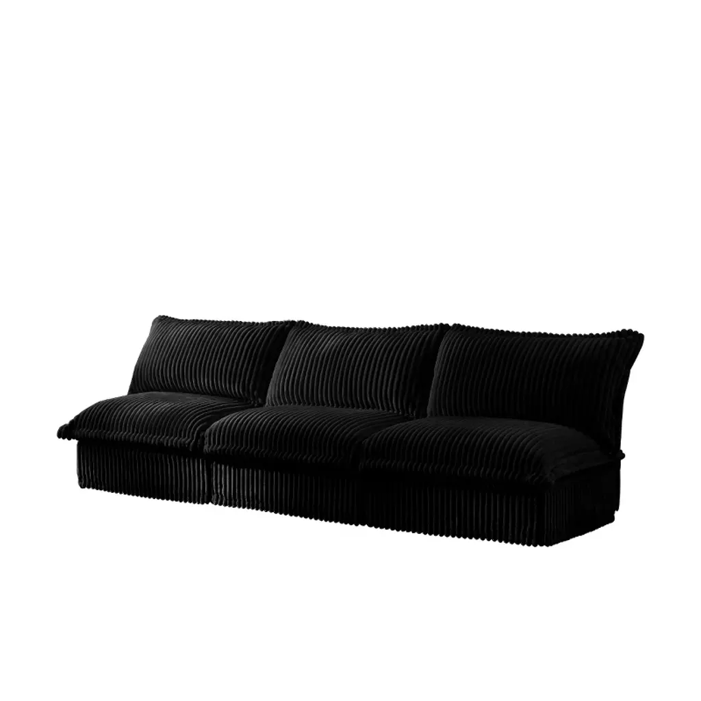 This modern armless 3-seater modular sofa blends comfort, flexibility, and visual appeal in a thoughtfully designed piece. Upholstered in sleek black corduroy fabric, it introduces a soft texture and a deep, rich tone that can complement a wide range of interior styles. The ribbed surface of the corduroy adds subtle visual interest, while the breathable nature of the fabric enhances the overall comfort for everyday lounging. Each seat is designed with a deep profile, high back pillows, and thick cushions made from premium sponge and cotton filling, offering a balanced mix of softness and support. Whether used for reading, relaxing, or hosting, the sofa encourages extended periods of comfort. The modular design invites creative arrangements, enabling users to adjust the layout according to their space needs or personal preferences. With the option to combine with additional modules or ottomans, the sofa can transform into various configurations, including sectionals or extended seating setups. The sofa’s construction reflects a balance of style and practicality. Subtle design details such as a cascading hem and carefully placed stitching contribute to its refined appearance. The removable slipcovers allow for easy cleaning and are crafted to retain their softness through multiple washes, making this sofa a fitting choice for active households. The sturdy wooden frame is built to handle daily use, and the assembly process is streamlined with clear instructions that simplify setup. Cushions arrive vacuum-packed for efficient delivery and expand to their full shape after a short resting period. With its deep seating, versatile structure, and customizability, this sofa offers a comfortable and adaptable centerpiece for modern living spaces.