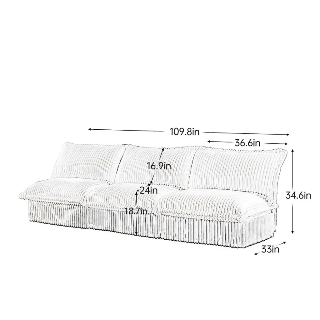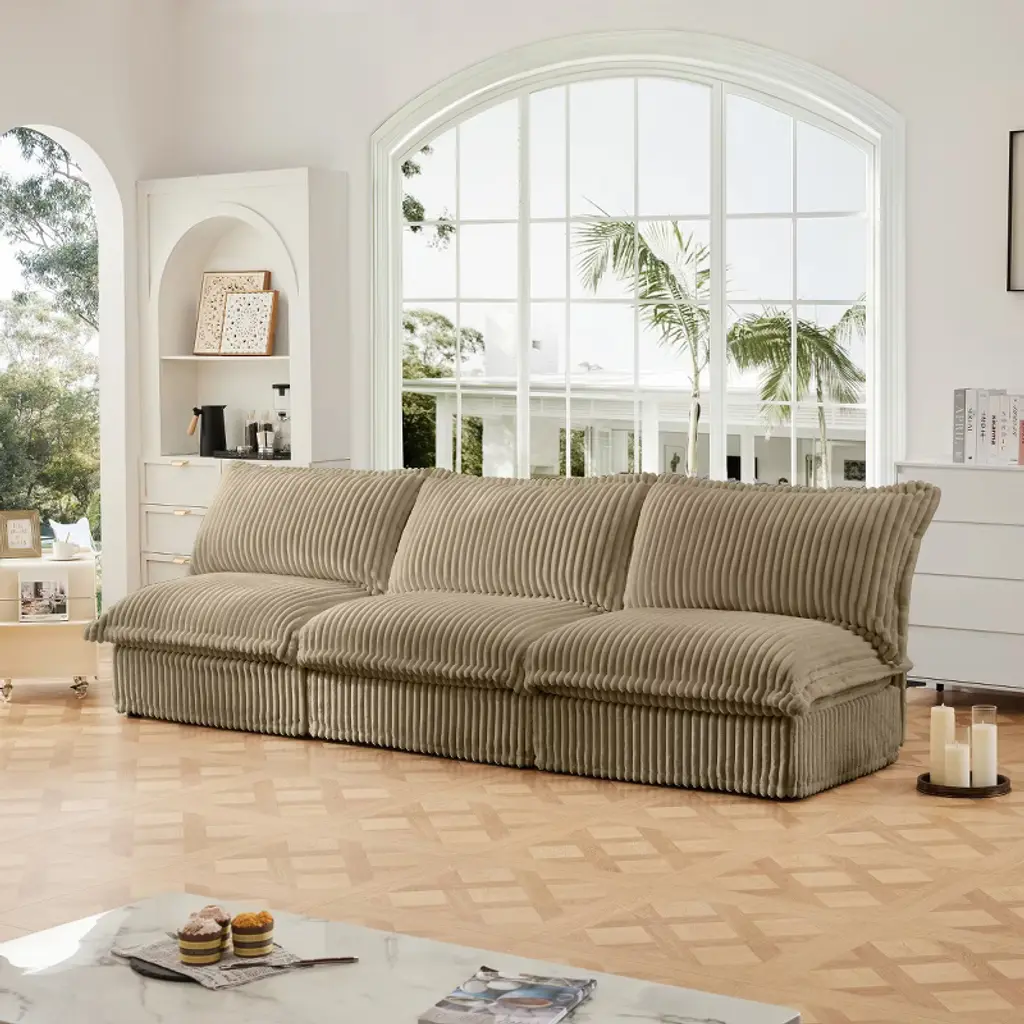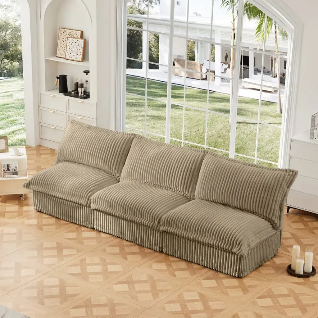 This modern armless 3-seater modular sofa blends comfort, flexibility, and visual appeal in a thoughtfully designed piece. Upholstered in sleek black corduroy fabric, it introduces a soft texture and a deep, rich tone that can complement a wide range of interior styles. The ribbed surface of the corduroy adds subtle visual interest, while the breathable nature of the fabric enhances the overall comfort for everyday lounging. Each seat is designed with a deep profile, high back pillows, and thick cushions made from premium sponge and cotton filling, offering a balanced mix of softness and support. Whether used for reading, relaxing, or hosting, the sofa encourages extended periods of comfort. The modular design invites creative arrangements, enabling users to adjust the layout according to their space needs or personal preferences. With the option to combine with additional modules or ottomans, the sofa can transform into various configurations, including sectionals or extended seating setups. The sofa’s construction reflects a balance of style and practicality. Subtle design details such as a cascading hem and carefully placed stitching contribute to its refined appearance. The removable slipcovers allow for easy cleaning and are crafted to retain their softness through multiple washes, making this sofa a fitting choice for active households. The sturdy wooden frame is built to handle daily use, and the assembly process is streamlined with clear instructions that simplify setup. Cushions arrive vacuum-packed for efficient delivery and expand to their full shape after a short resting period. With its deep seating, versatile structure, and customizability, this sofa offers a comfortable and adaptable centerpiece for modern living spaces.