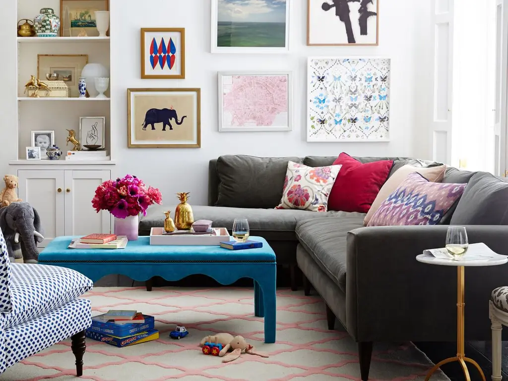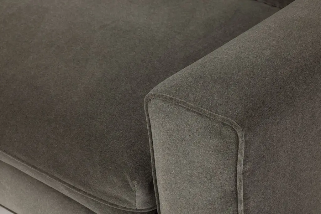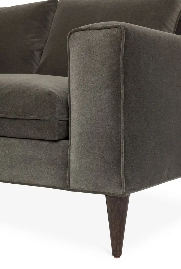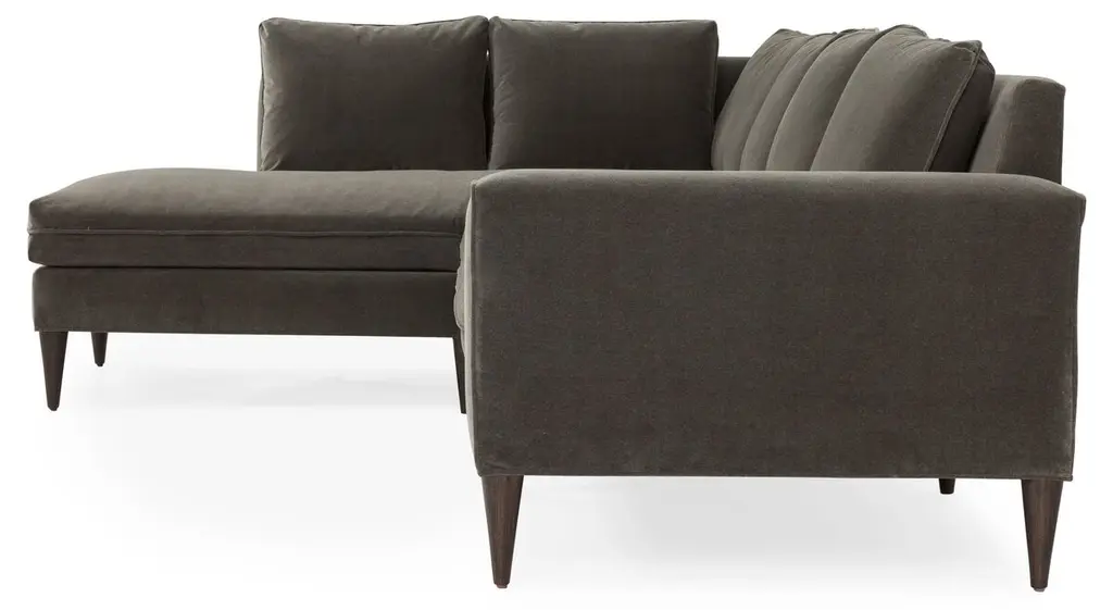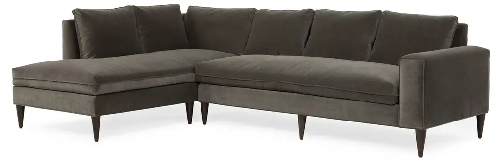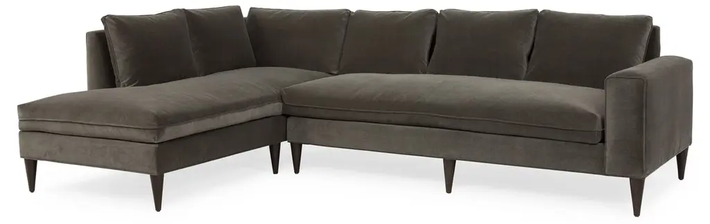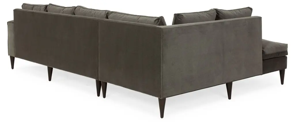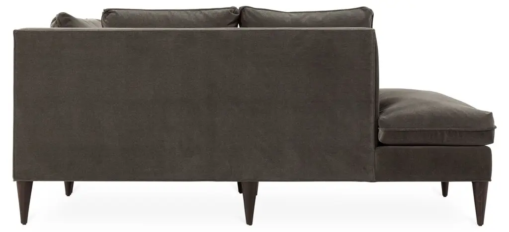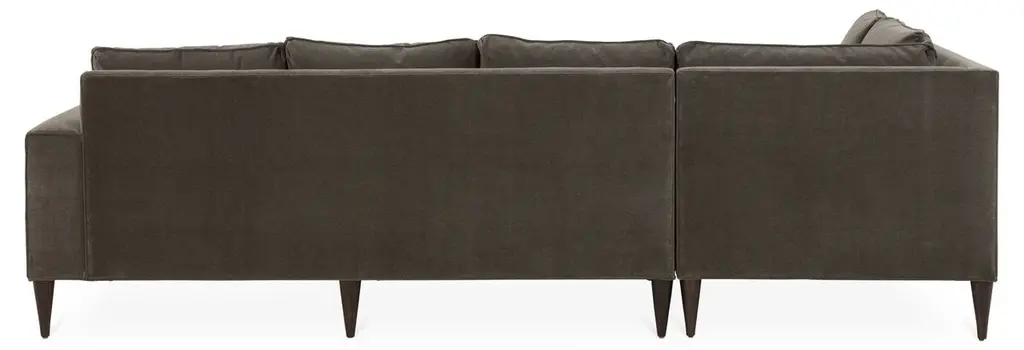 Designed by us and available only at One Kings Lane: This roomy sectional is constructed with a sturdy alder frame, luxe velvet upholstery, and a generous fill that ensures long-lasting comfort. Its rich indigo hue makes it exceptionally versatile, contrasting beautifully with the finish of the exposed tapered legs. We love how this piece manages to feel sophisticated and contemporary while also being open and inviting. Handcrafted in the USA.